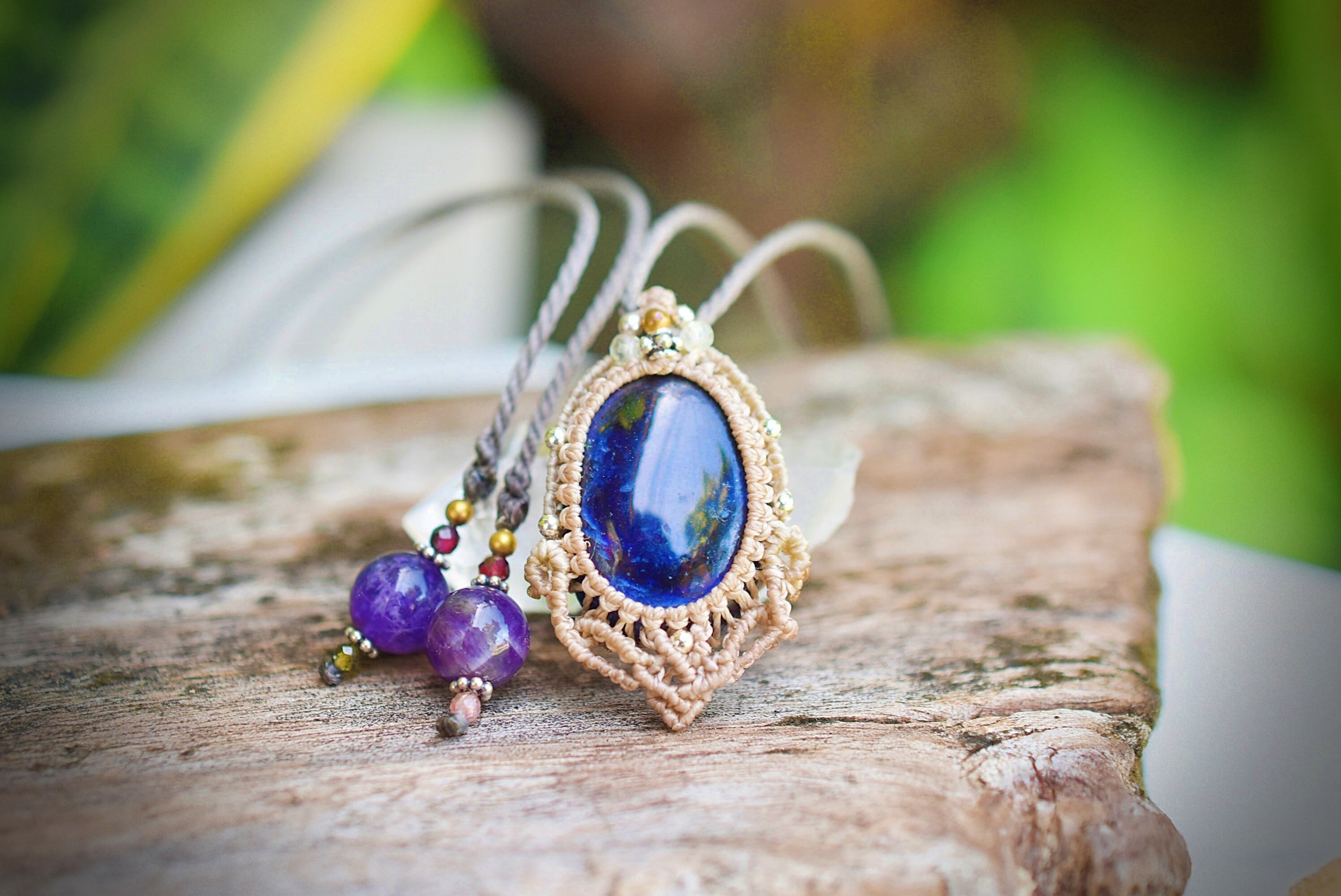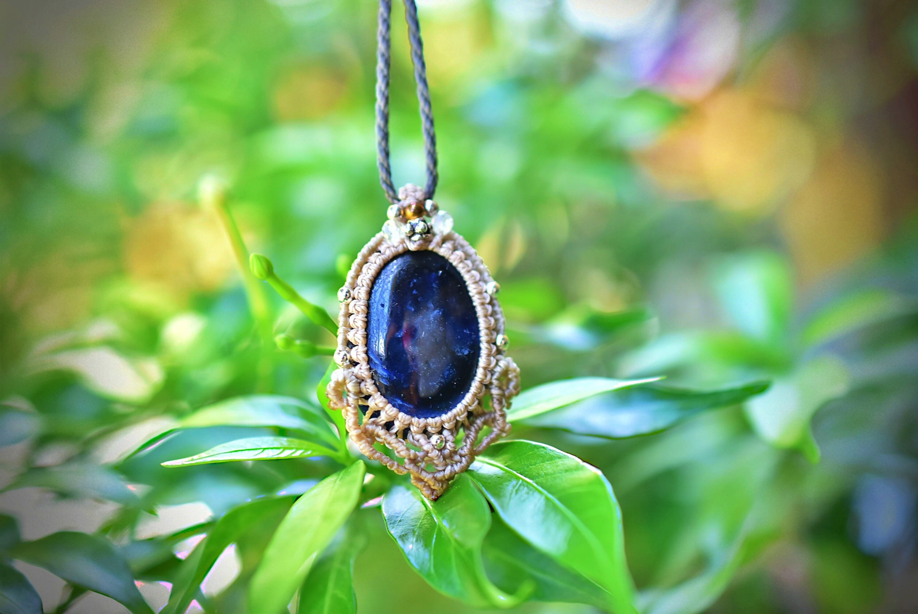 ◆このたびはキナリ、ヘンプ、ダブグレイ色の蝋引き糸を使用しマクラメ編み装飾を施しました。