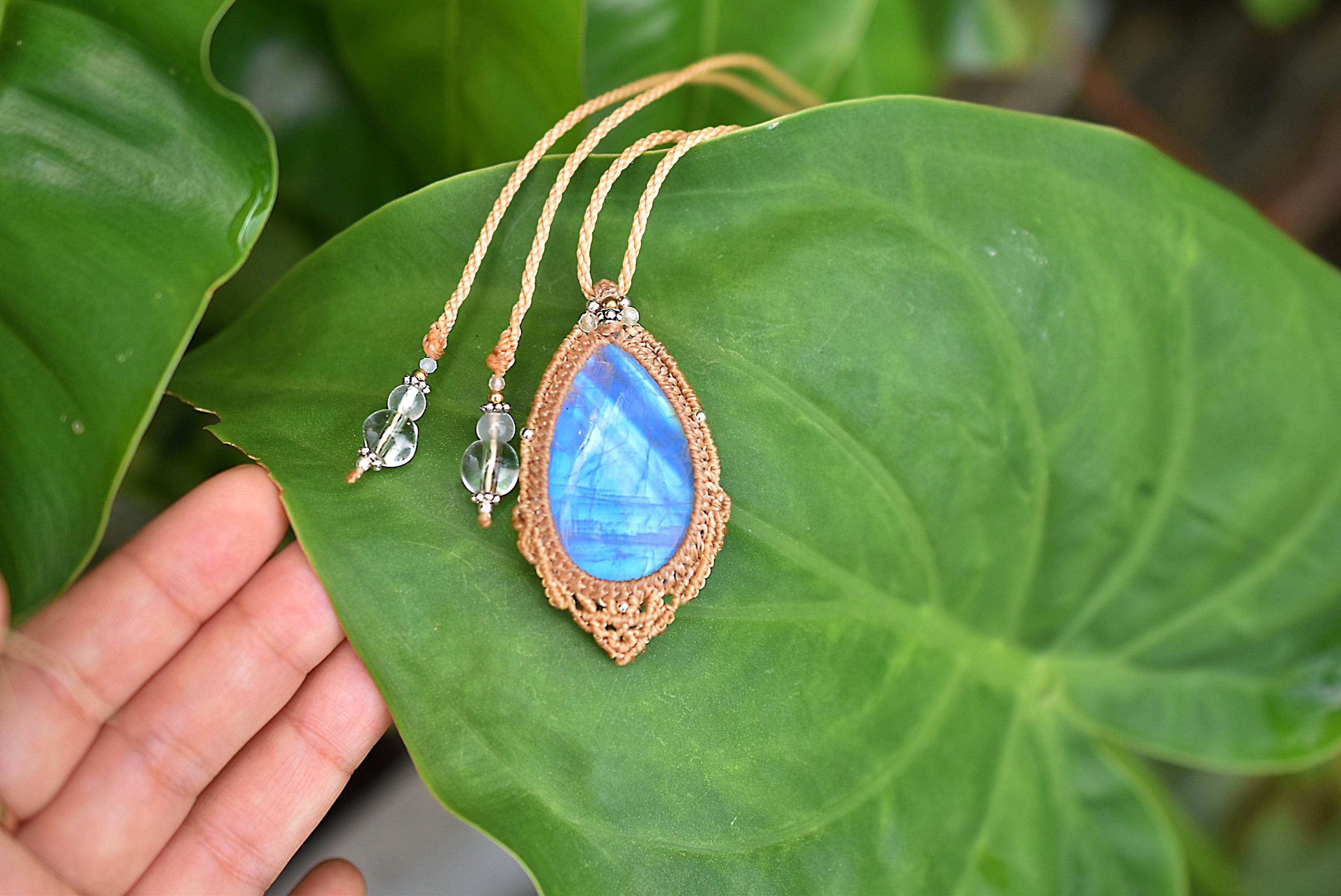 石をメインに細い糸と太い糸をミックスしてマクラメ編み装飾。