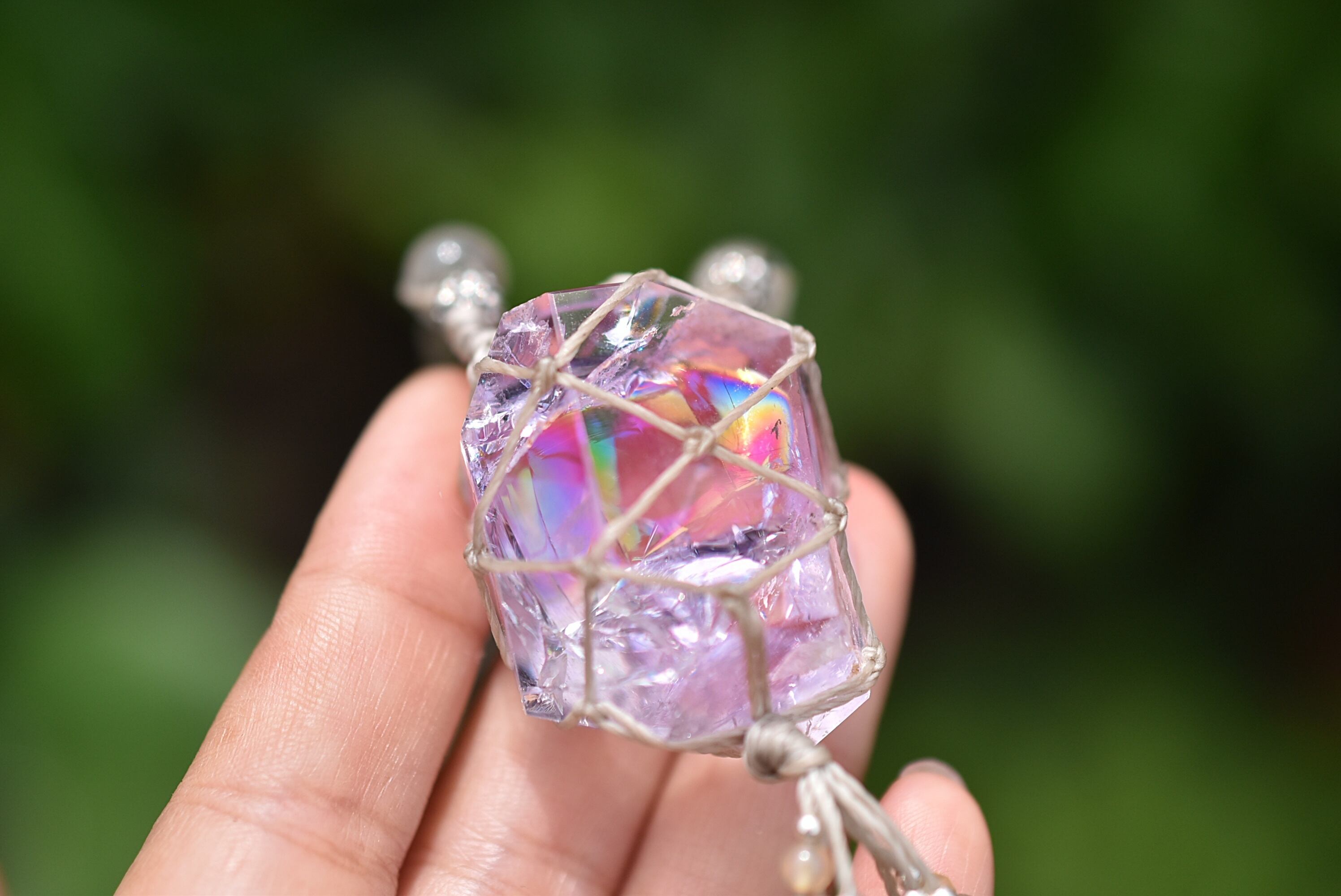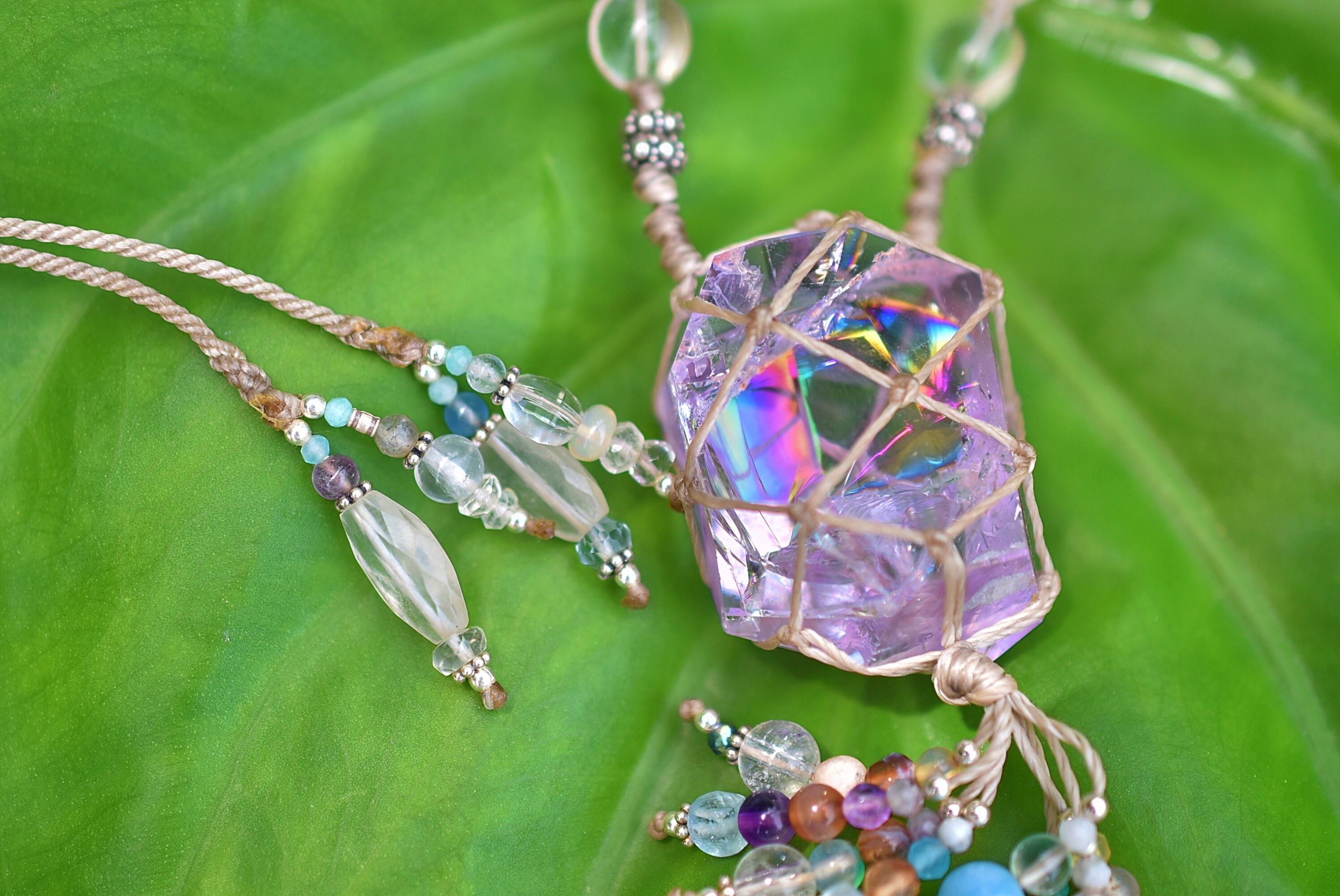 大きな虹がしっかりと見てとれるクリアなアメシスト原石