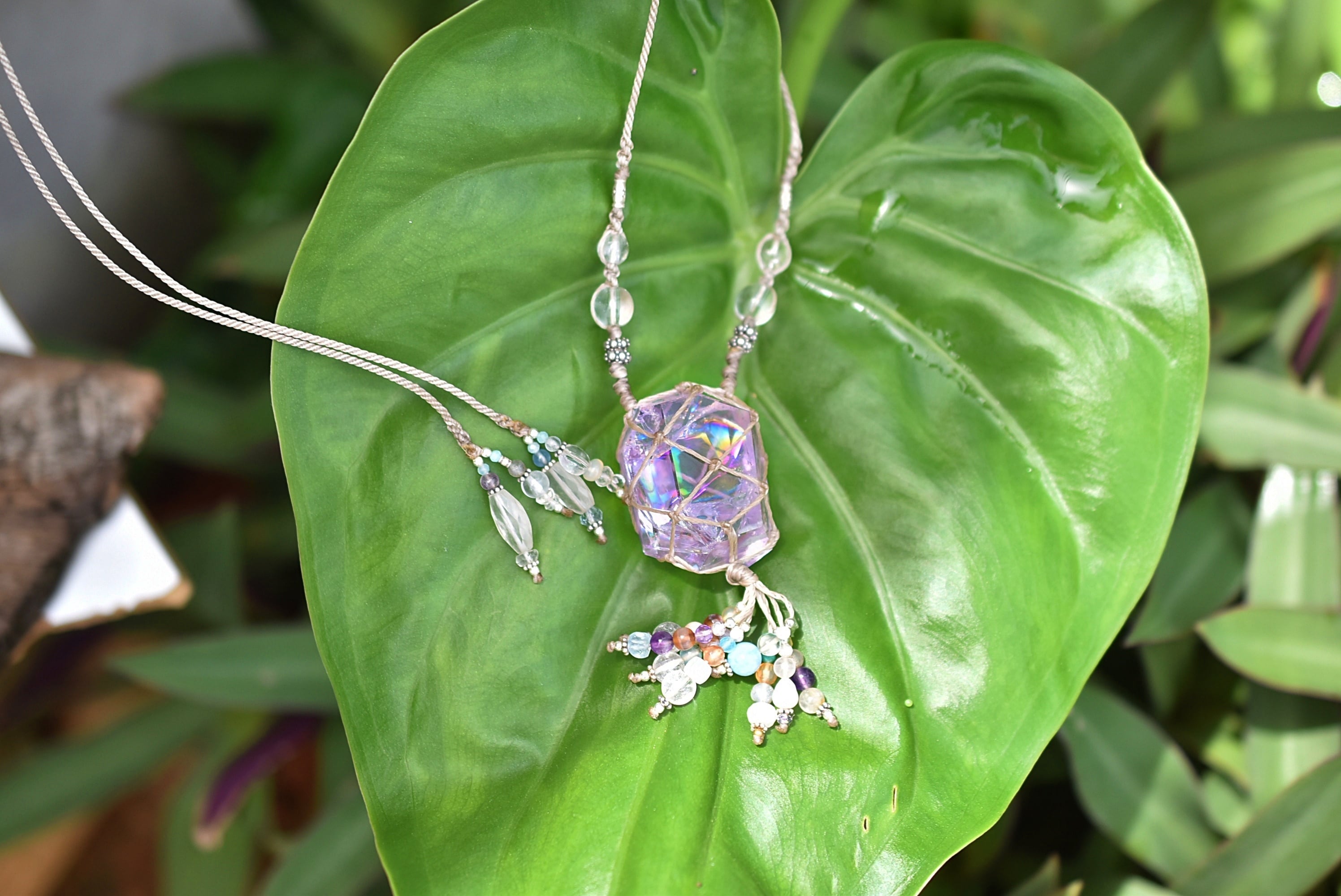 ◆このたびはヘンプ色の蝋引き糸を使用しマクラメ編み装飾を施しました。