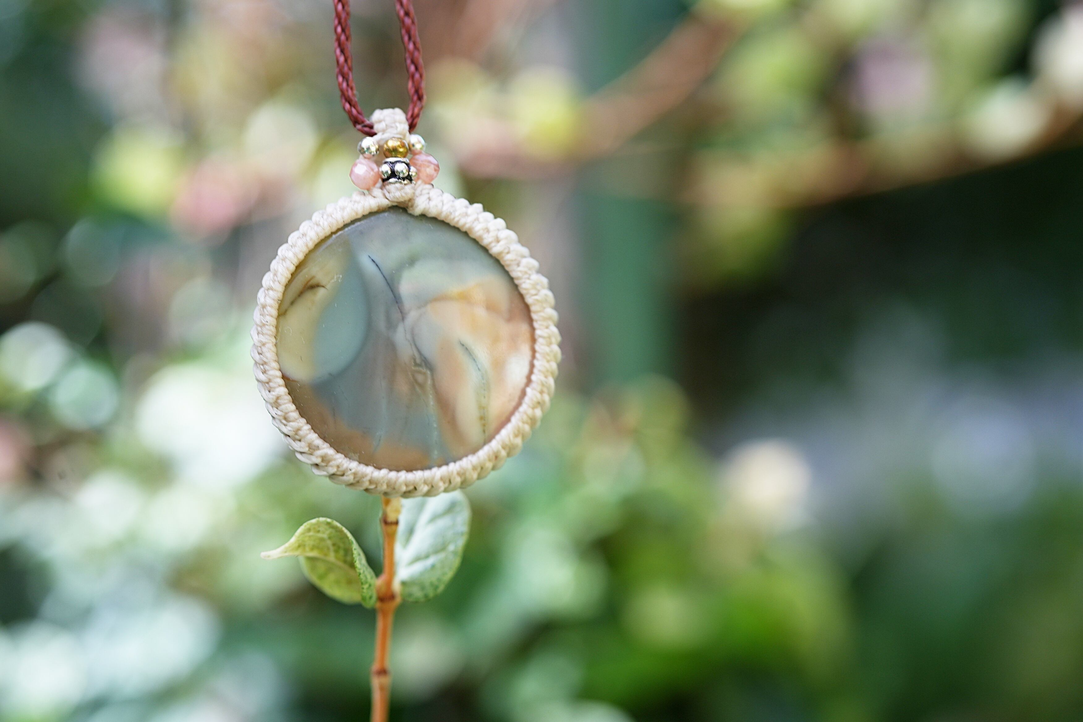 ◆このたびはキナリ、サンセット色の蝋引き糸を使用しマクラメ編み装飾を施しました。