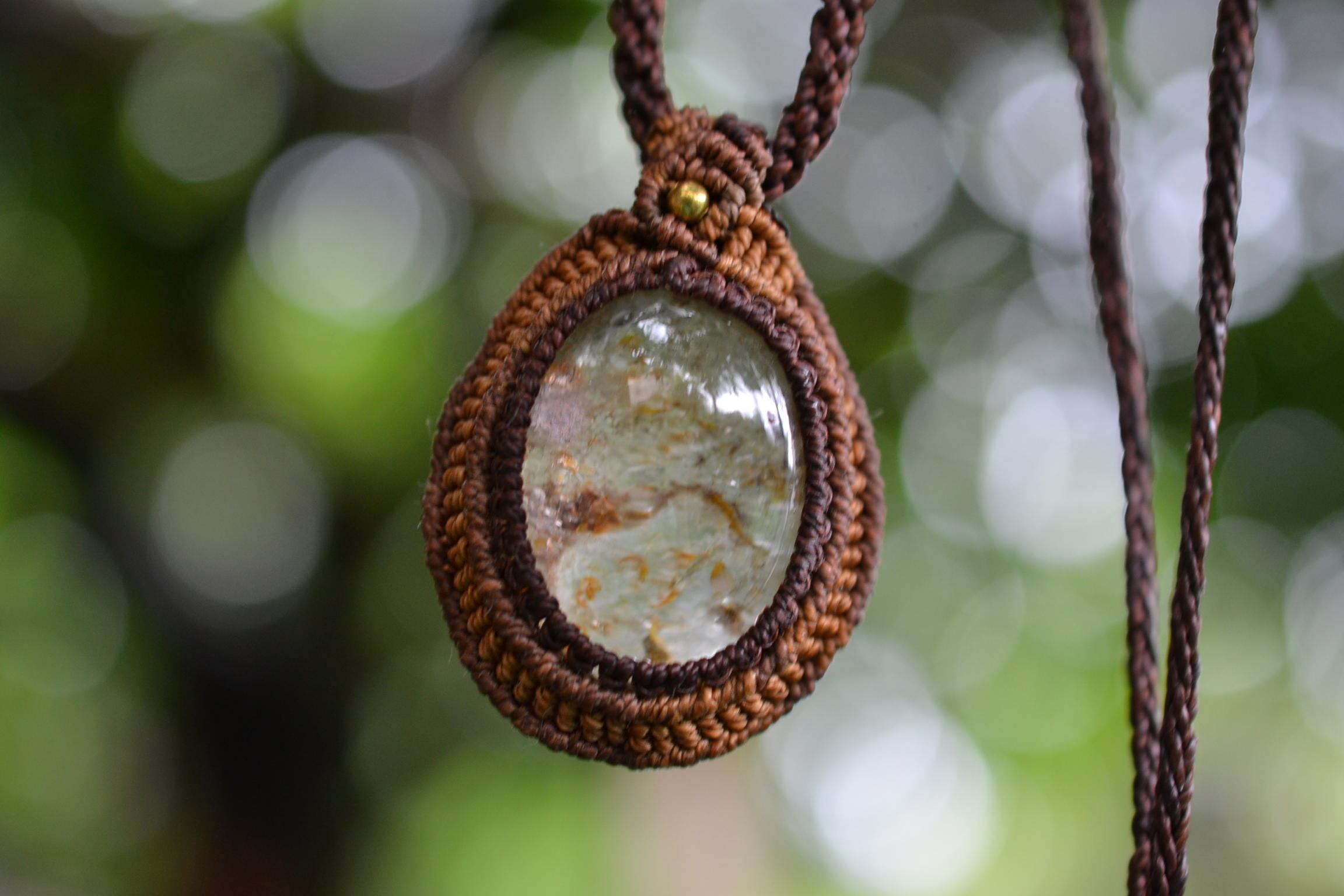 愛らしいガーデンクォーツを大切に囲み編みでマクラメ編み装飾を施し、アンティーク調なペンダントに仕上げました。