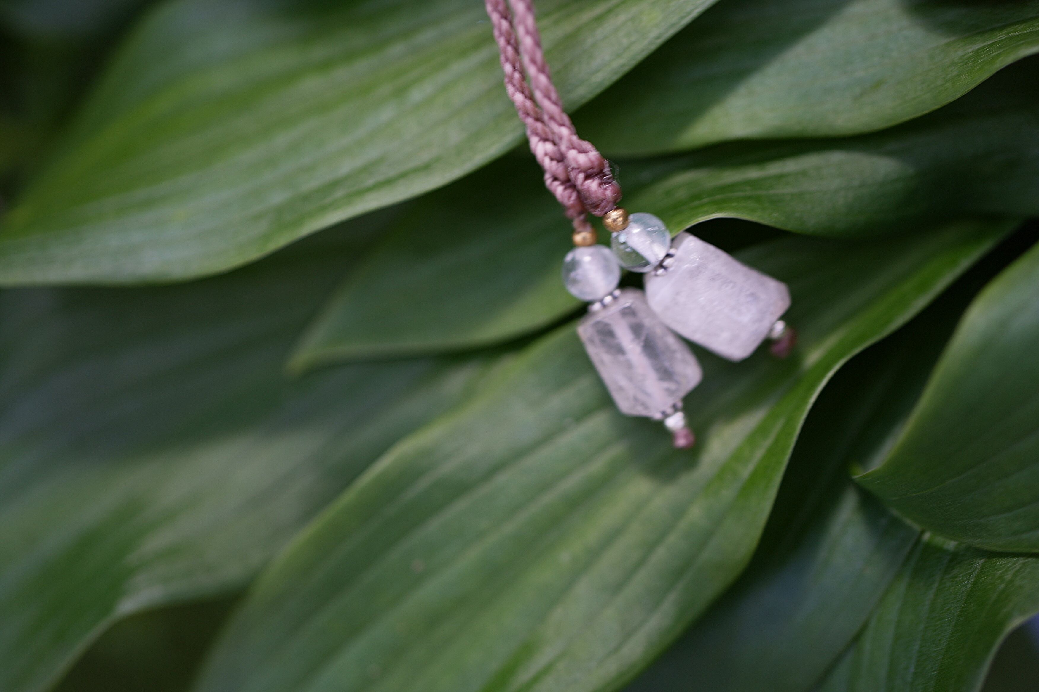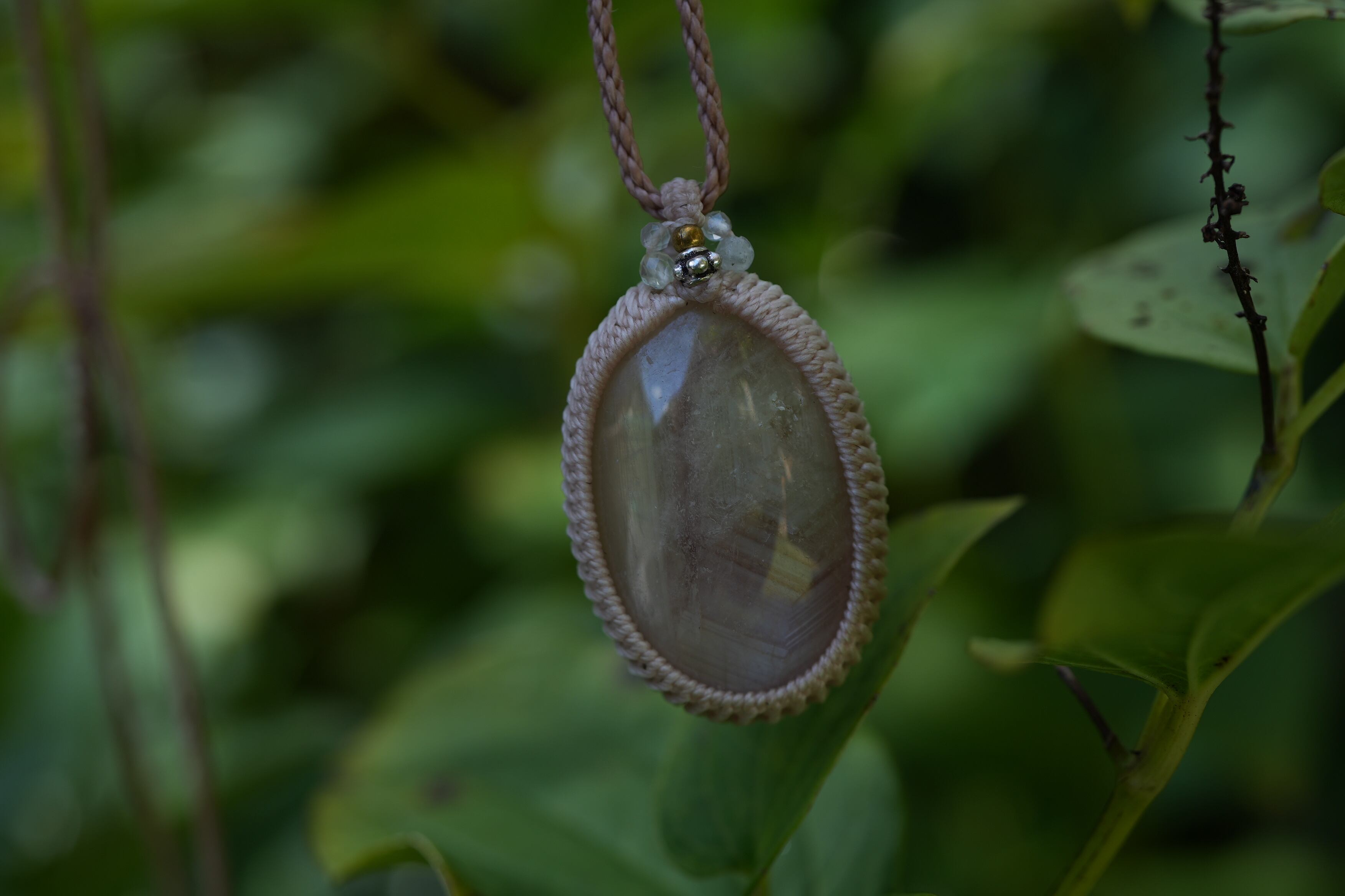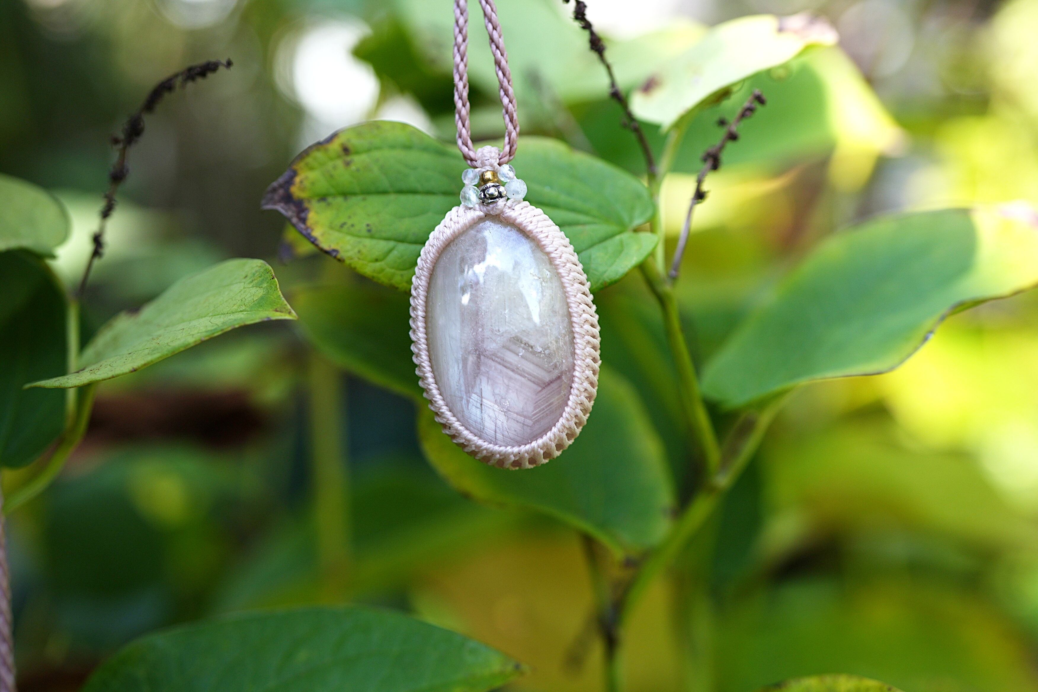 ◆このたびはナチュラルホワイト、ミルクココア色の蝋引き糸を使用しマクラメ編み装飾を施しました。