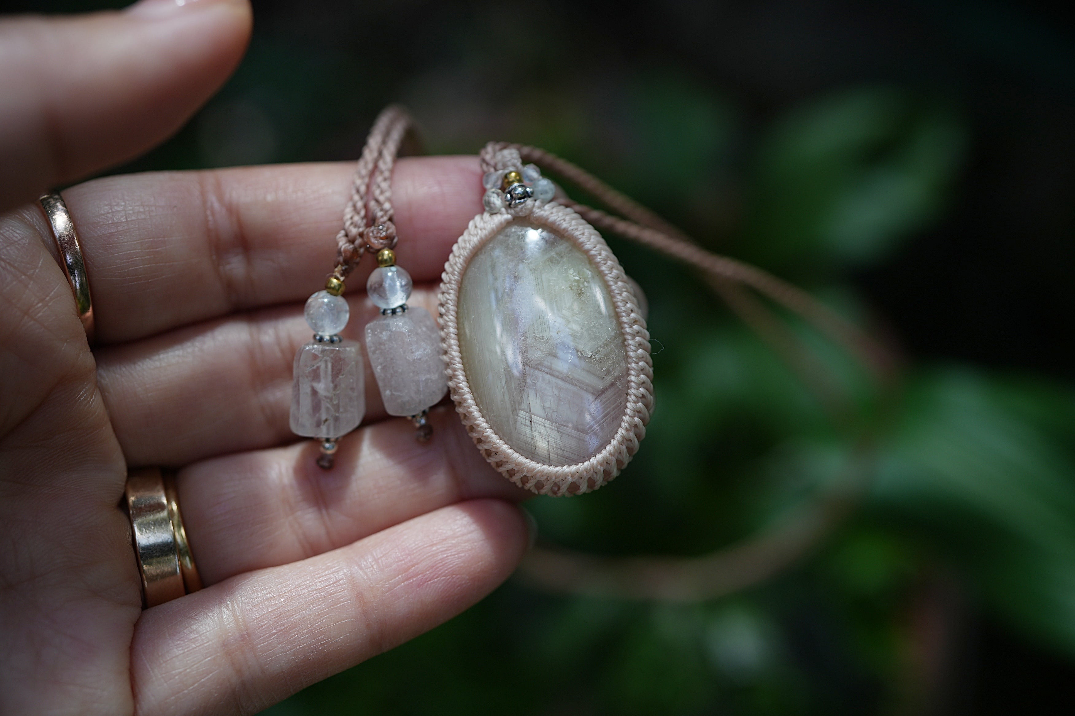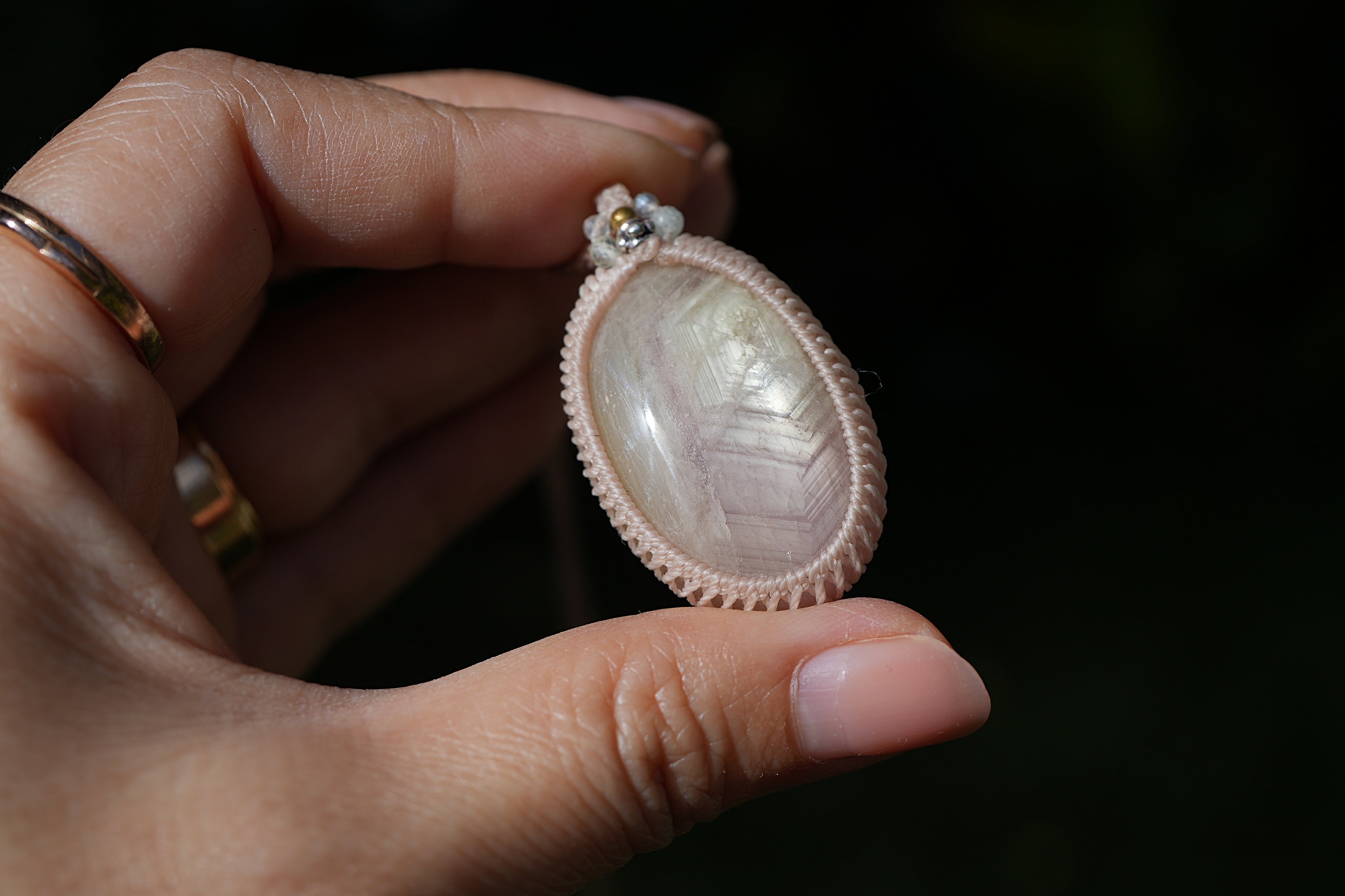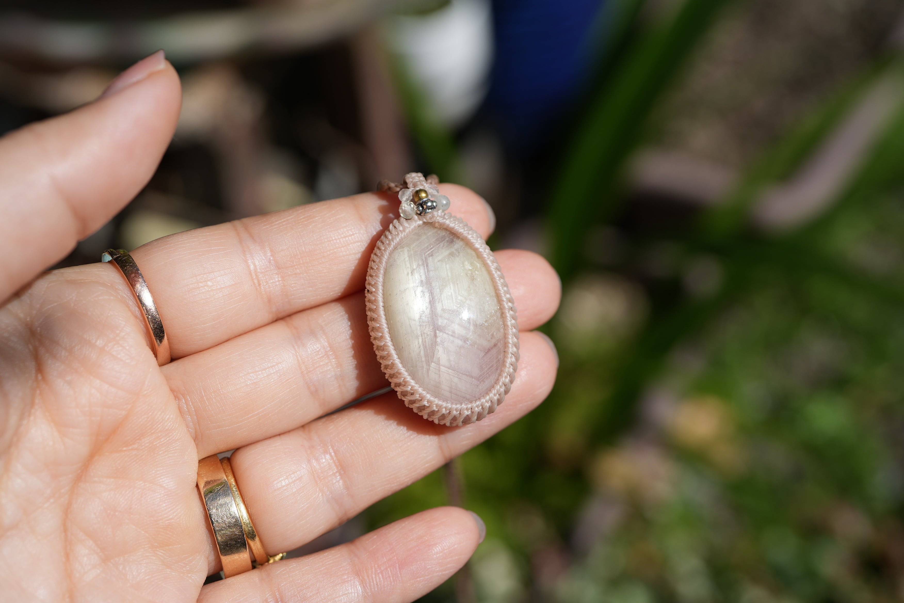 ◆このたびはナチュラルホワイト、ミルクココア色の蝋引き糸を使用しマクラメ編み装飾を施しました。