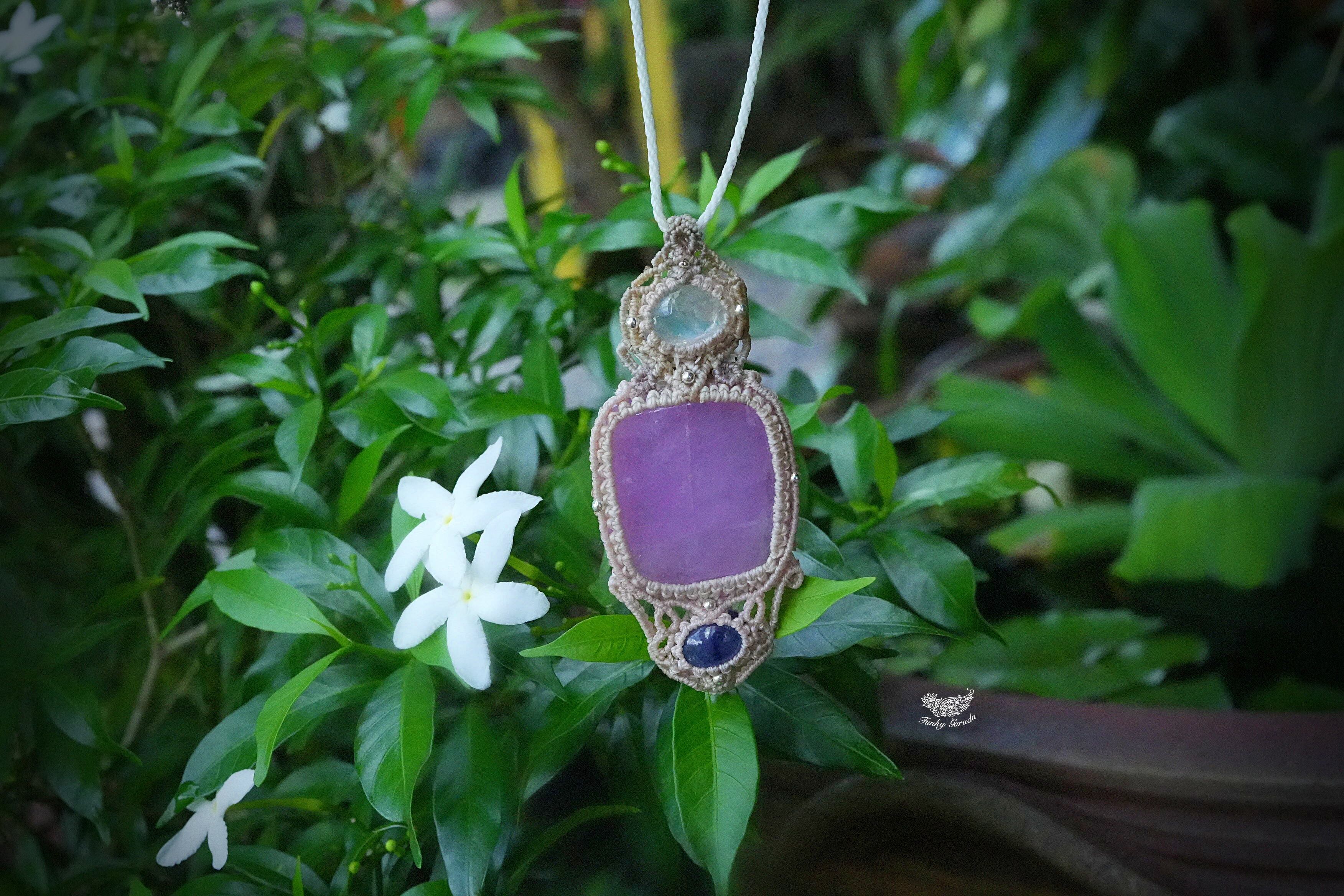 ◆このたびはナチュラルホワイト、ヘンプ、キナリ色の蝋引き糸を使用しマクラメ編み装飾を施しました。