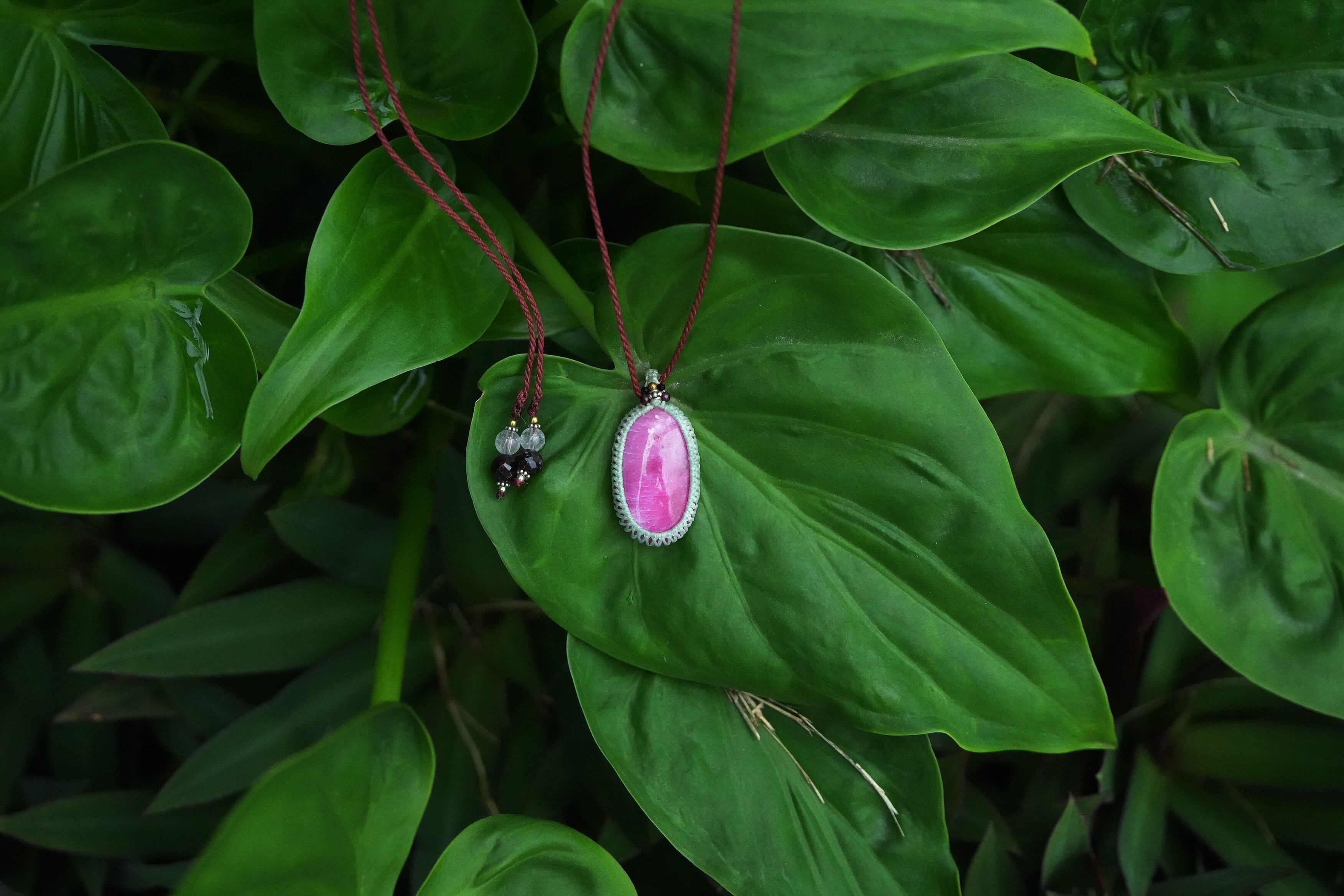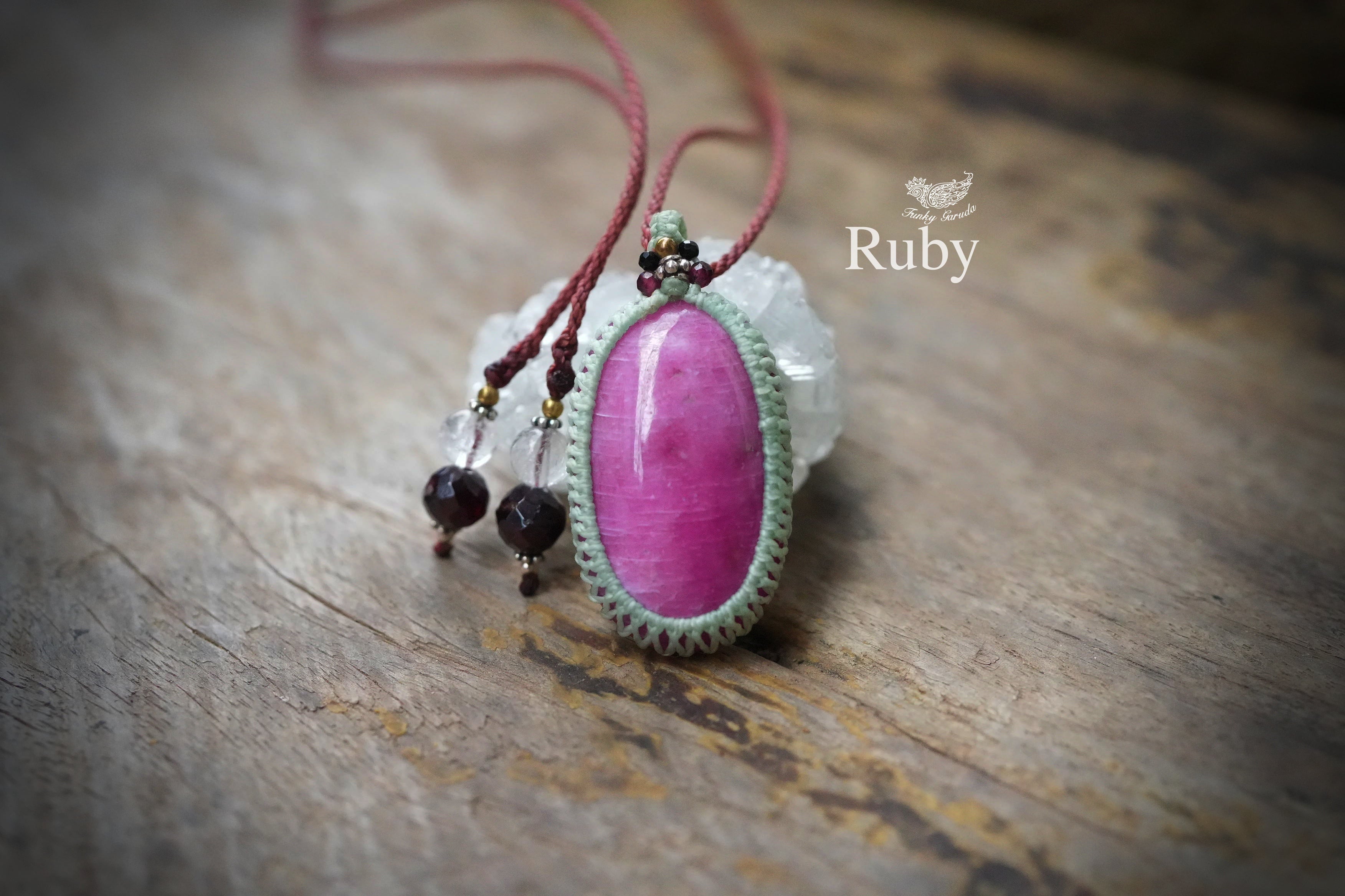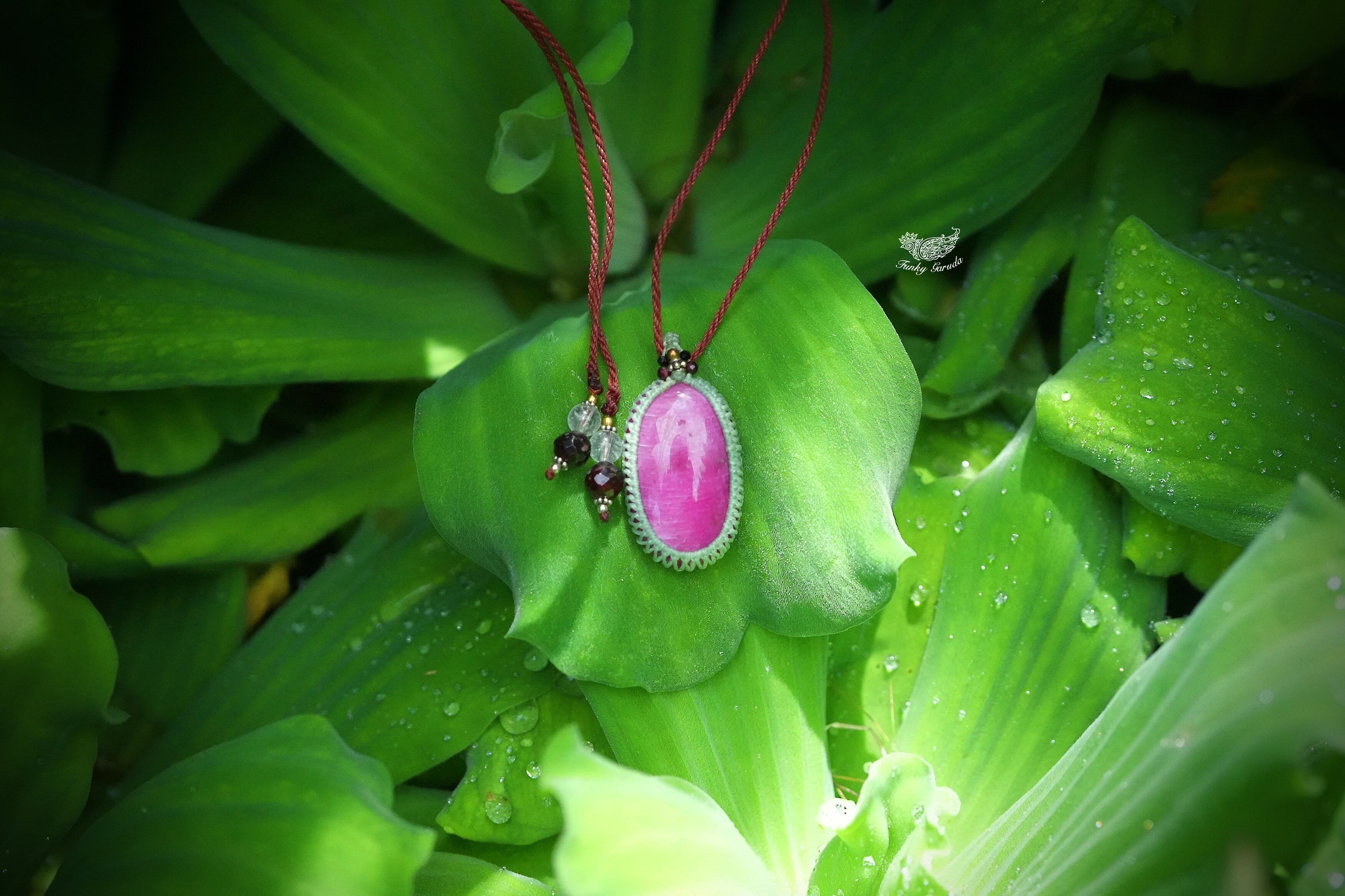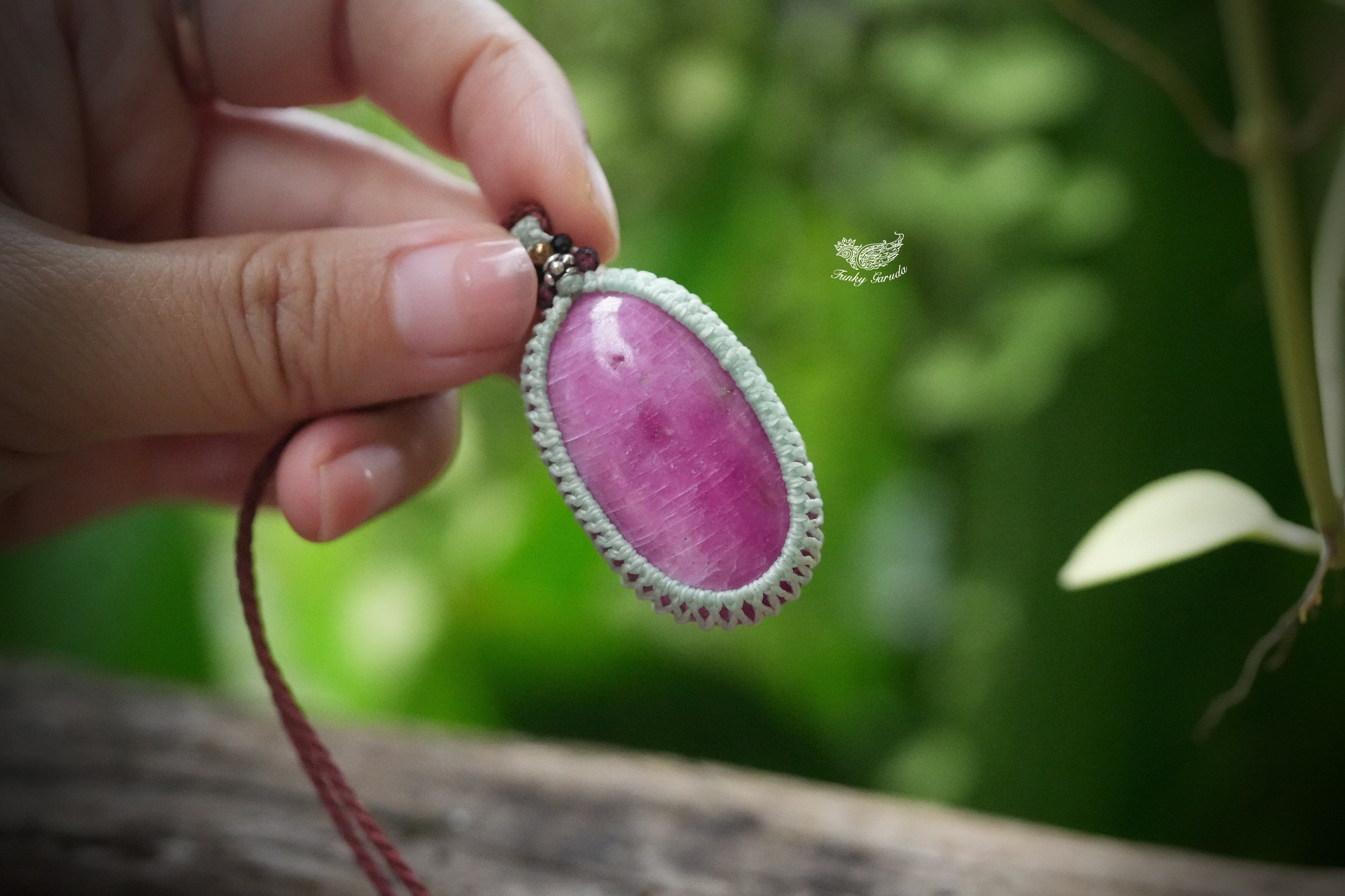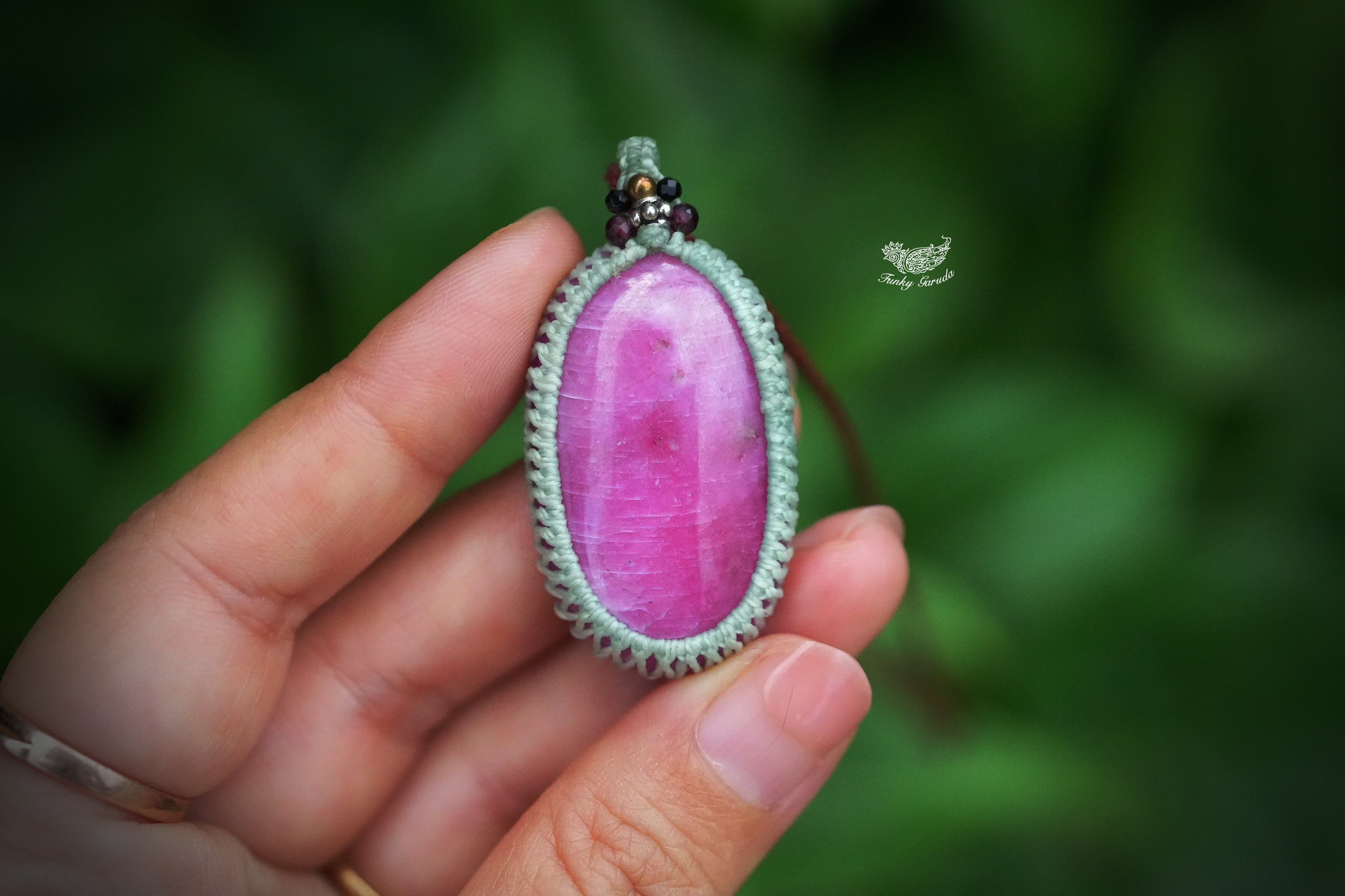 ◆このたびは、ミント、レッド色の蝋引き糸を使用しマクラメ編み装飾を施しました。
