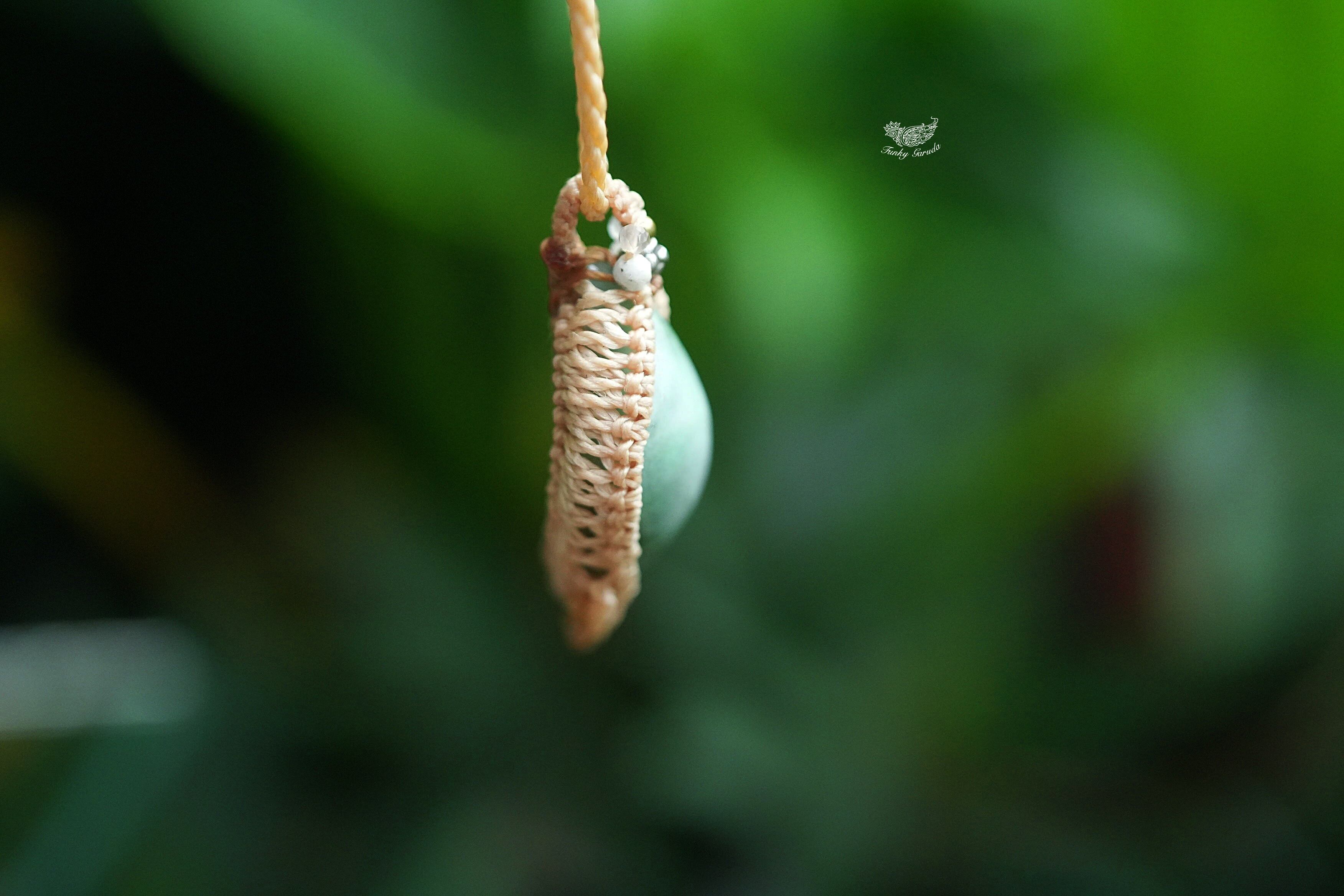 ◆このたびはキャラメル色の蝋引き糸を使用しマクラメ編み装飾を施しました。