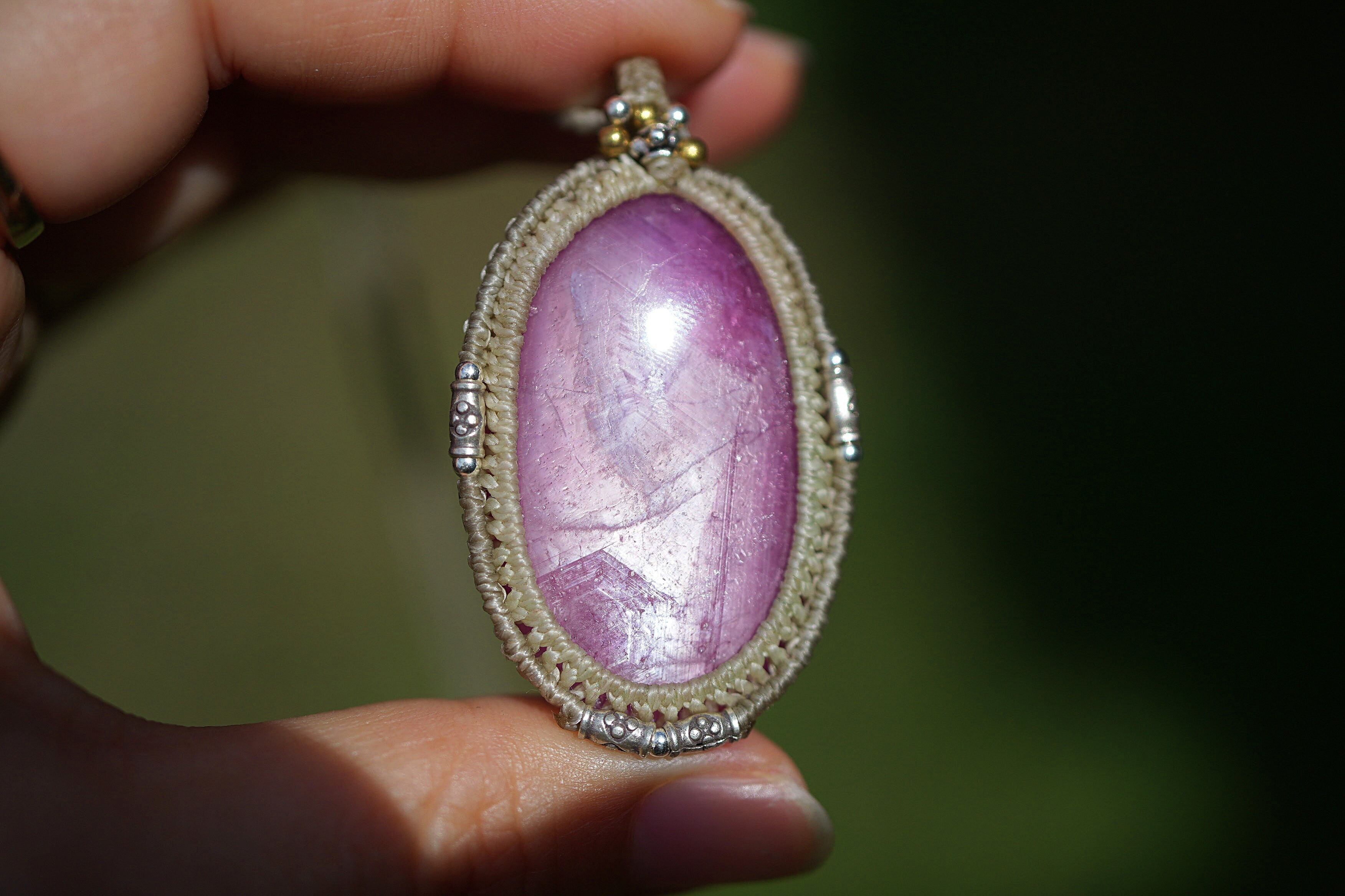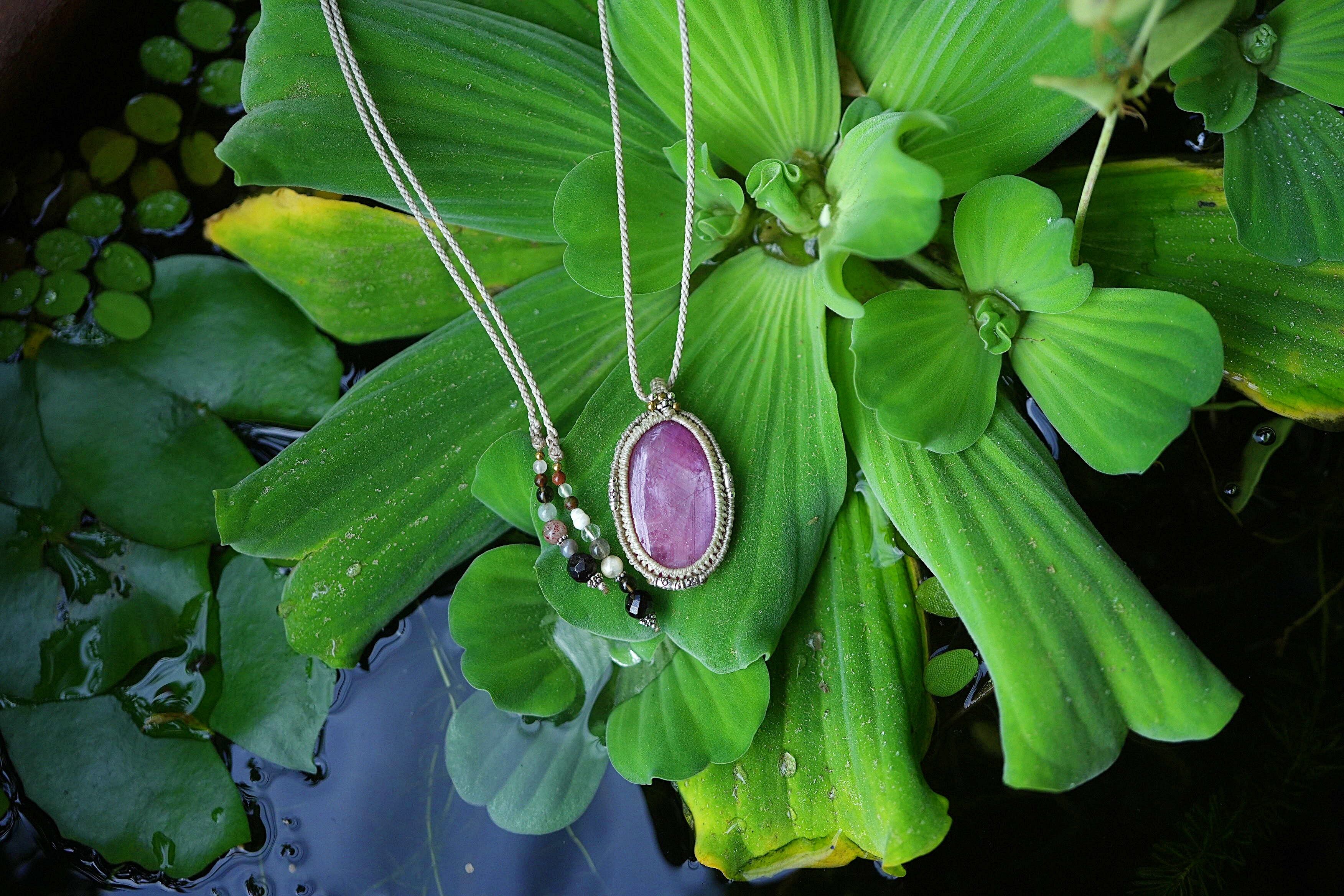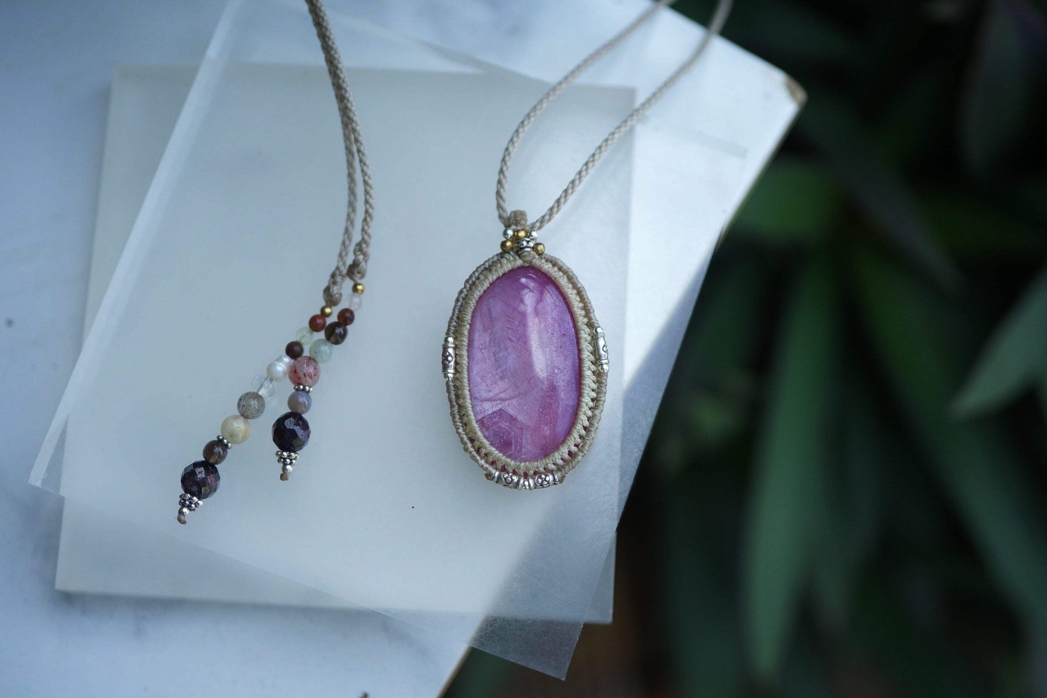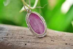◆このたびはキナリ、ナチュラルホワイト色の蝋引き糸を使用しマクラメ編み装飾を施しました。