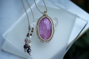 紐の先にはたくさんの天然石ビーズをあしらっています。