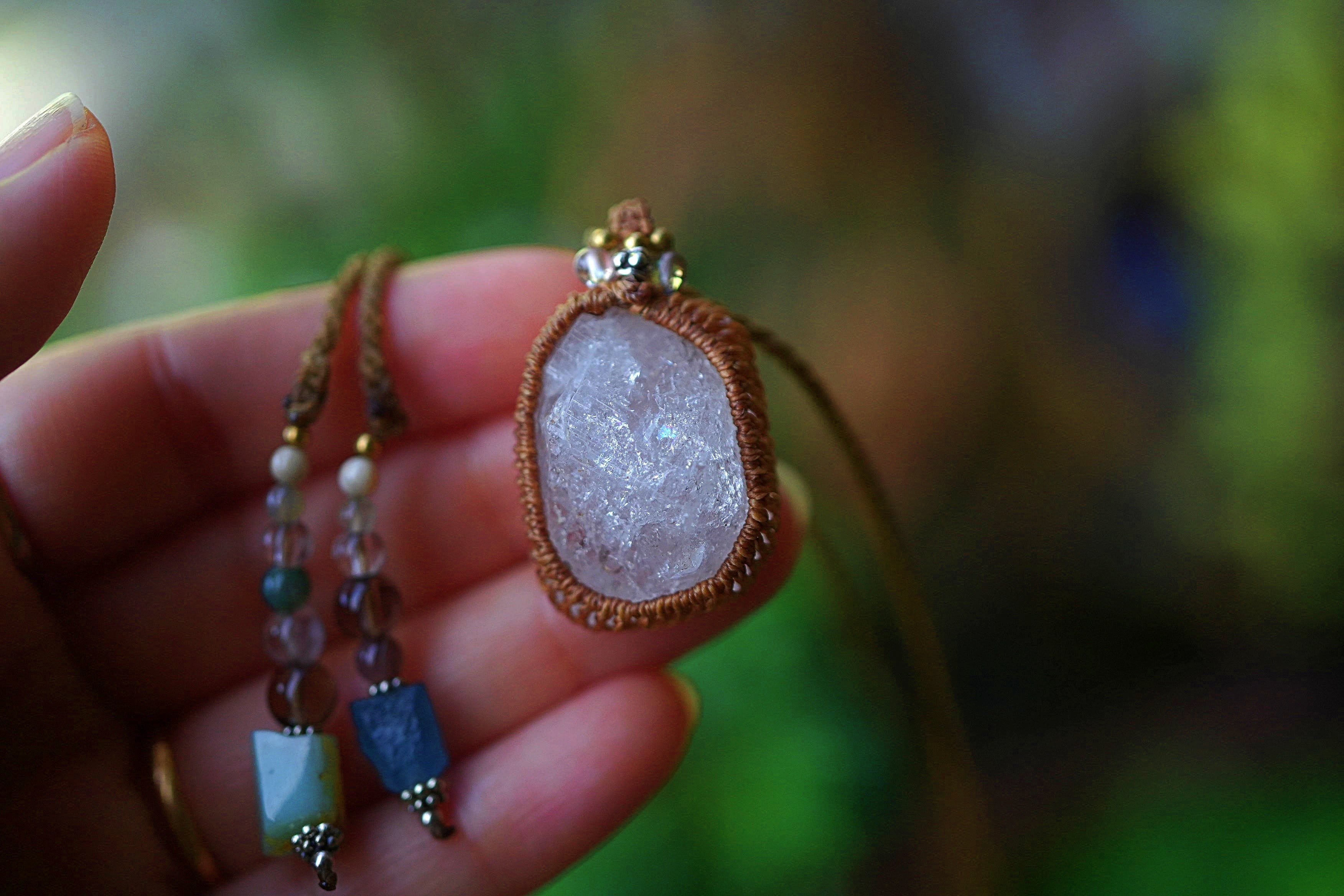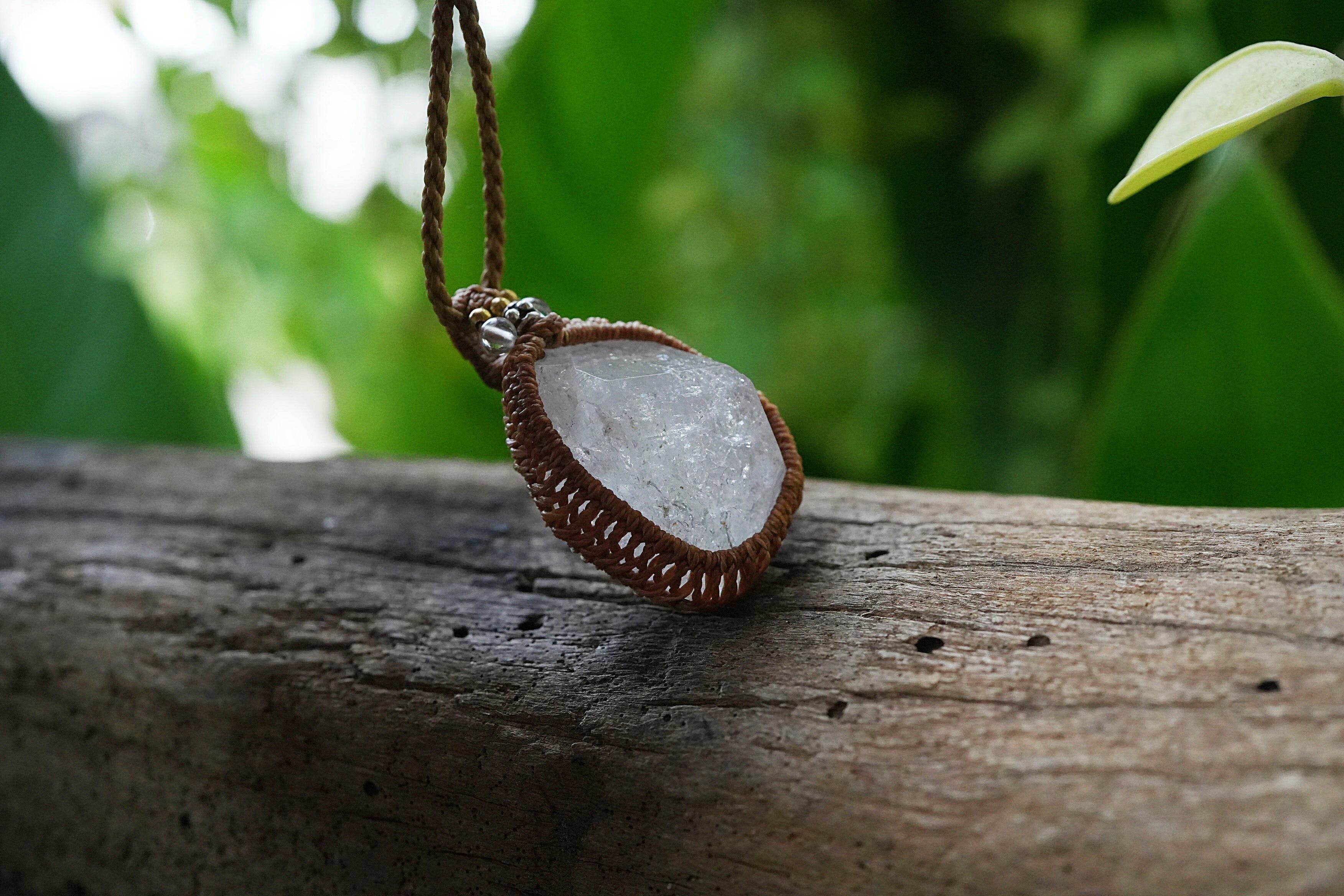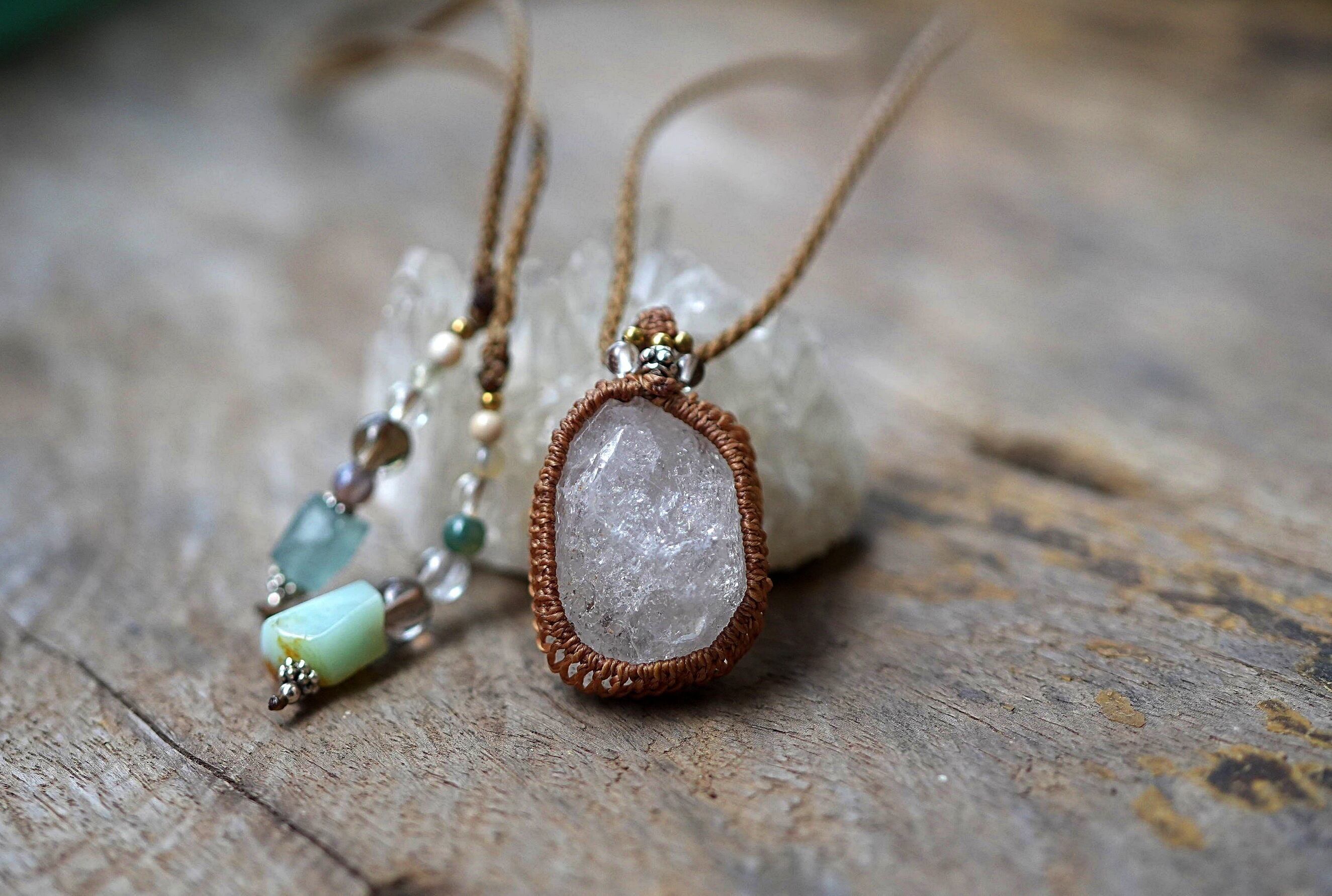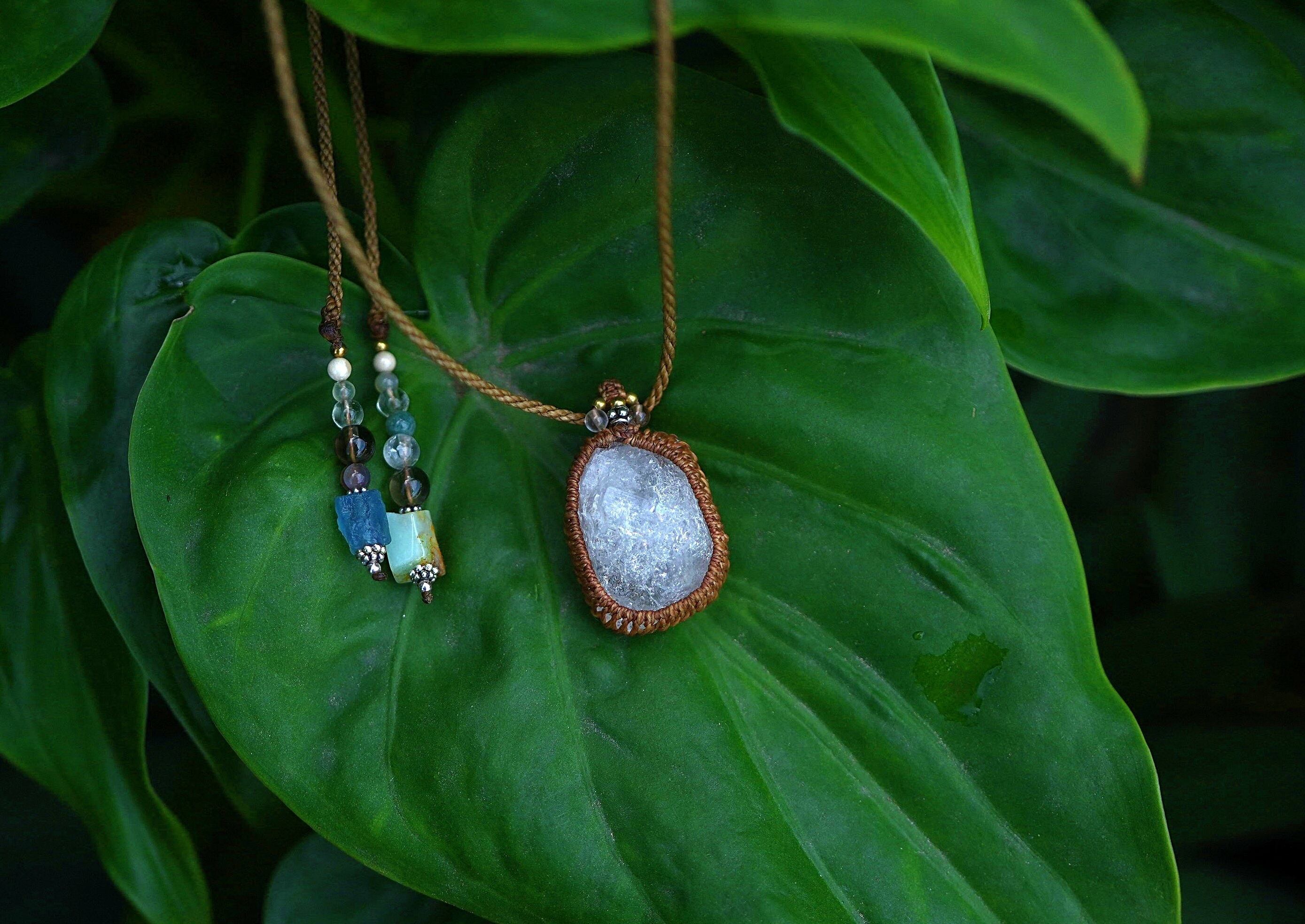 原石そのままをマクラメ編みペンダントとして囲んでいますが