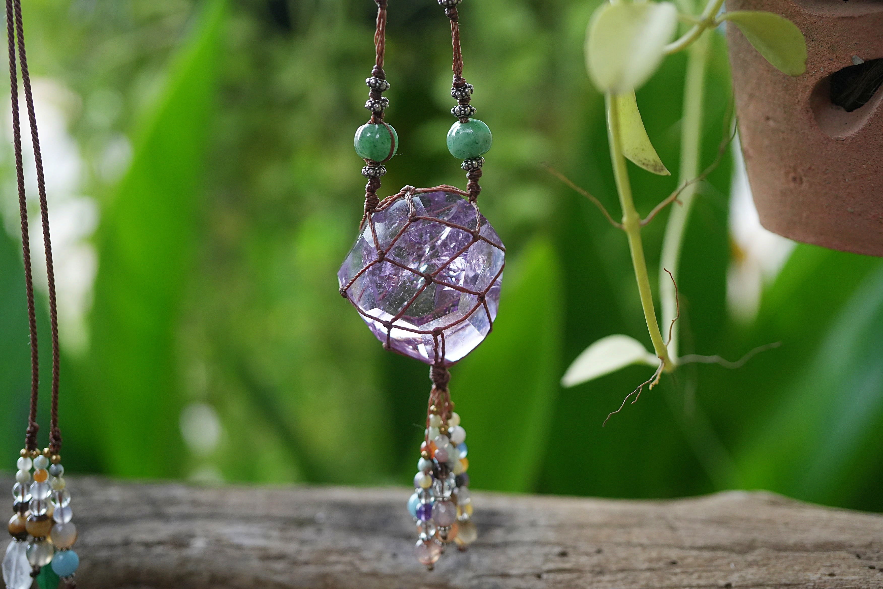 ◆このたびはゴールドブラウン色の蝋引き糸を使用しマクラメ編み装飾を施しました。