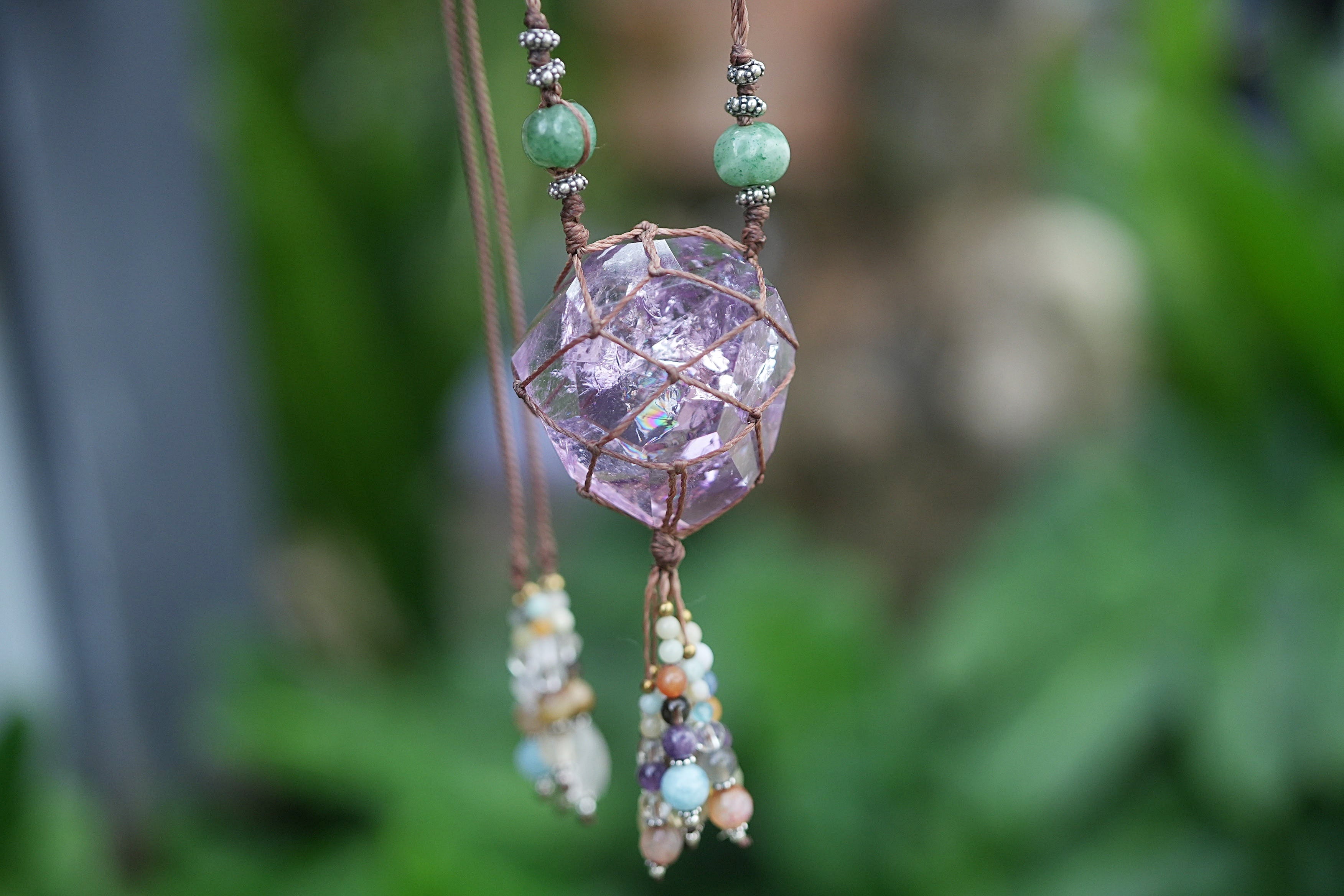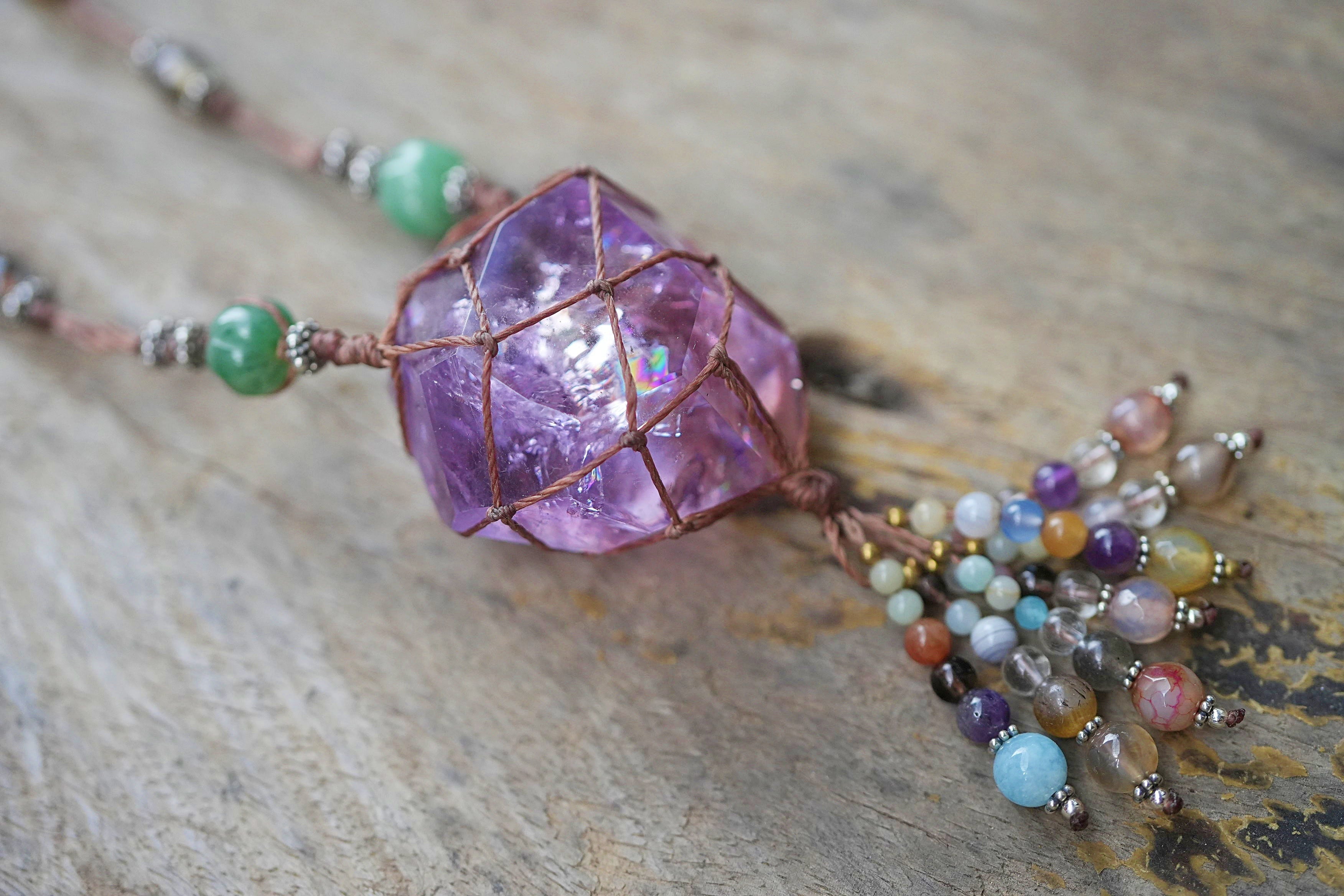 大きな虹がしっかりと見てとれるクリアなアメシスト原石