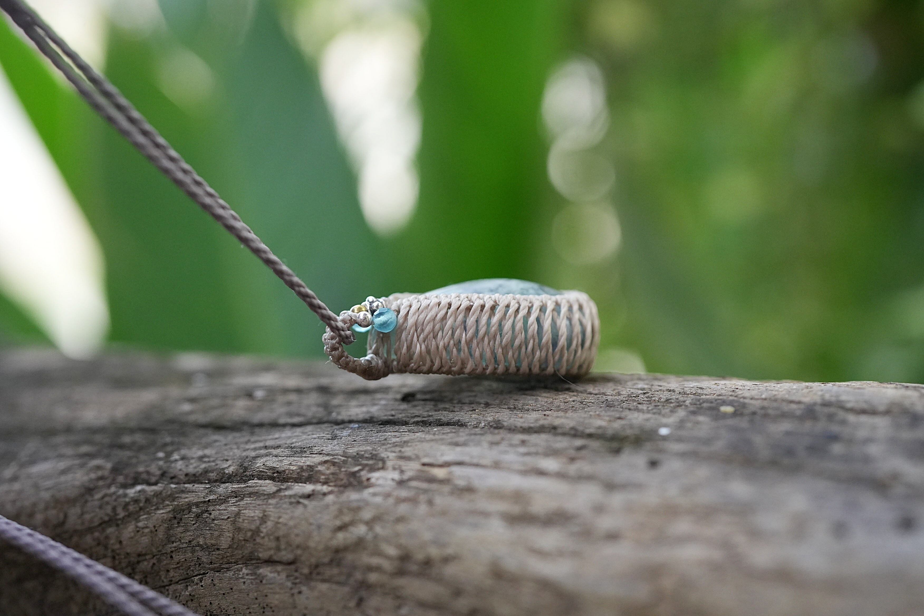 ◆このたびはキナリ、ダブグレイ色の蝋引き糸を使用しマクラメ編み装飾を施しました。