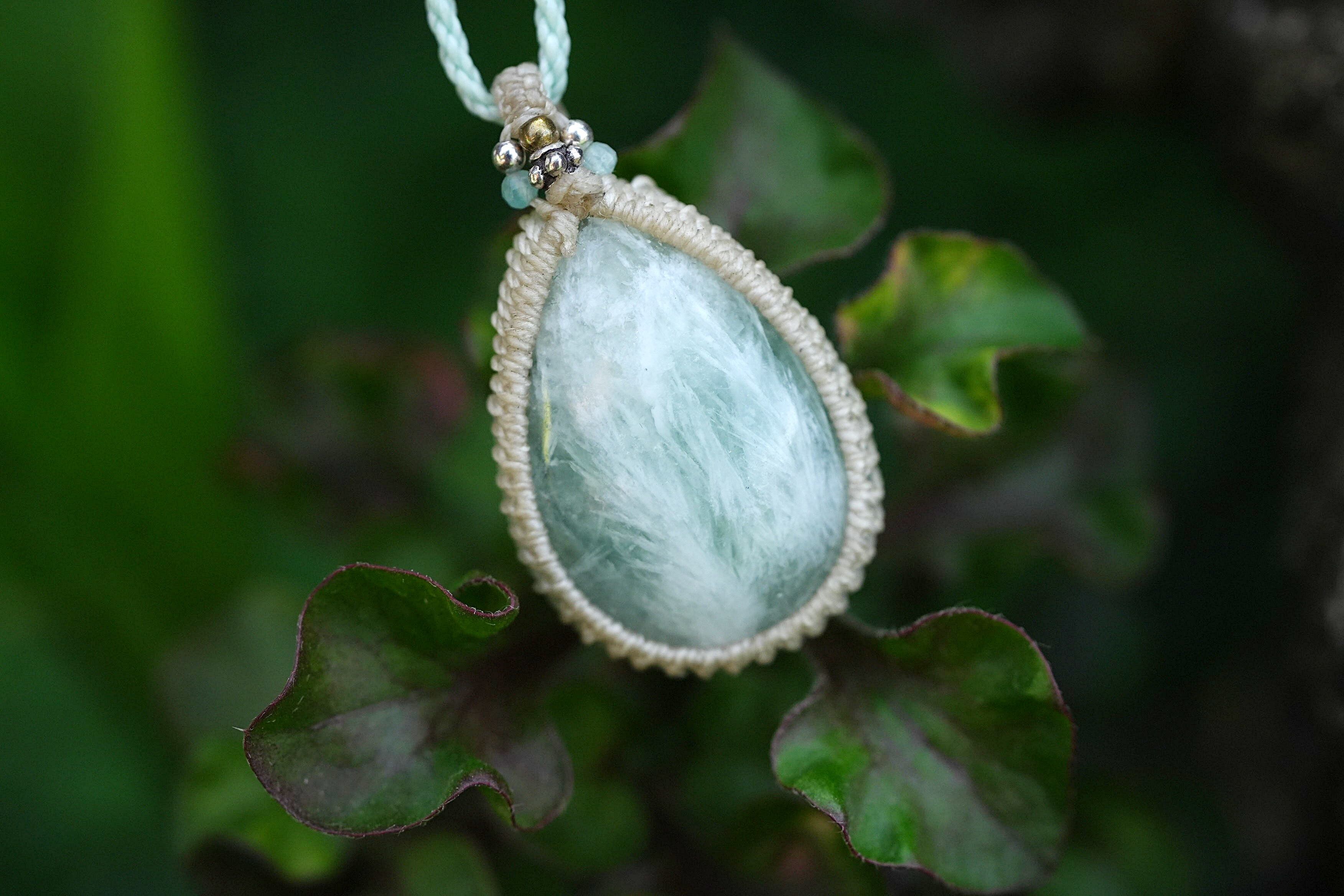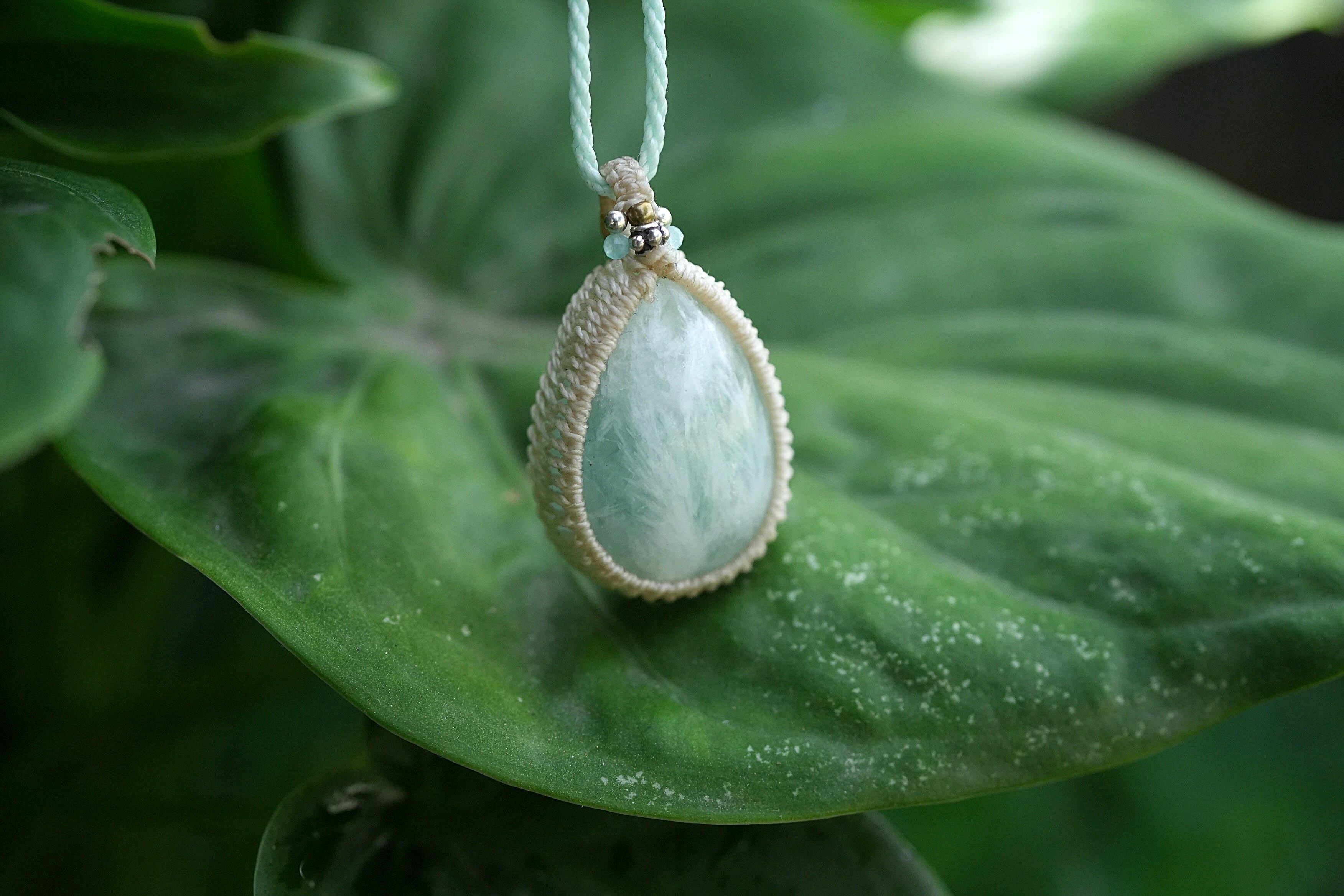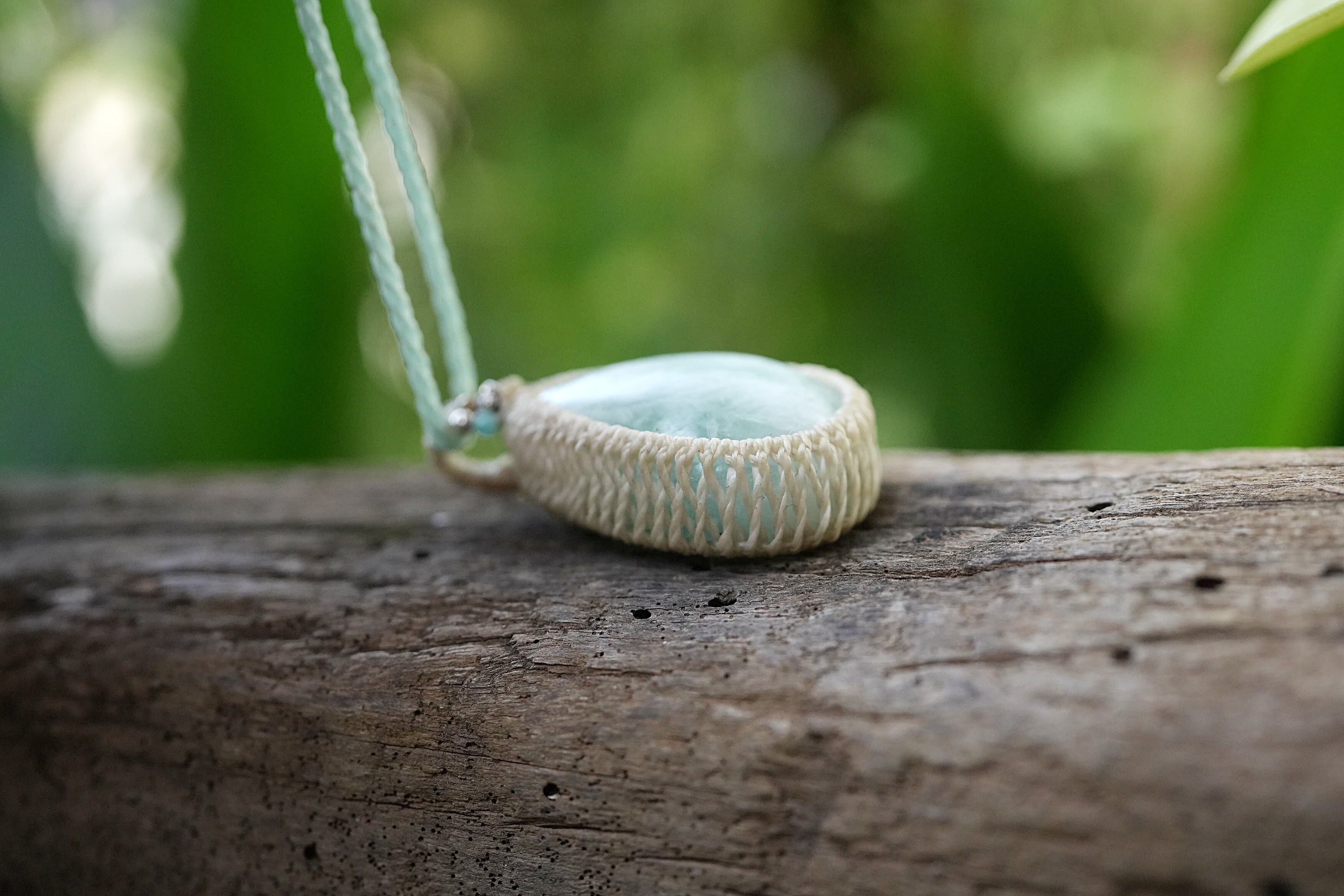 ◆このたびはナチュラルホワイト、ミント色の蝋引き糸を使用しマクラメ編み装飾を施しました。
