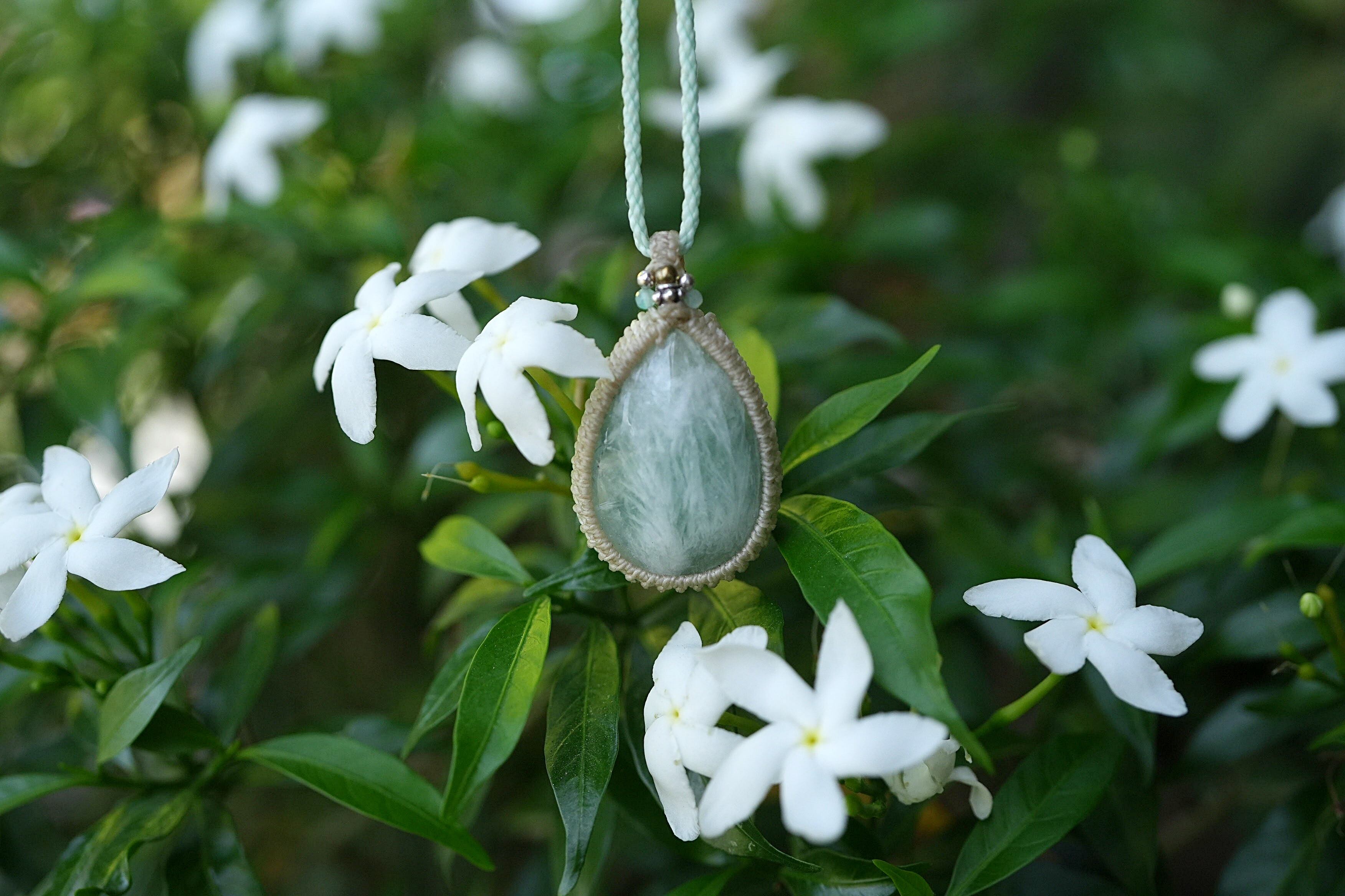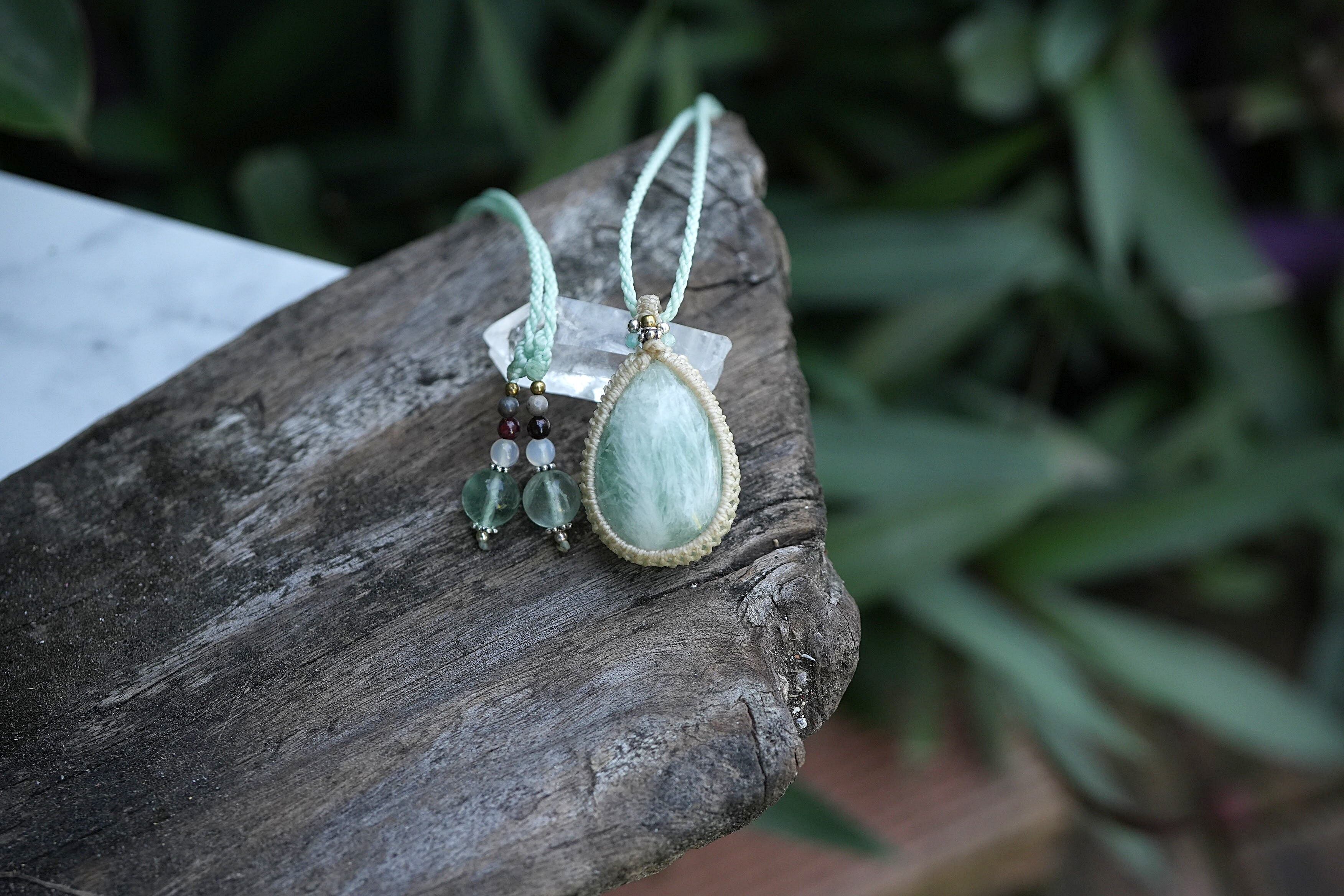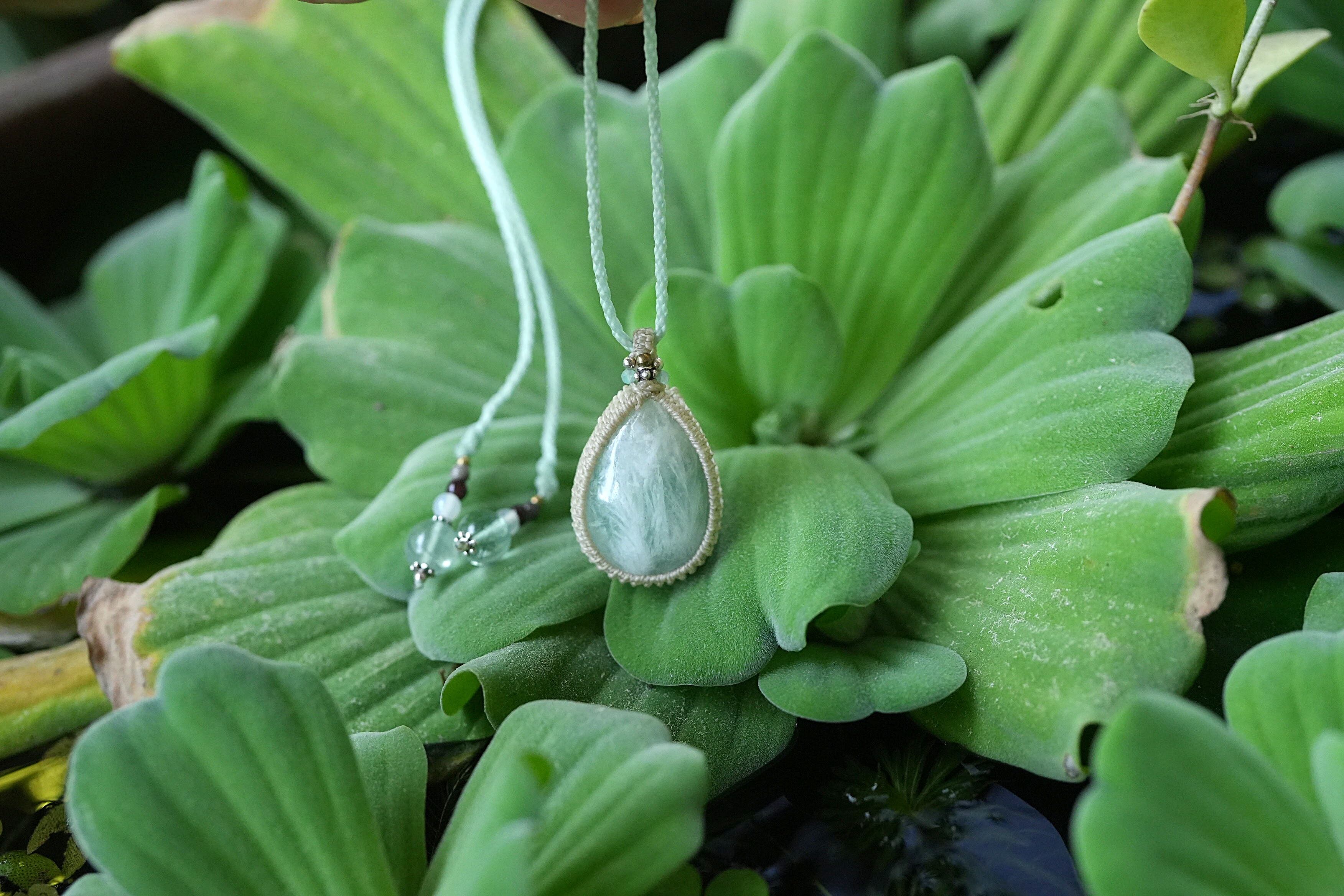 ◆このたびはナチュラルホワイト、ミント色の蝋引き糸を使用しマクラメ編み装飾を施しました。