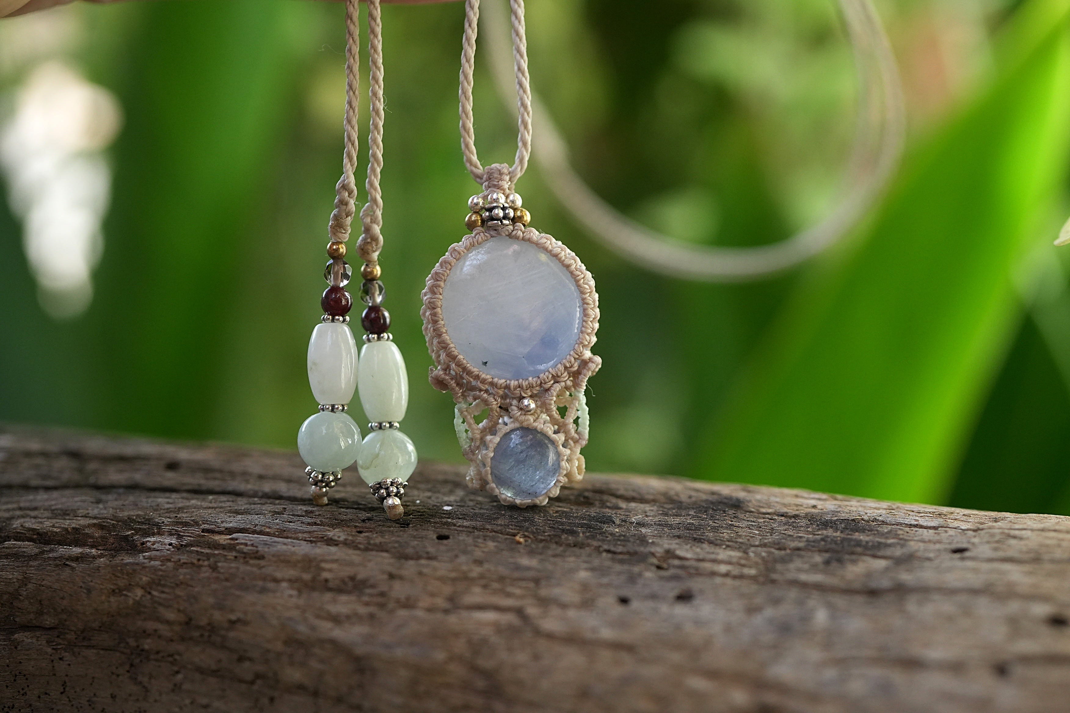 ◆このたびはキナリ、ミント、ナチュラルホワイト色の蝋引き糸を使用しマクラメ編み装飾を施しました。