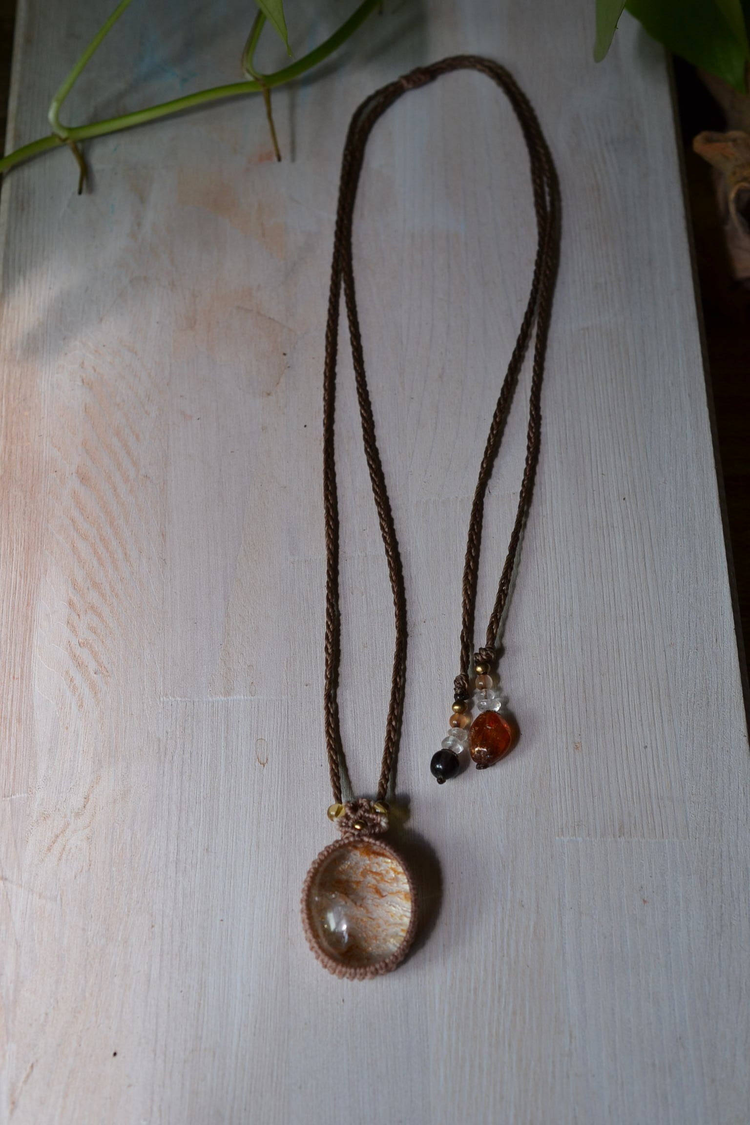 ◆このたびはセピアブラウン、ミルクココアの3色の蝋引き糸を使用しマクラメ編み装飾を施しました。