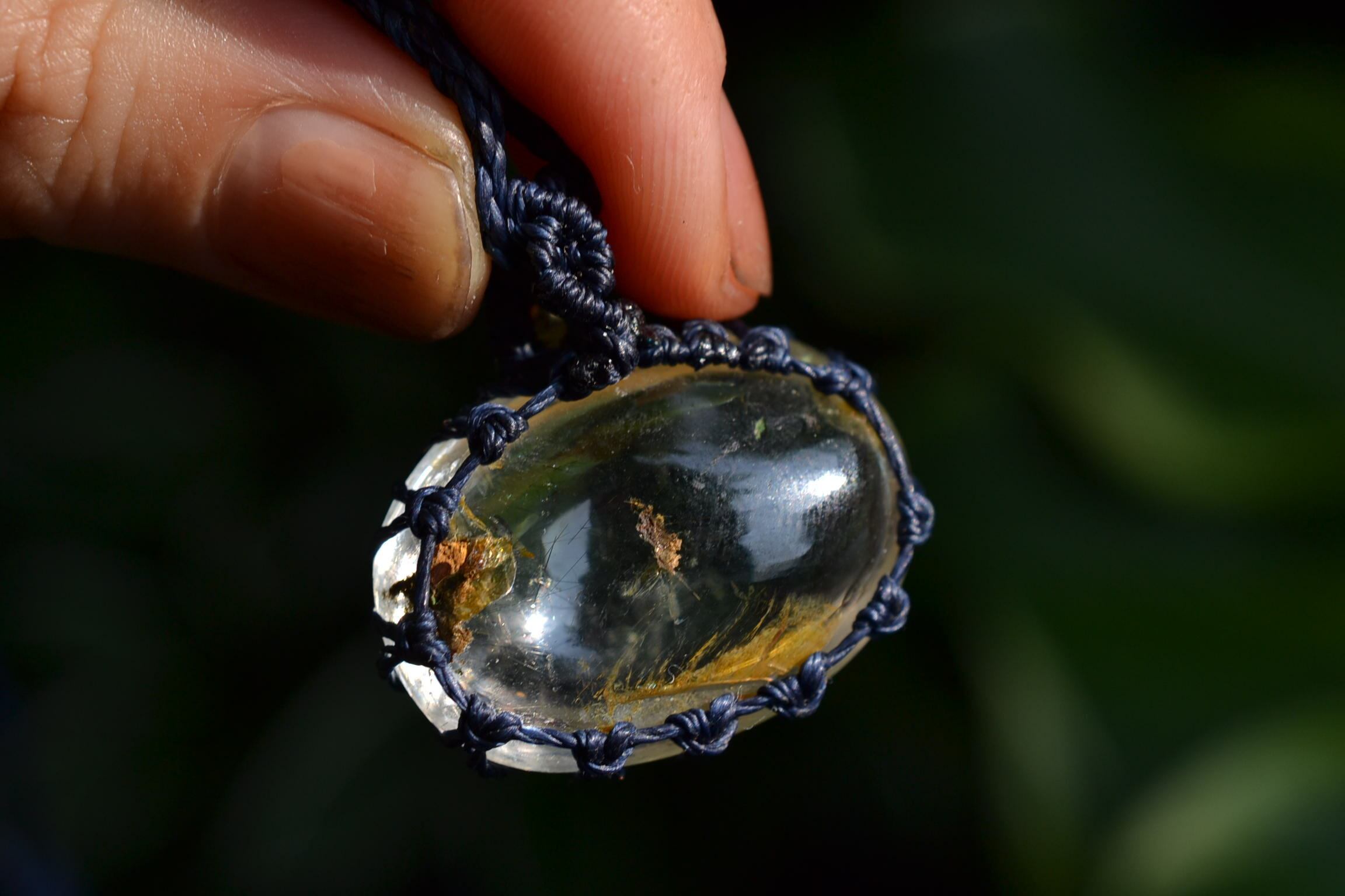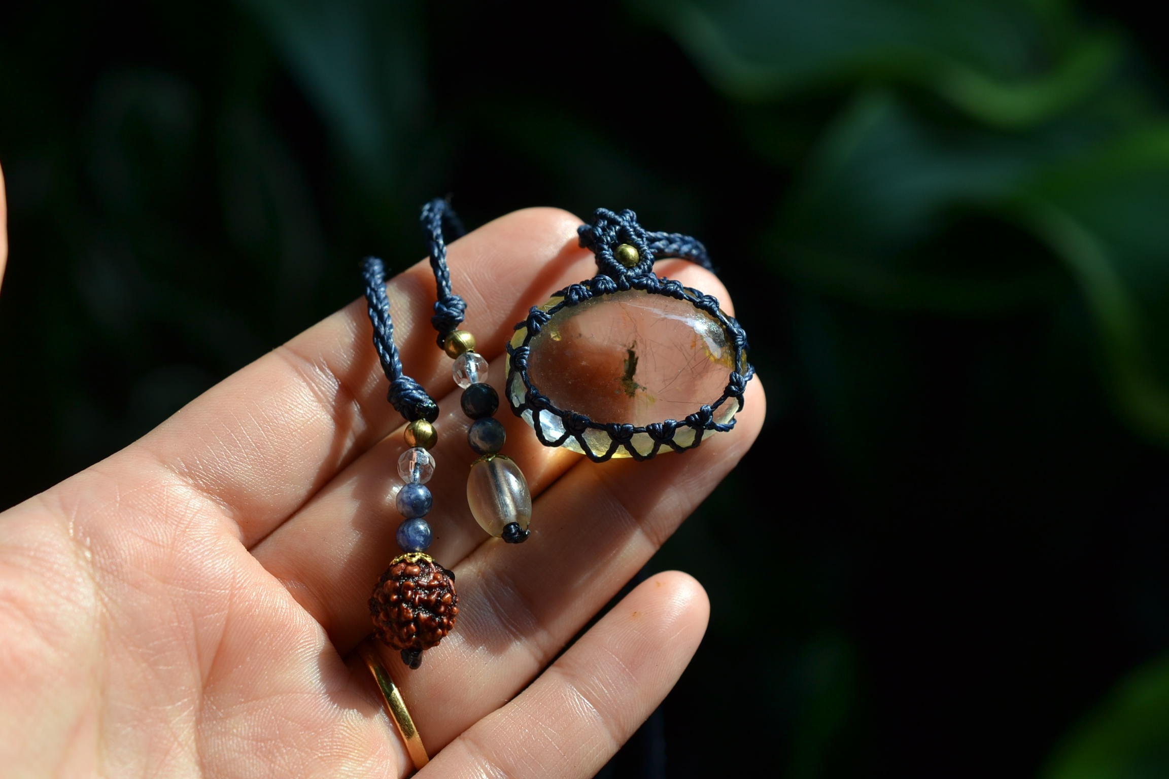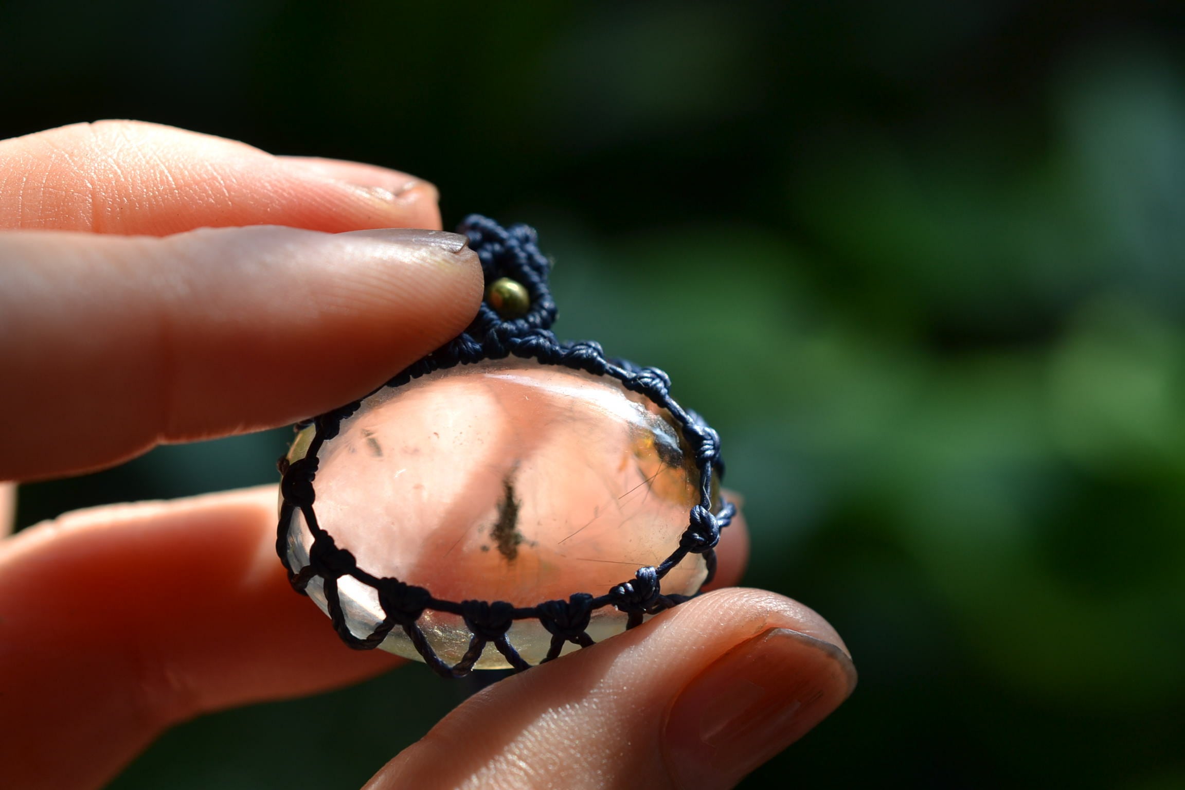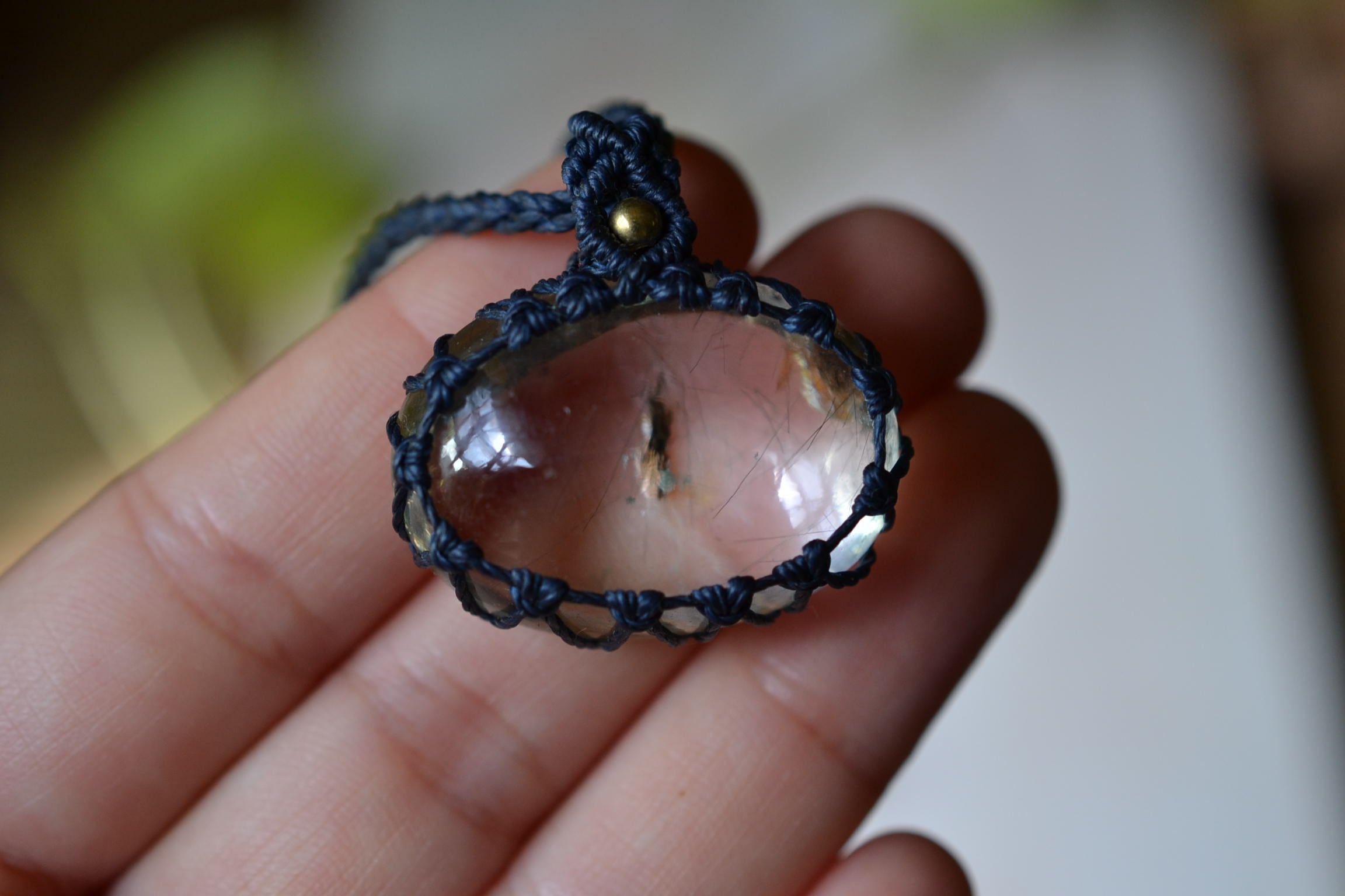 このたびのガーデンクォーツは水晶の中心にひっそりとガーデンクォーツ特有の緑眼石、そしてピンク色の畑模様、かすかに広がる針水晶(ブラックルチル)を見てとることができる、とっても不思議でユニークな天然石をペンダントに仕上げました。石の持つ水晶も本来の輝きがとてもクリアであり透明感抜群です。
