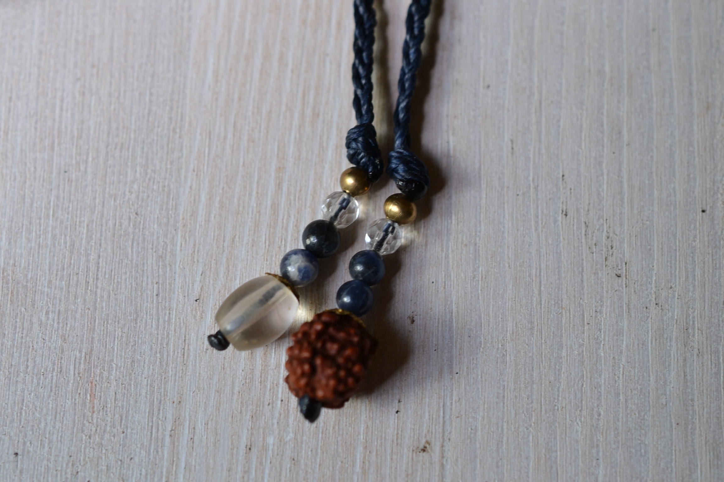 クリアクォーツ、カイヤナイト、アンティークガラス、菩提樹の実(ルドラクシャ)真鍮ビーズ、パーツを使用。