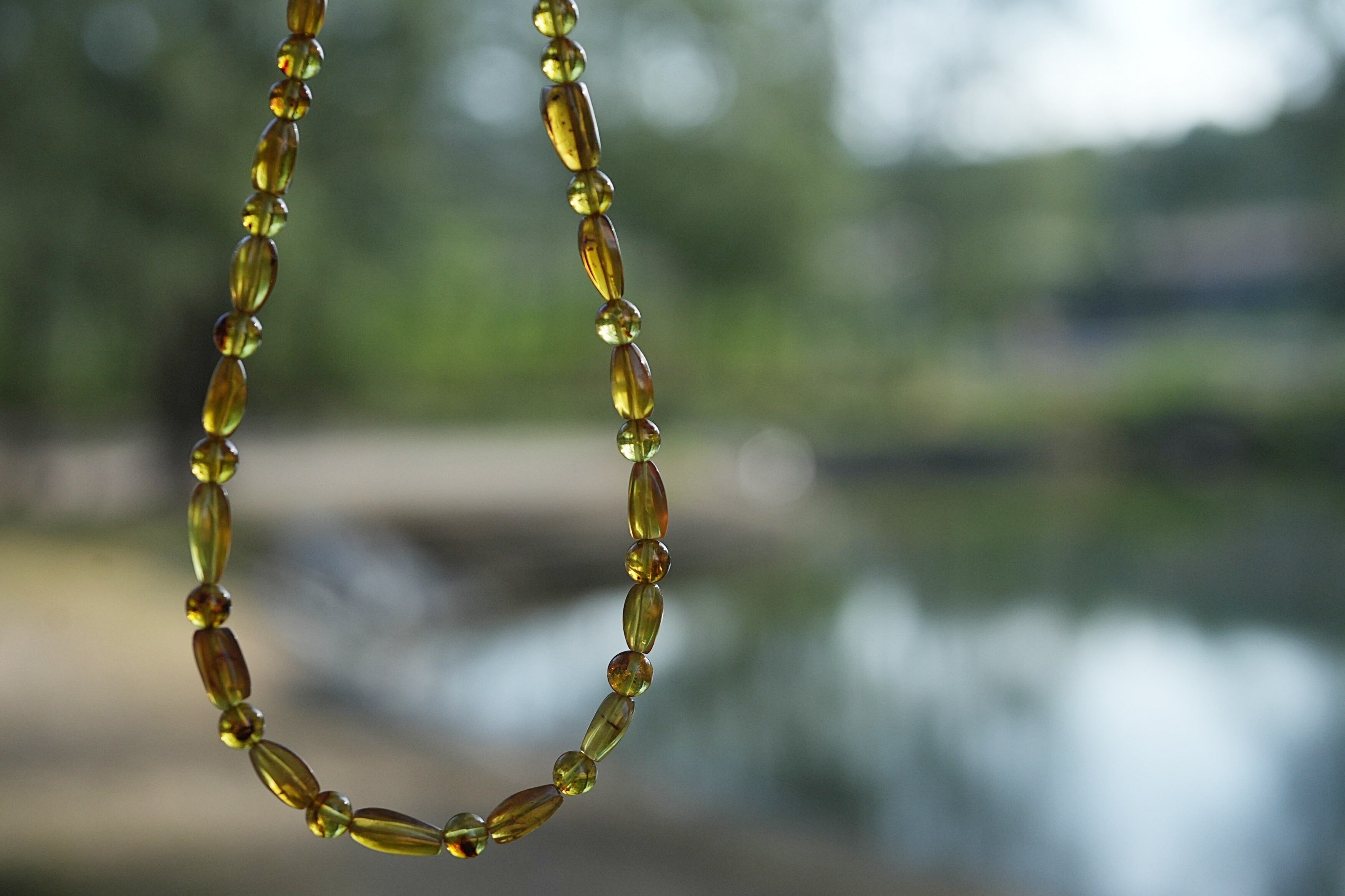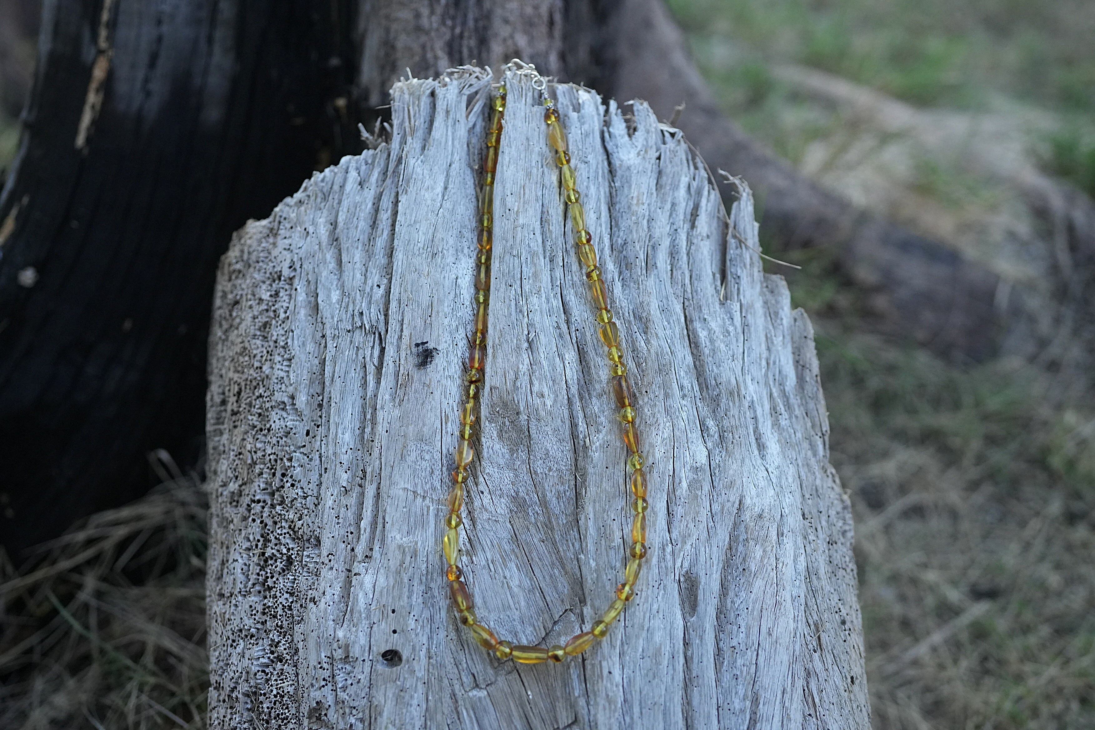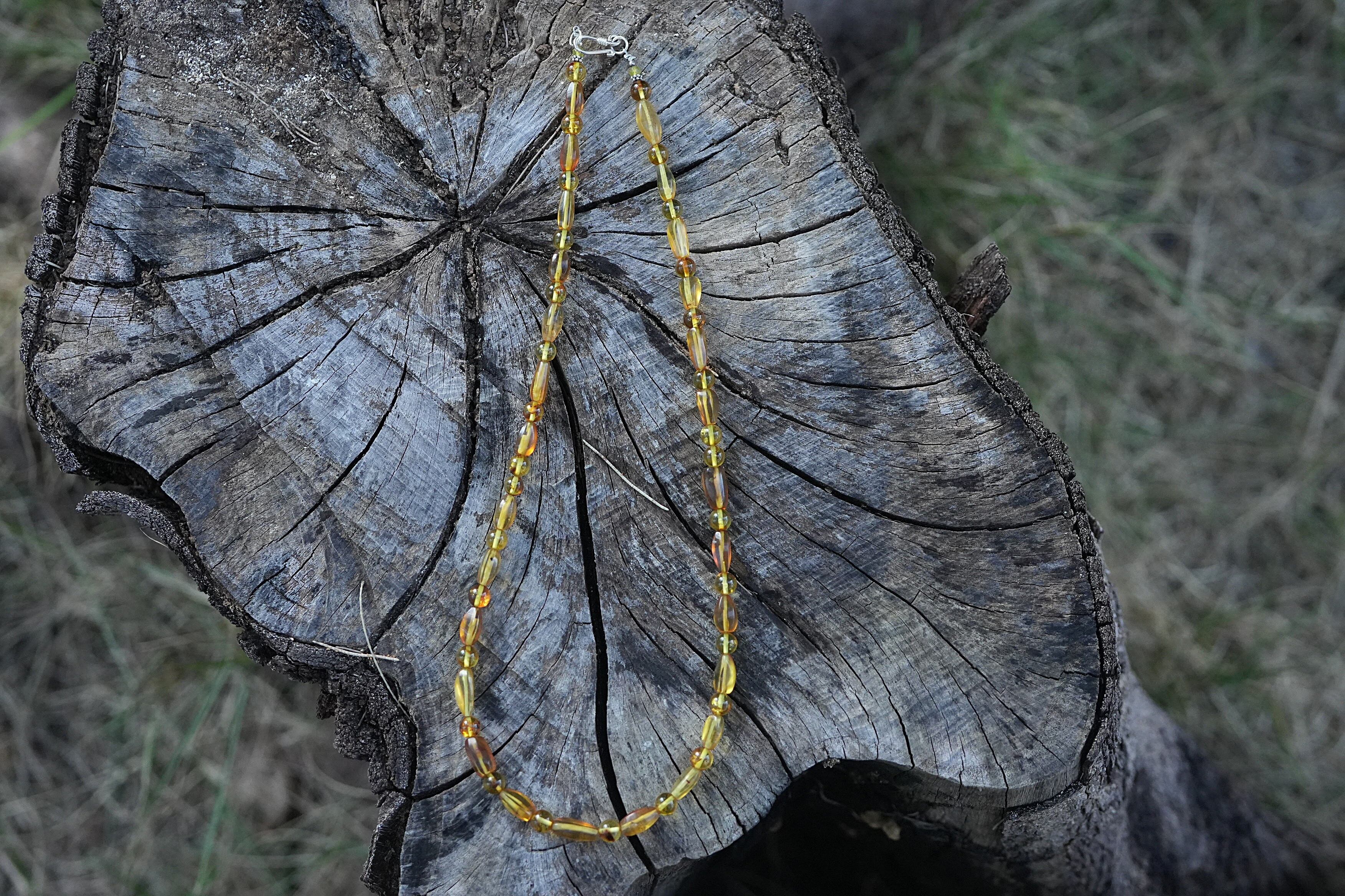 異なる2種類の形のアンバービーズを使用して個性的なネックレスを制作。