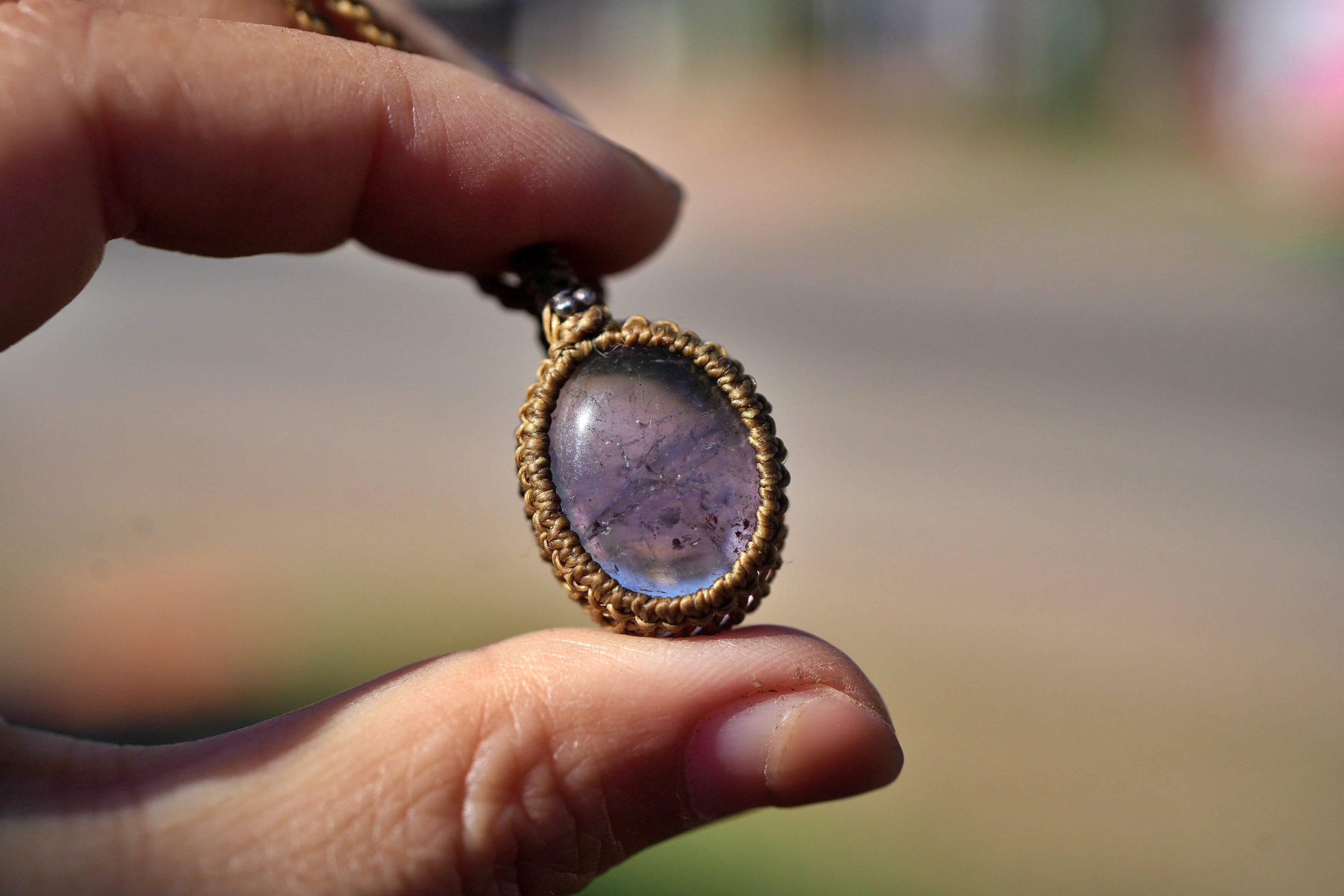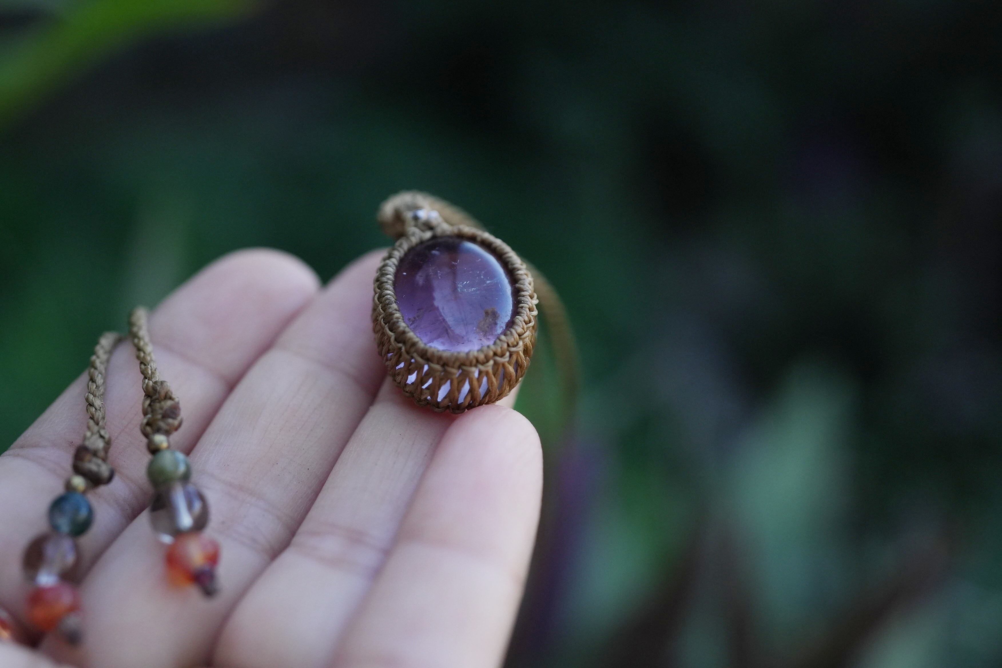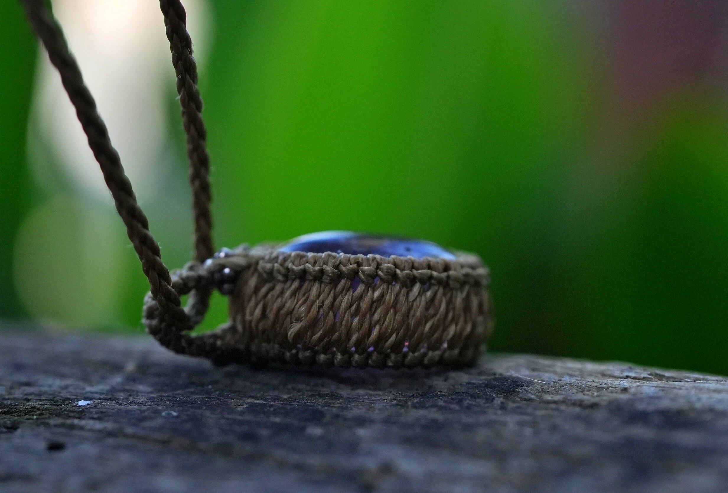 ◆このたびはゴールドブラウン色の蝋引き糸を使用しマクラメ編み装飾を施しました。