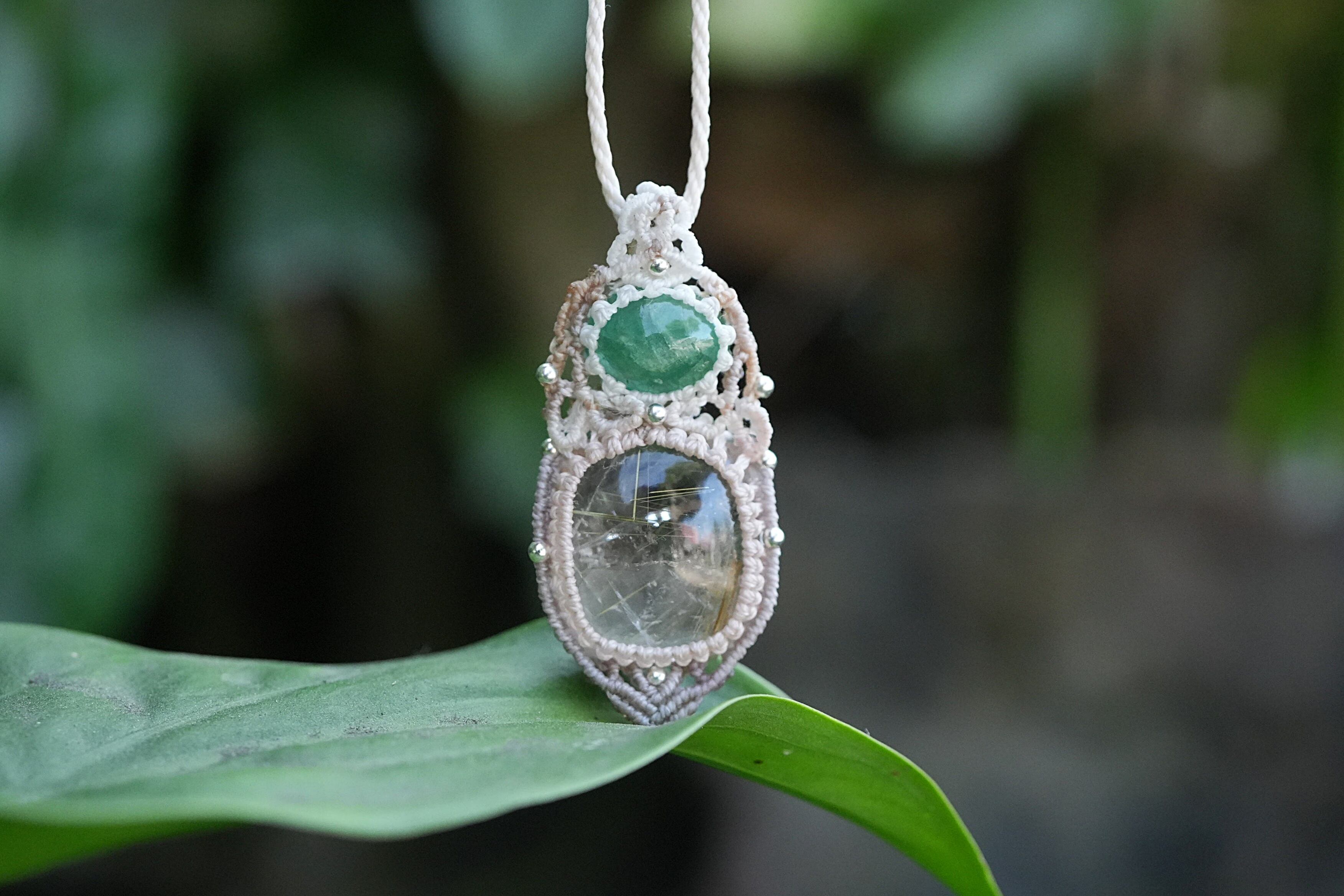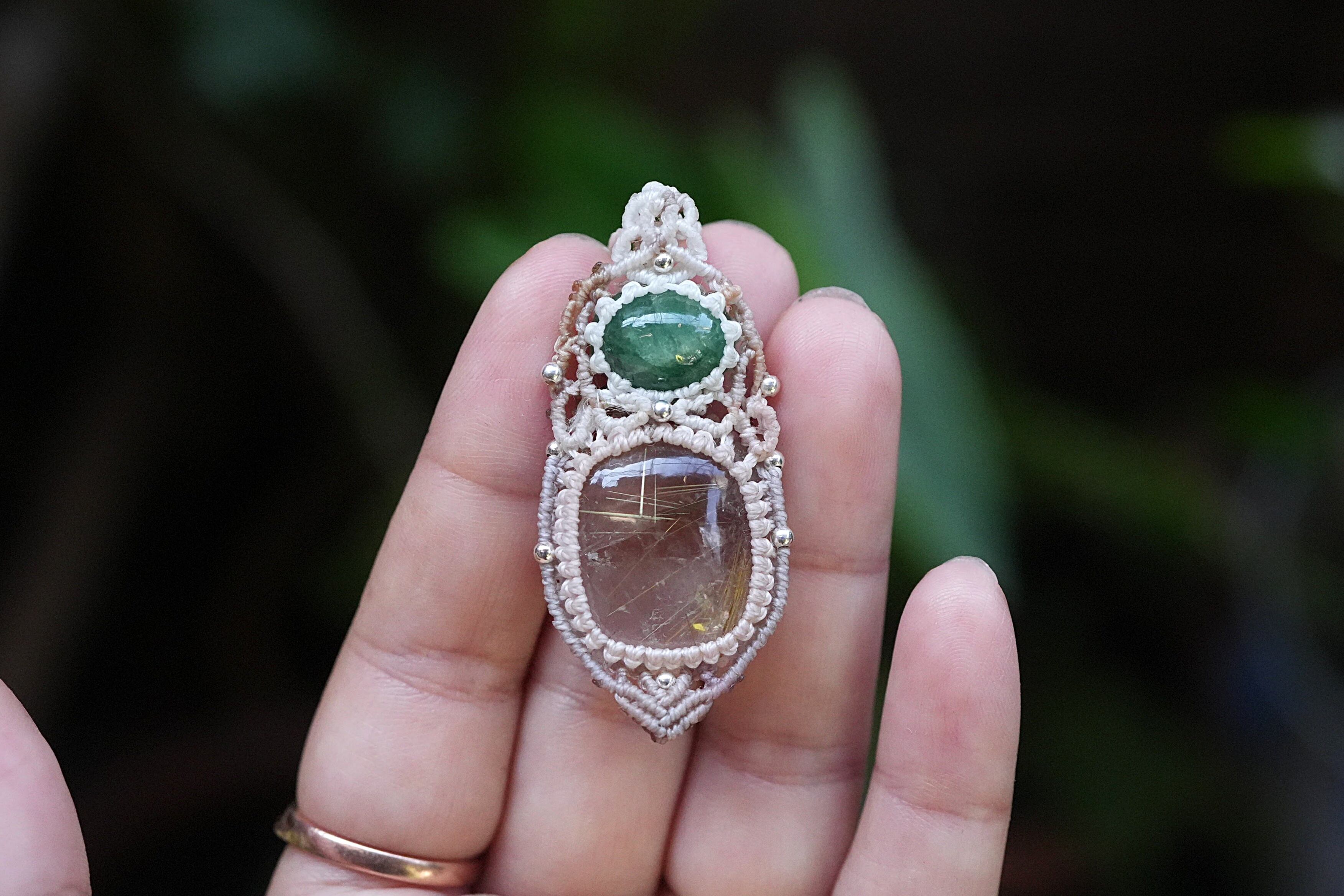 ゴールドルチルインクォーツを組み合わせてマクラメ編み装飾。