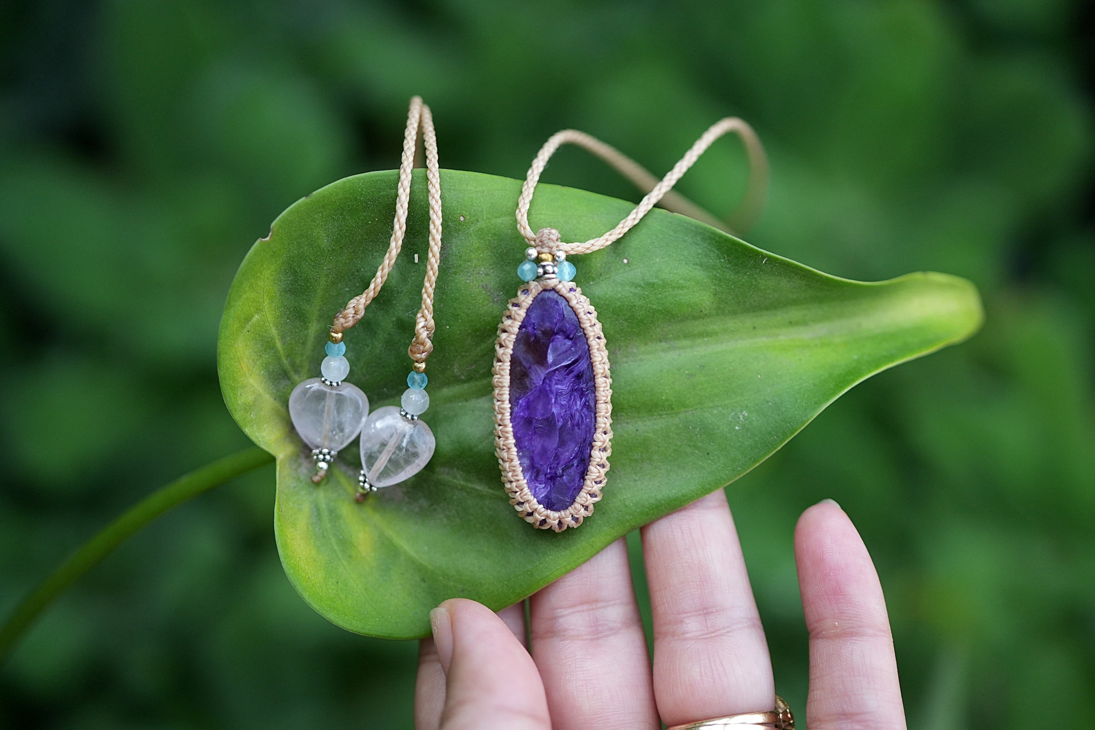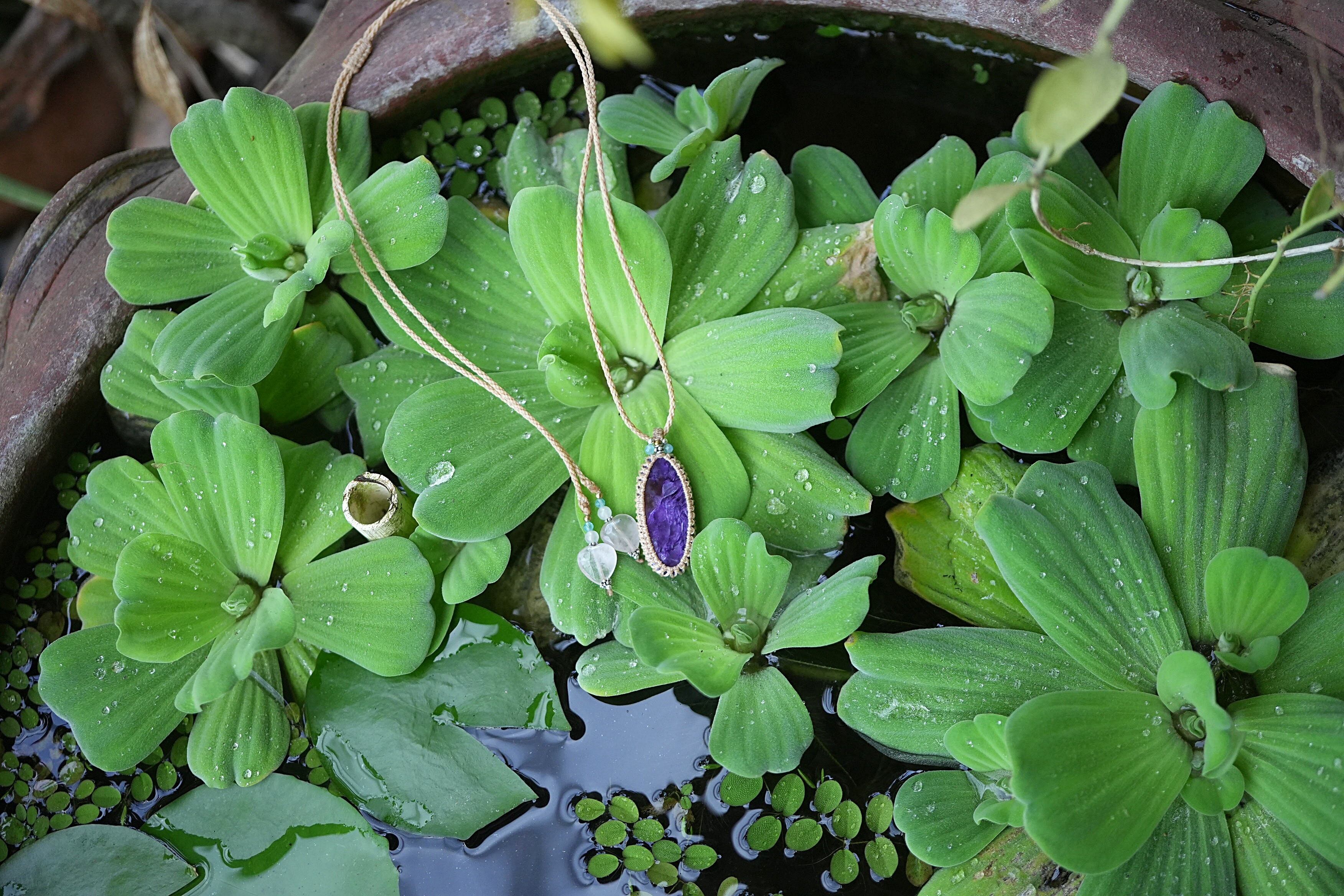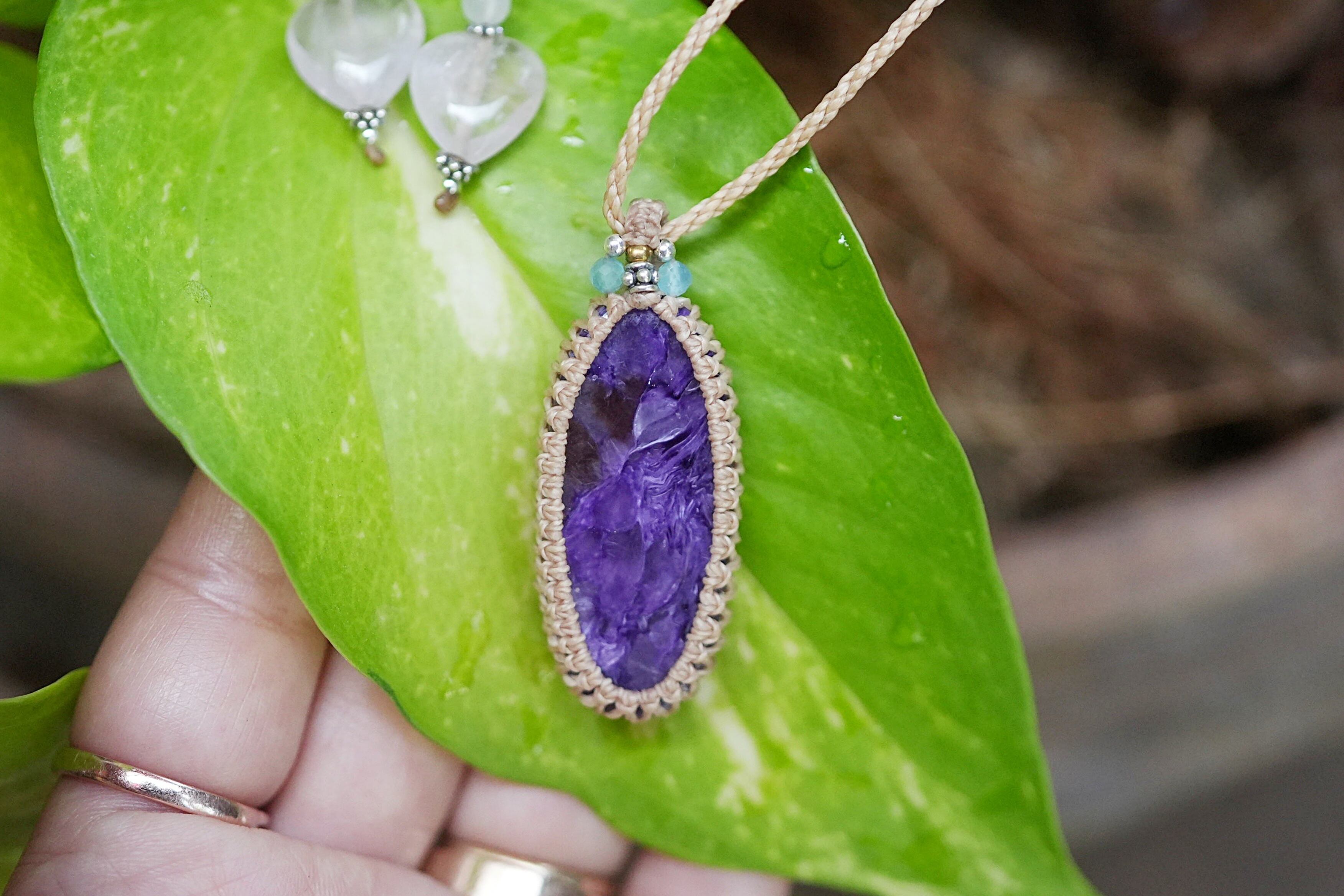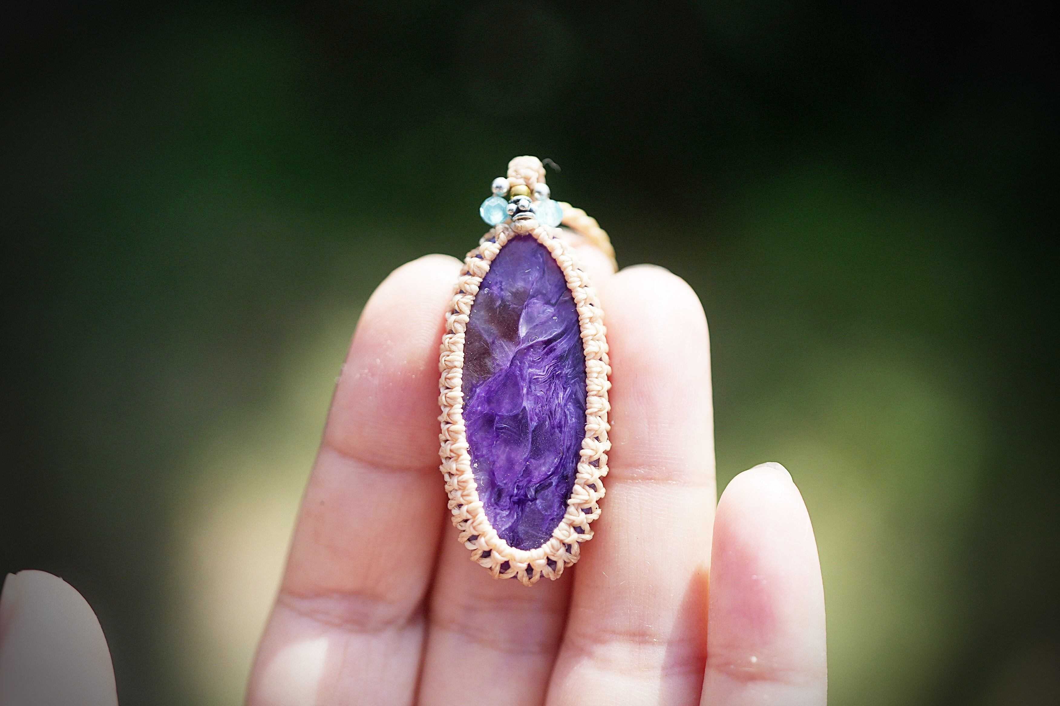 高品質な部分のチャロアイトルース部分をシンプルにマクラメネックレスに仕上げました。