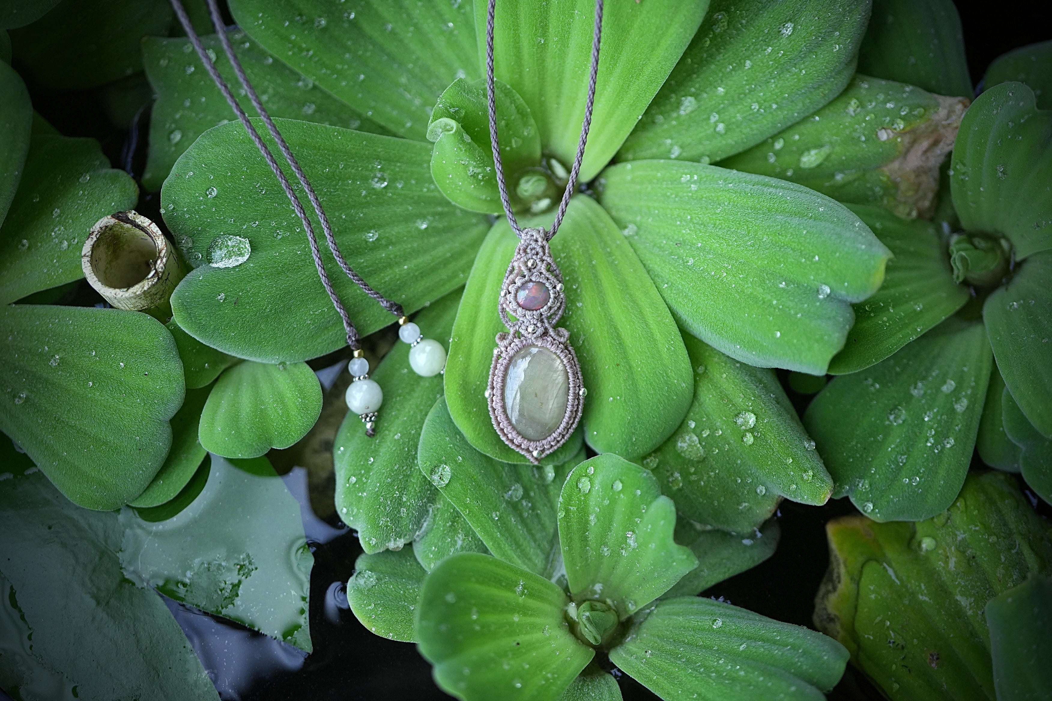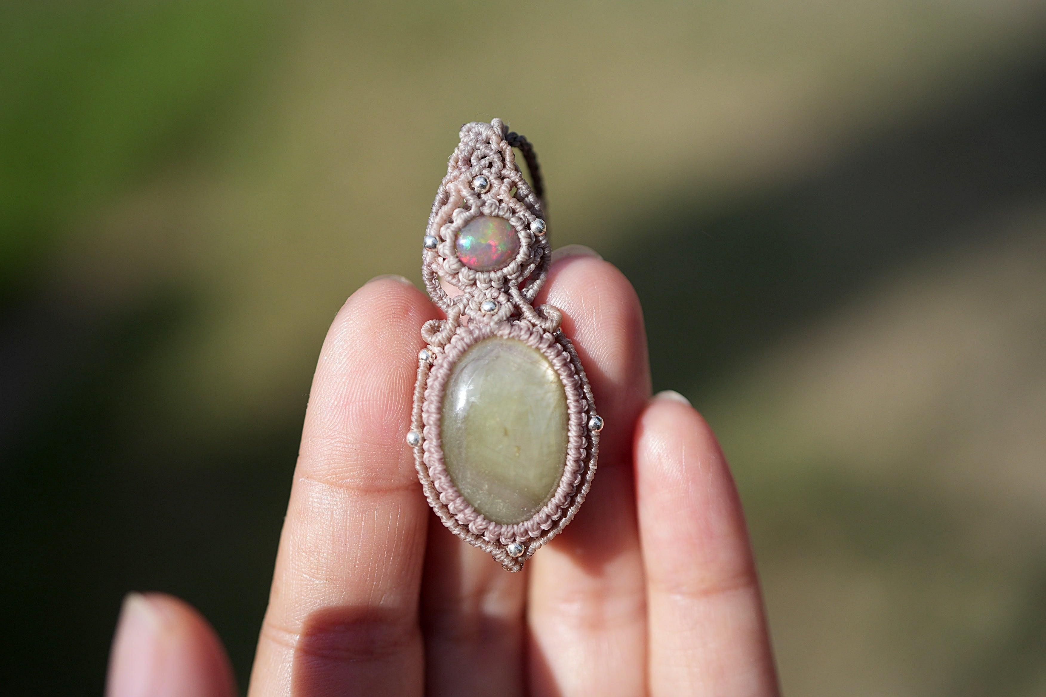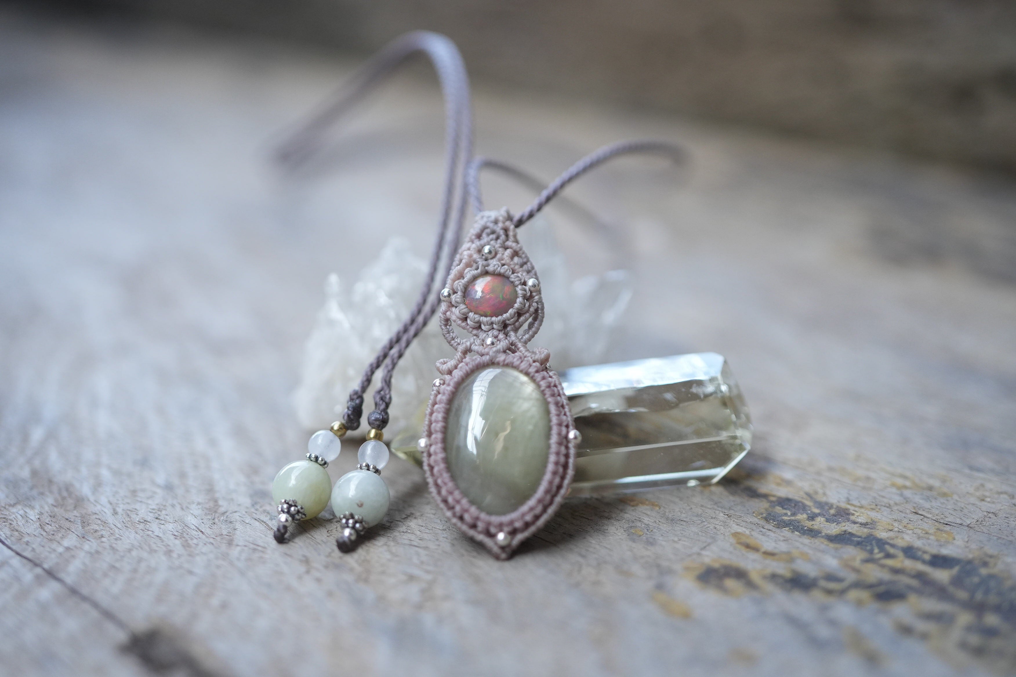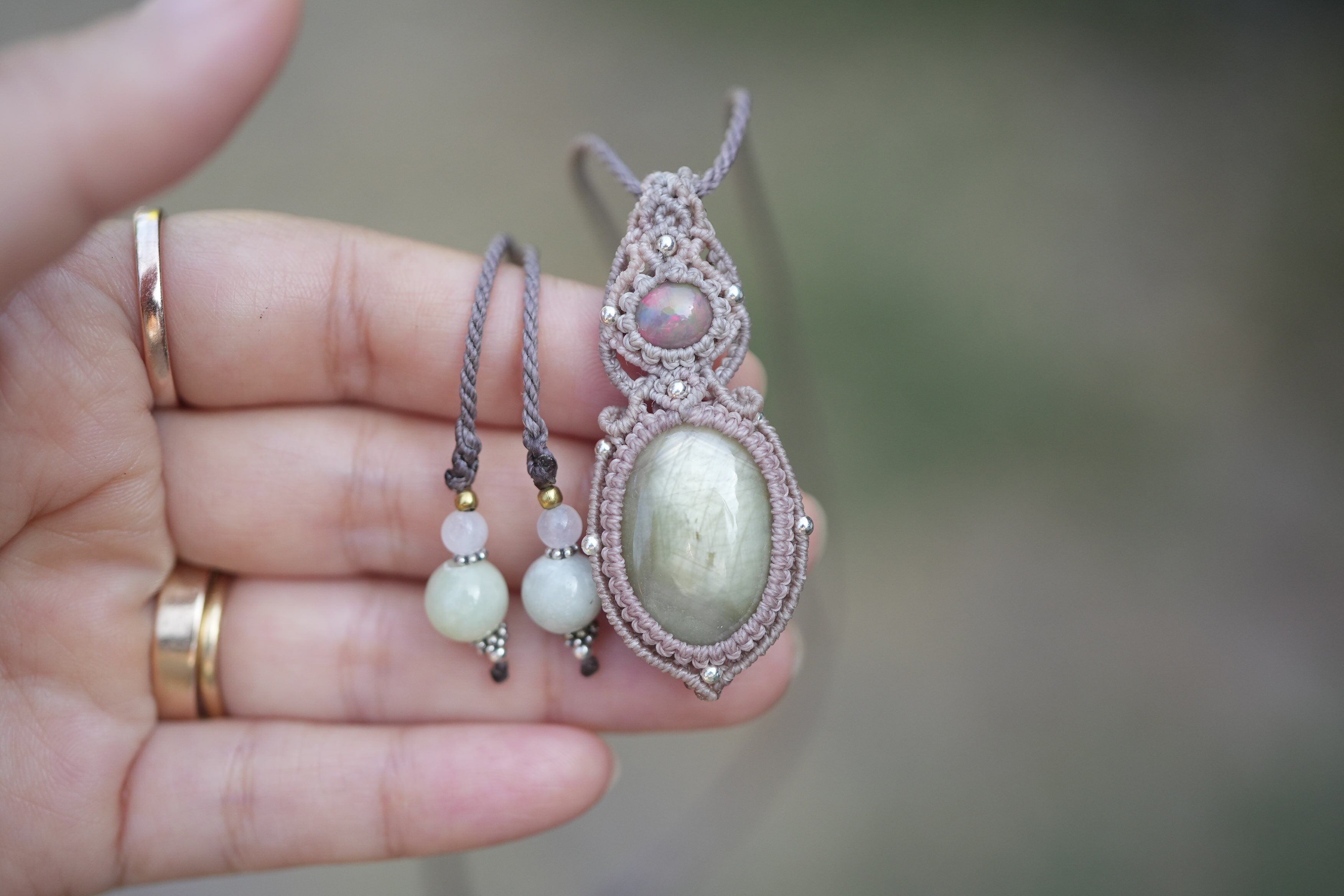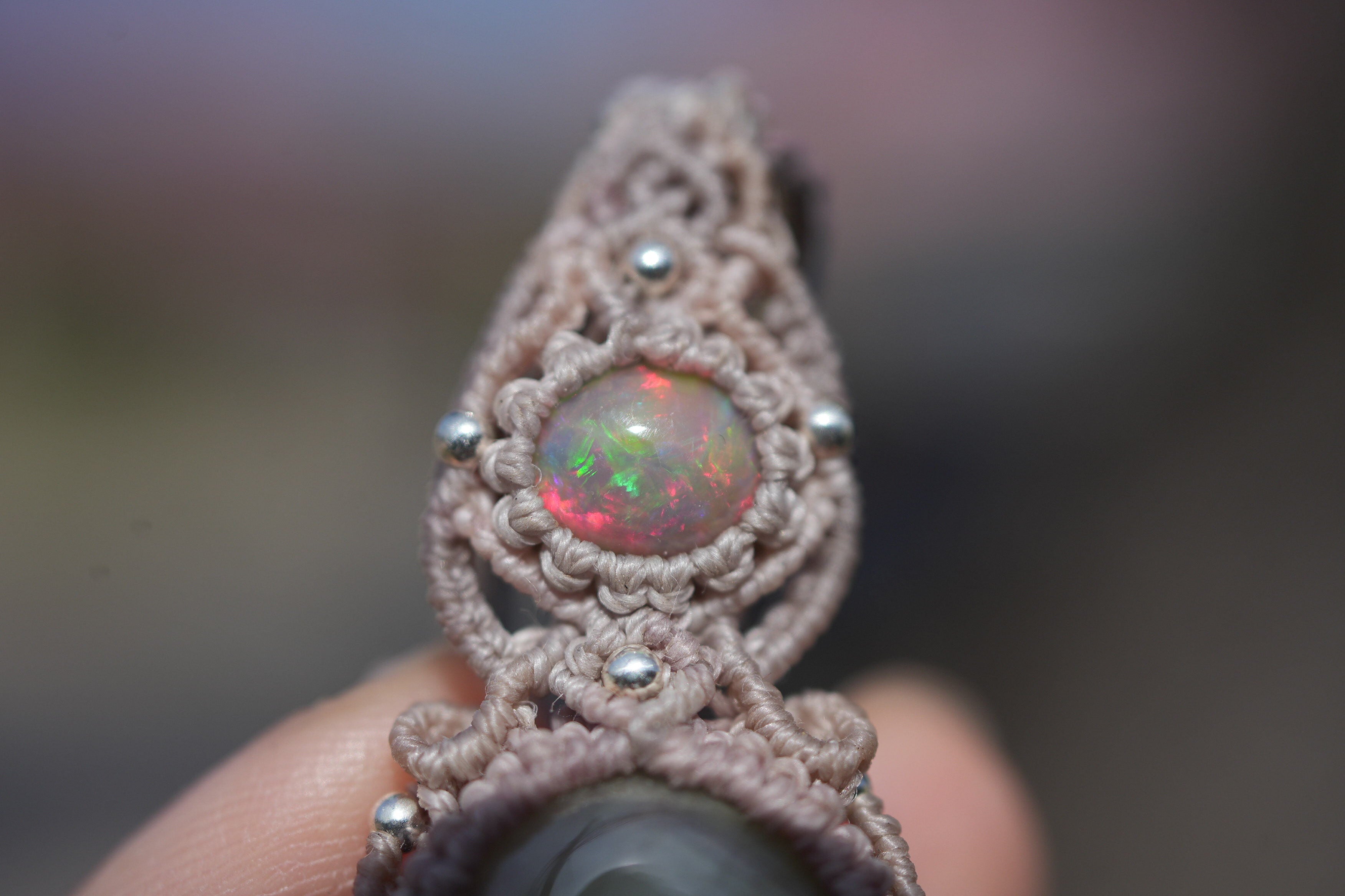 ◆このたびはダブグレイ、ヘンプ色の蝋引き糸を使用しマクラメ編み装飾を施しました。