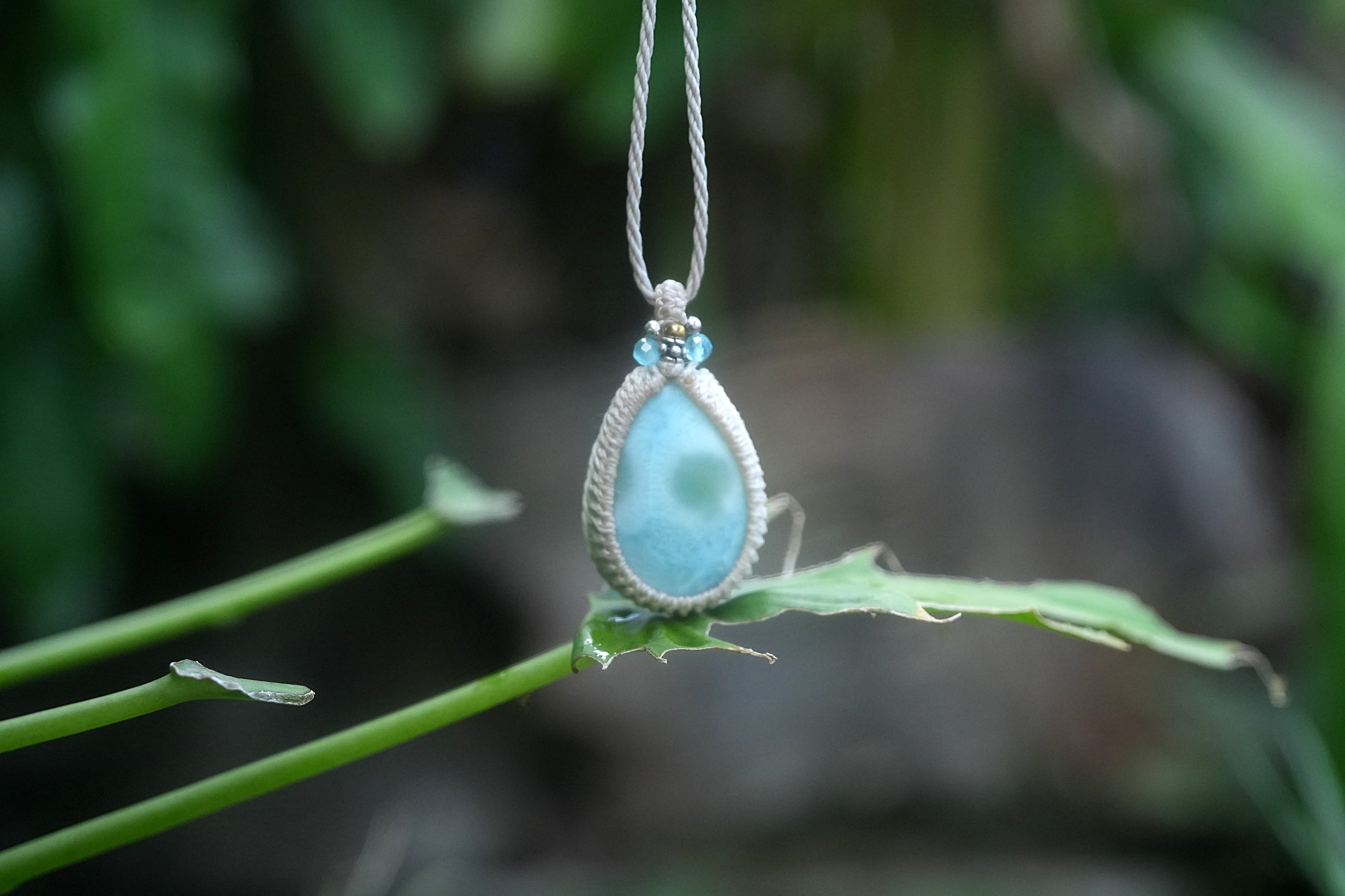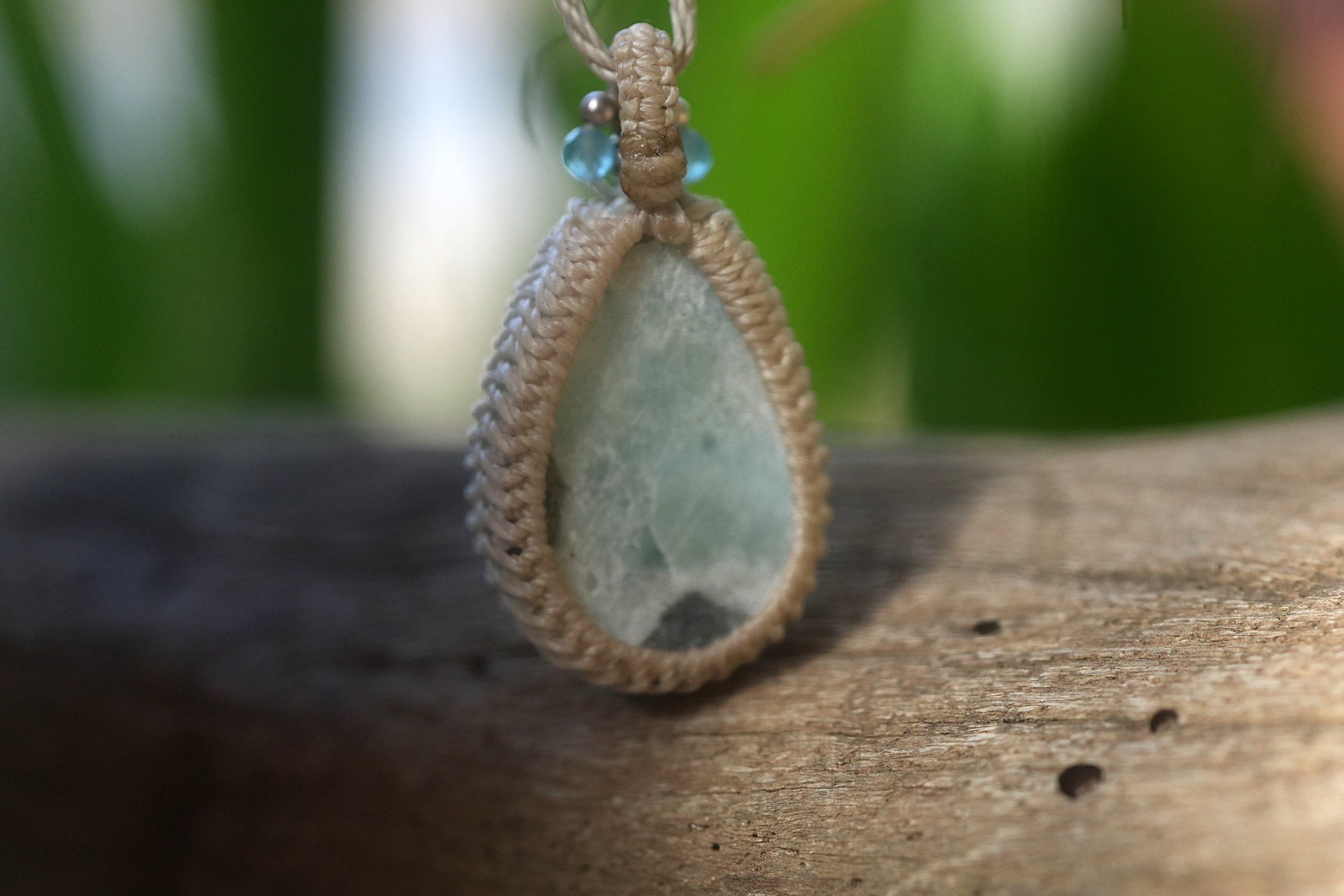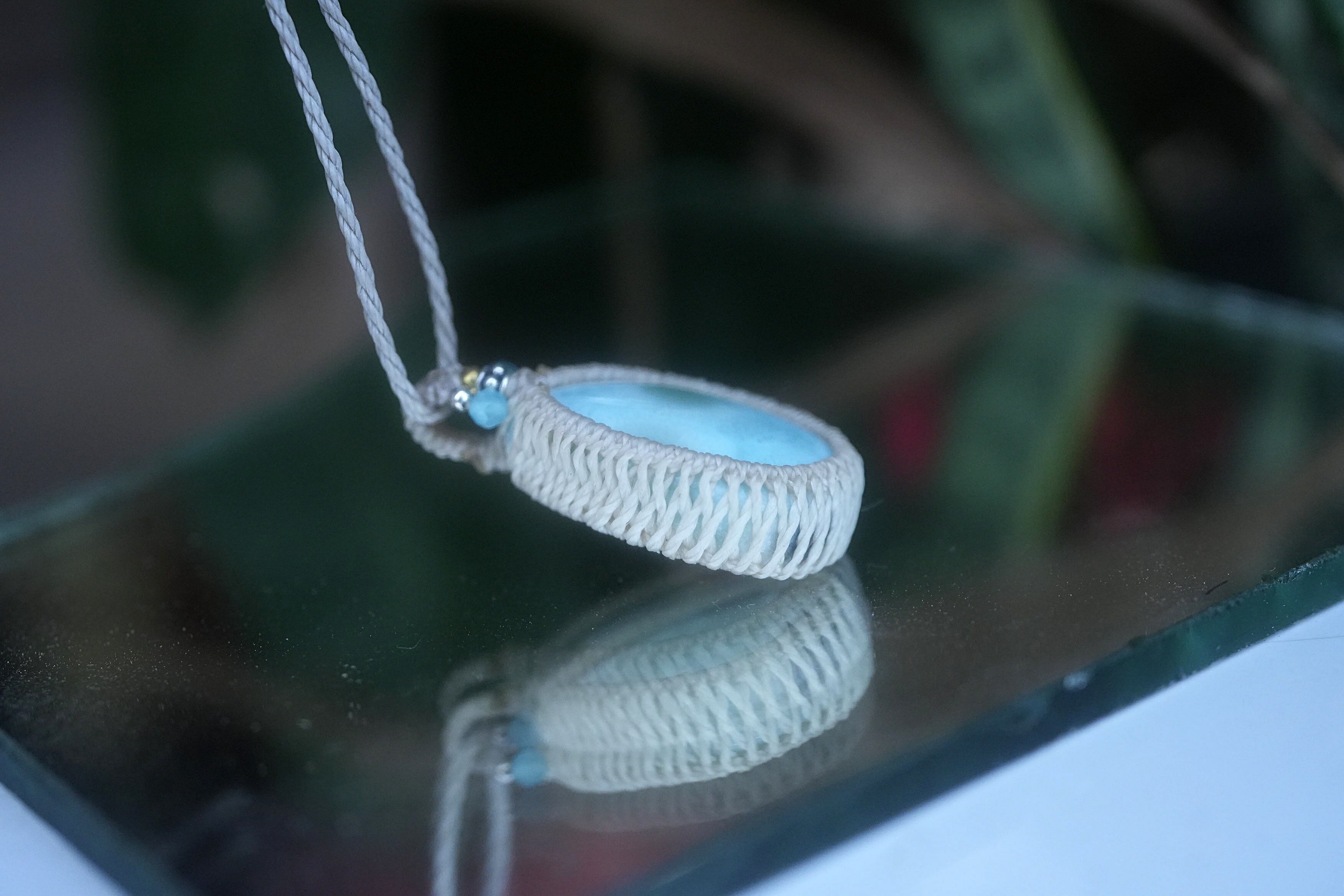 ◆このたびはナチュラルホワイト、ヘンプ色の蝋引き糸を使用しマクラメ編み装飾を施しました。