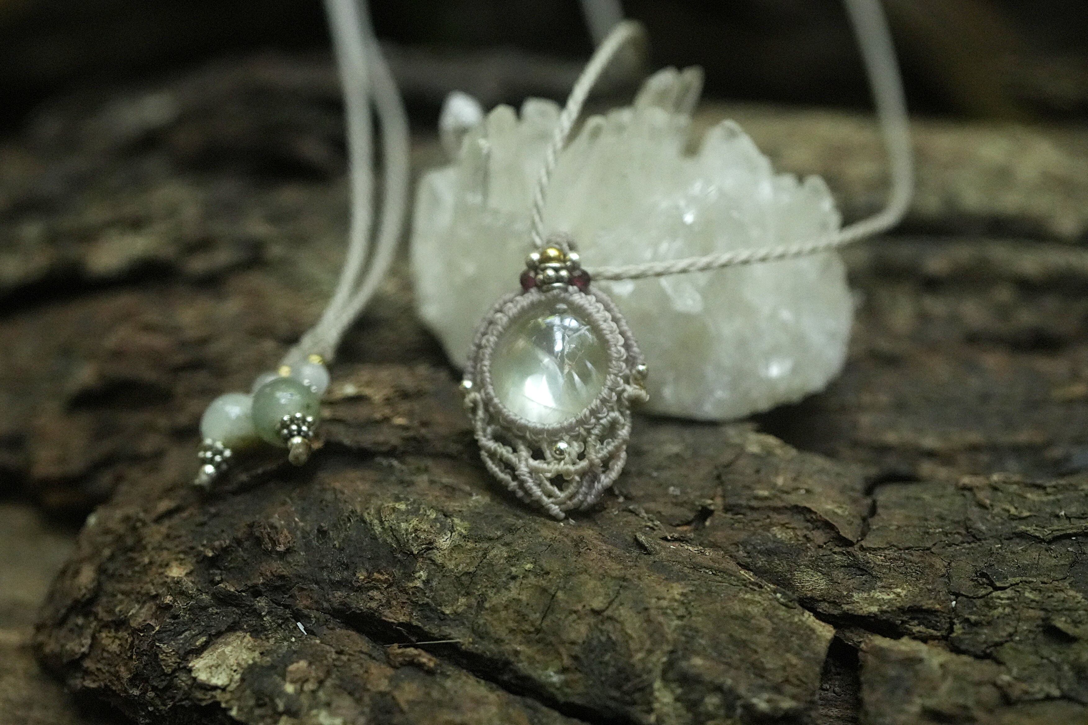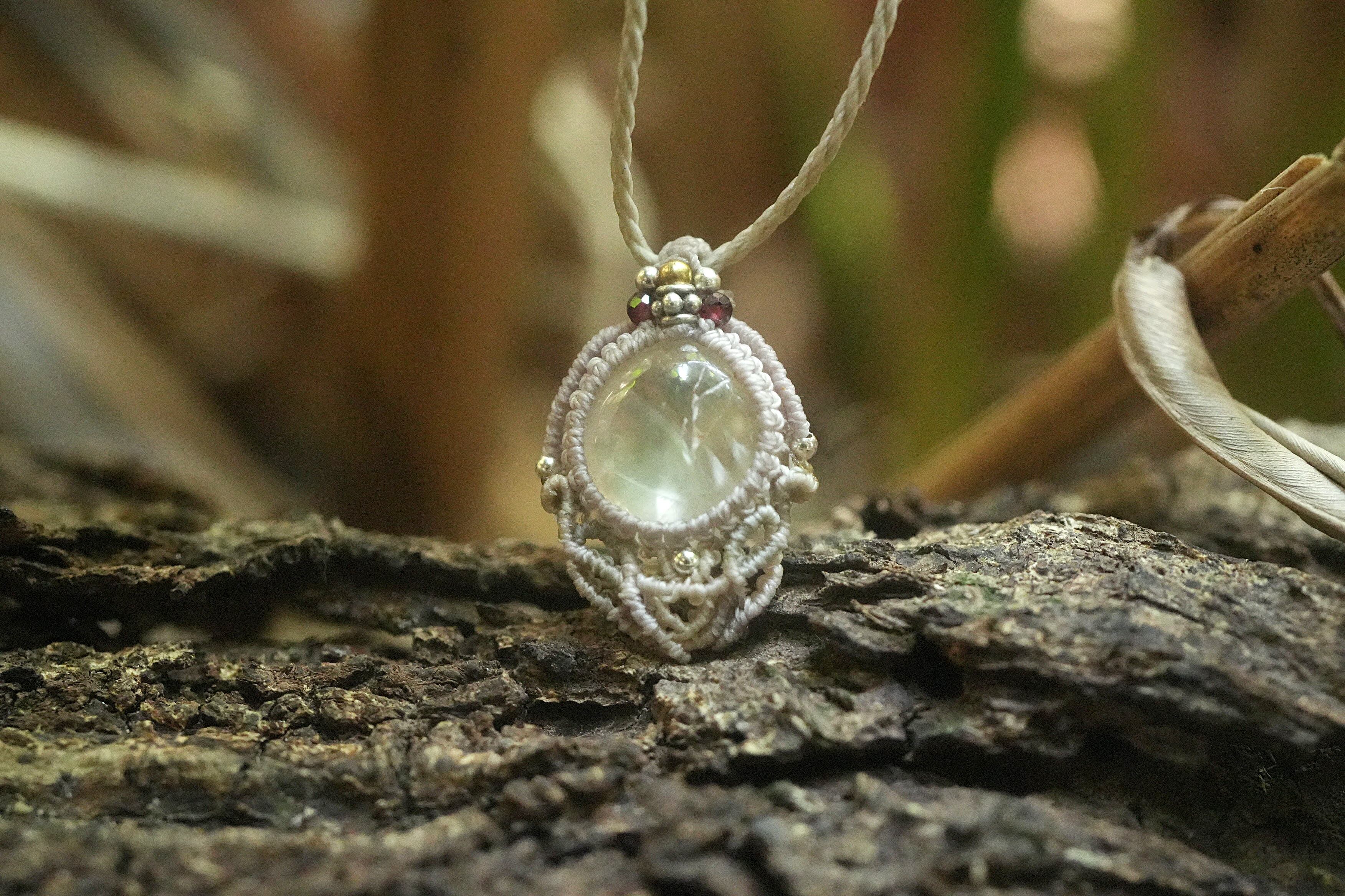 ・このたびはヘンプ・ナチュラルホワイト色の蝋引き糸を使用しマクラメ編み装飾を施しました。