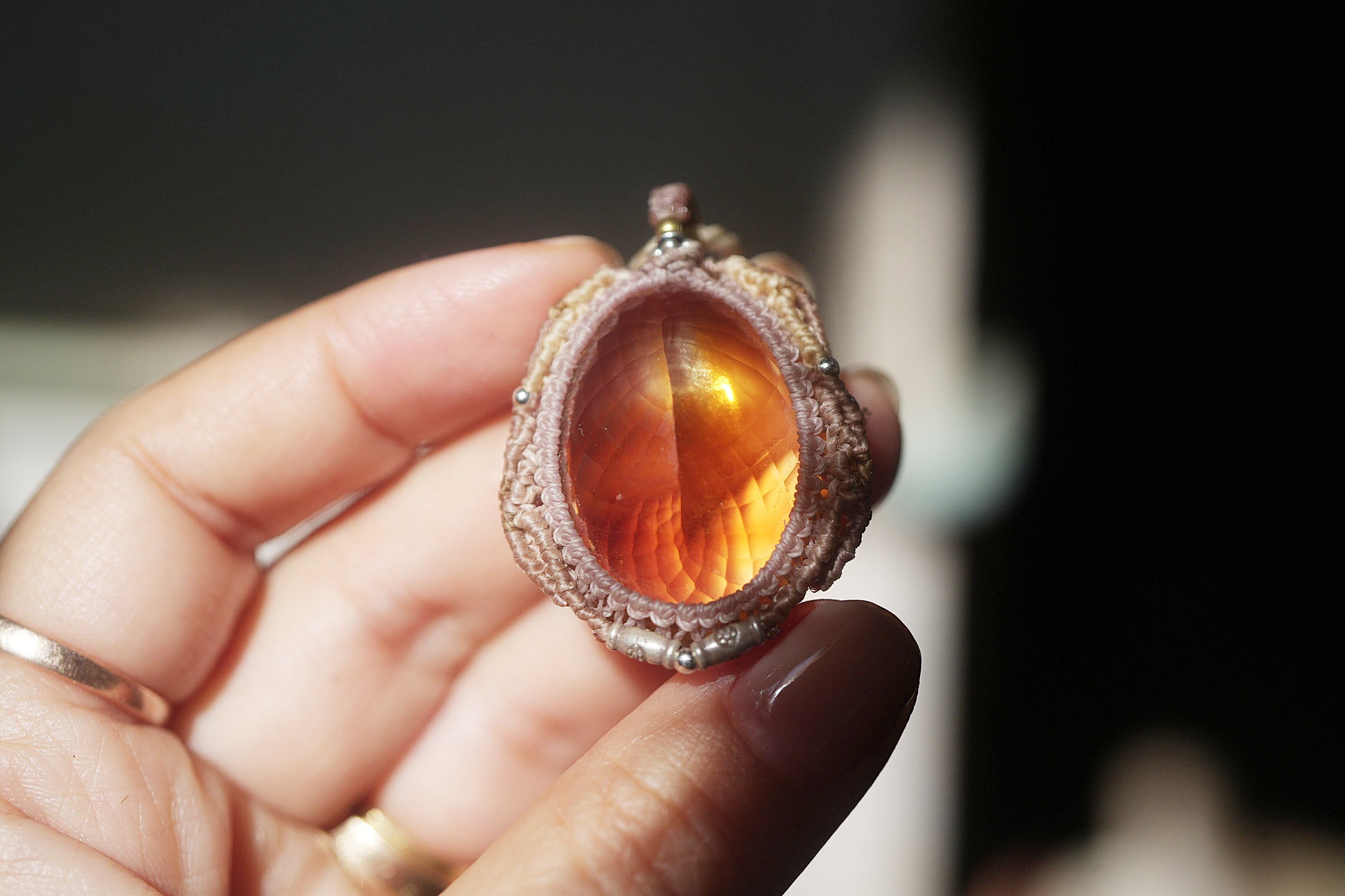 ◆このたびはミルクココア、キャラメル、ヘンプ色の蝋引き糸を使用しマクラメ編み装飾を施しました。