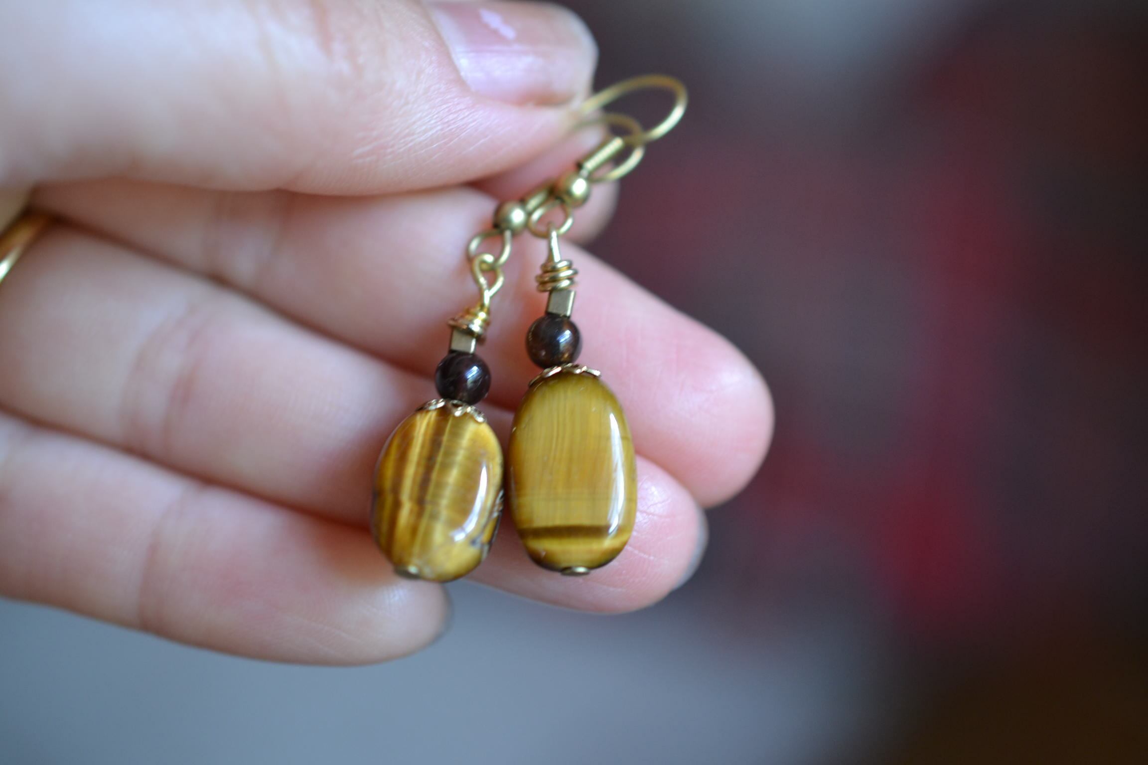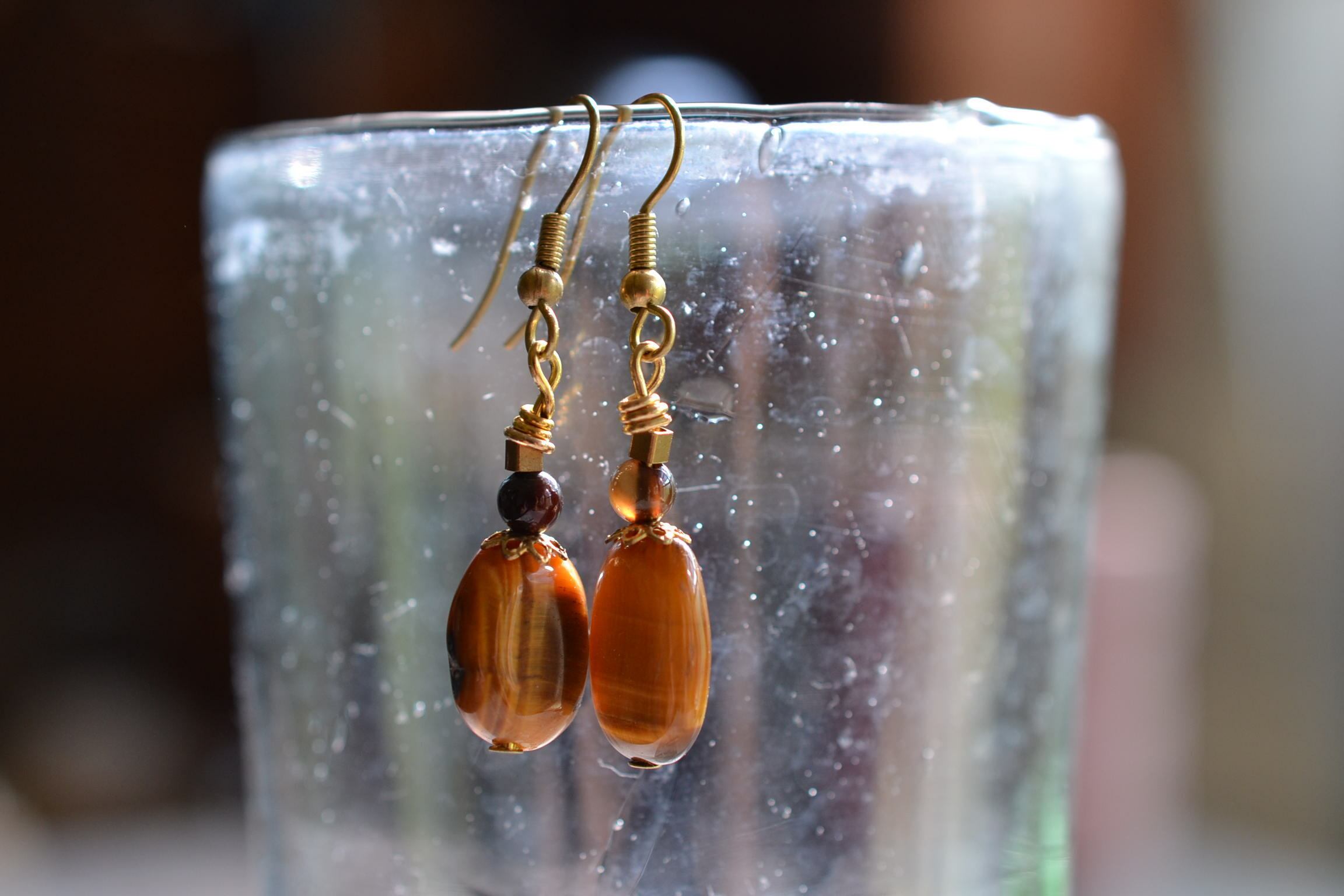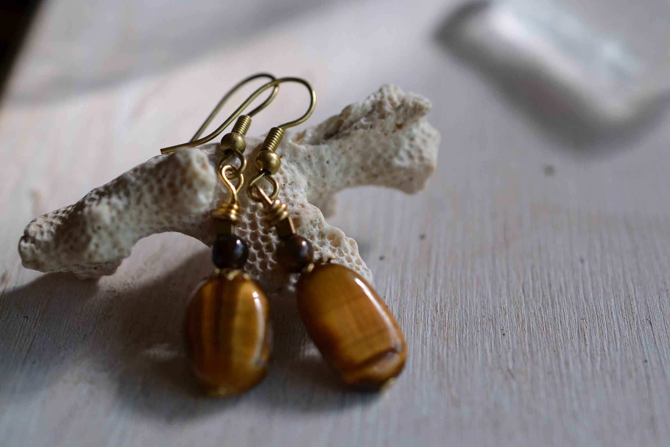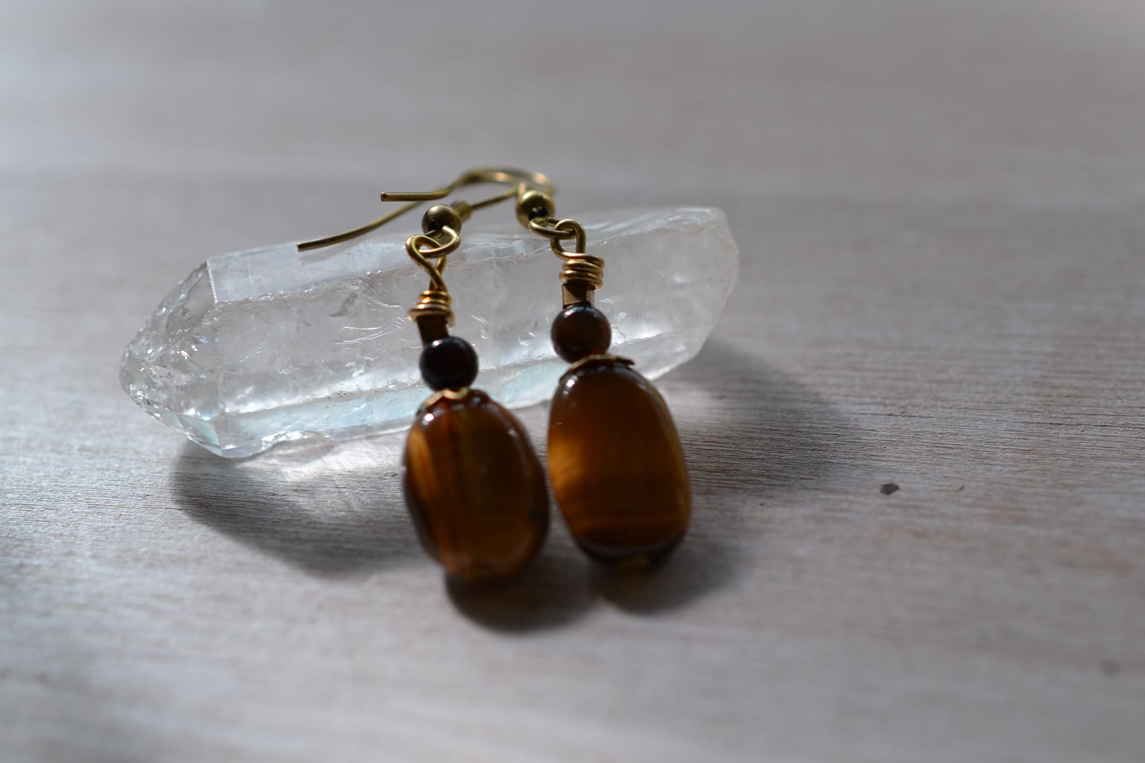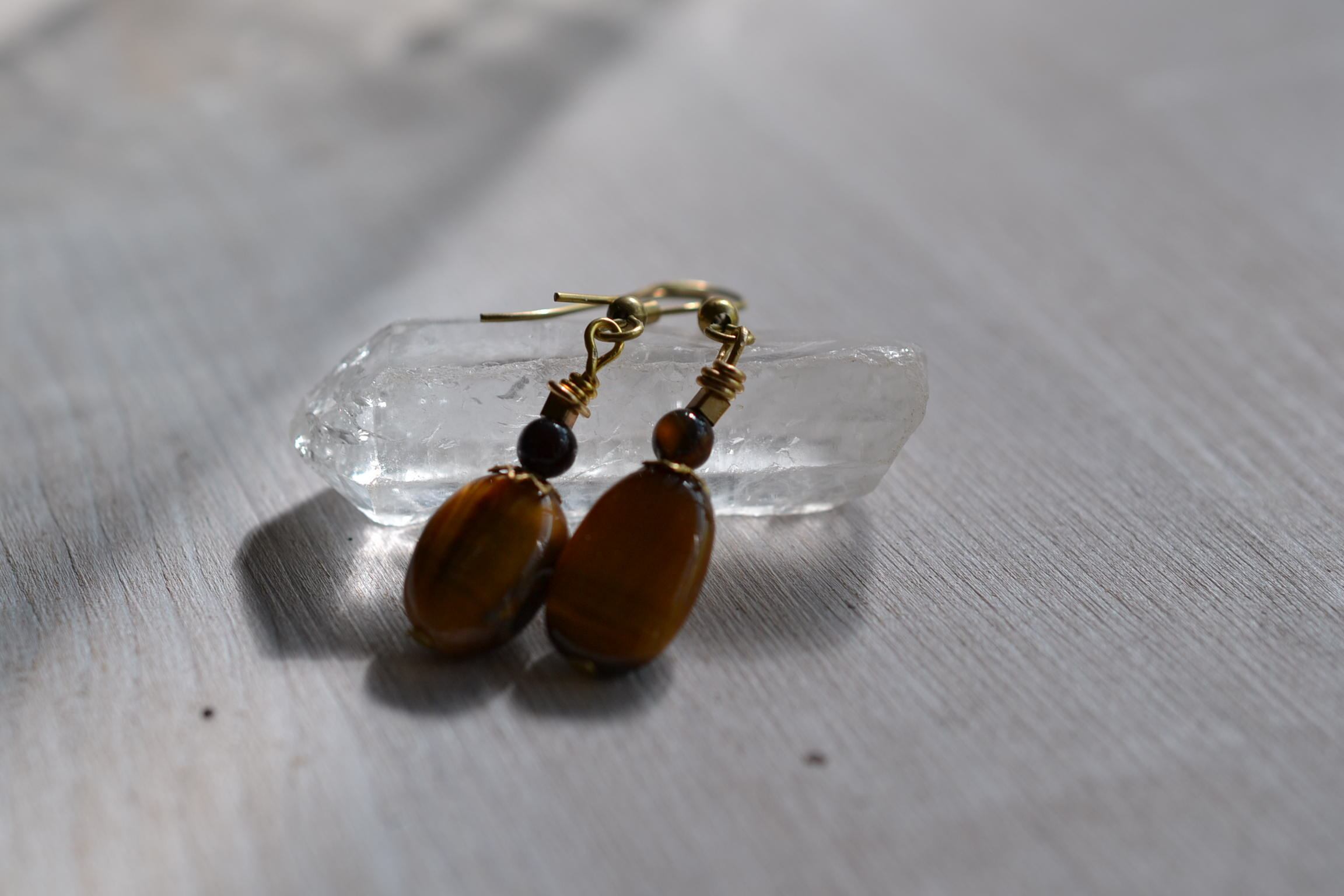 縦ラインがアーティスティックなタイガーアイビーズと横ラインがモダンなタイガーアイビーズをそれぞれ2つでひとつにしたピアス。