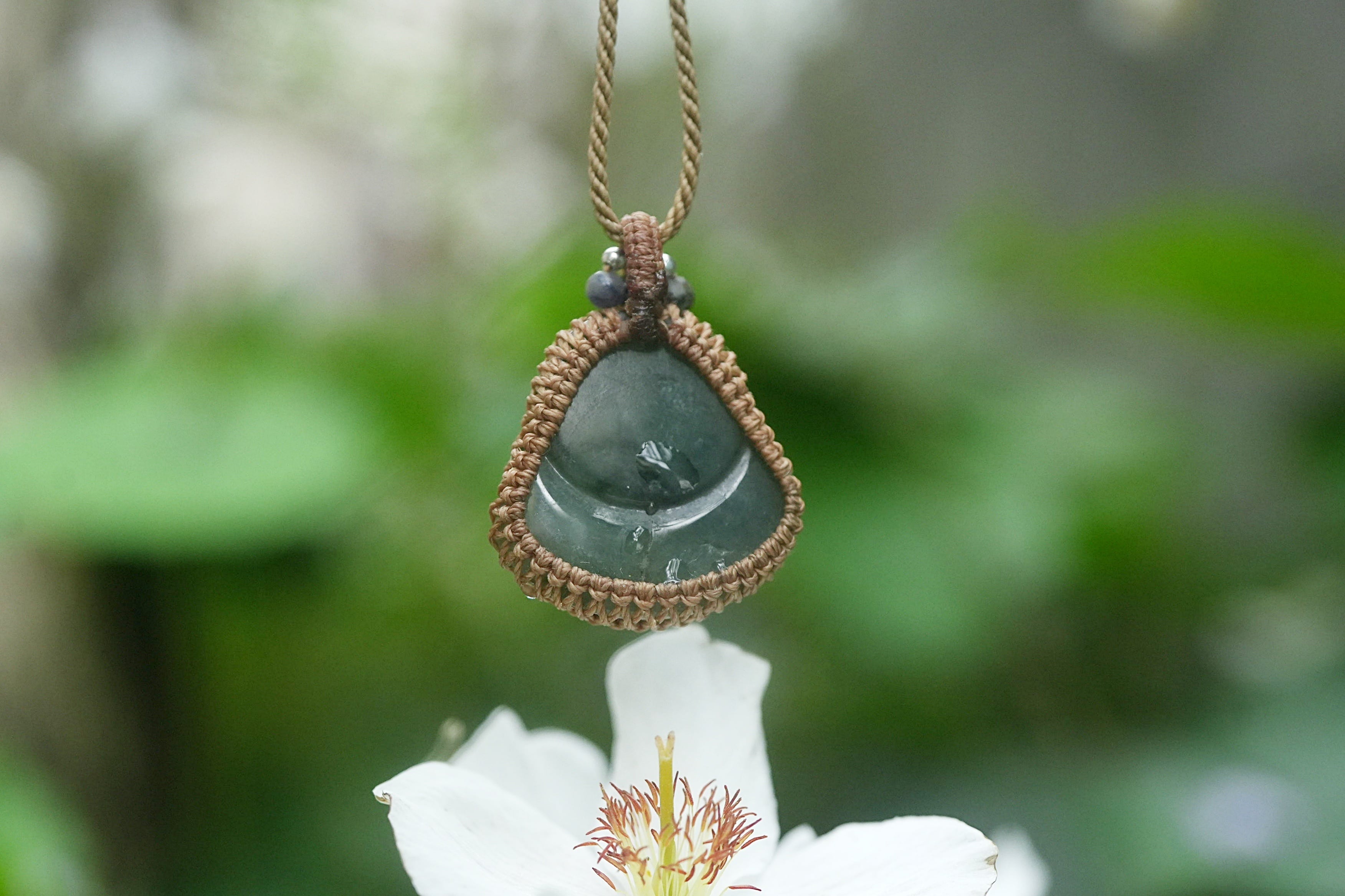 ◆このたびはゴールドブラウン色の蝋引き糸を使用しマクラメ編み装飾を施しました。