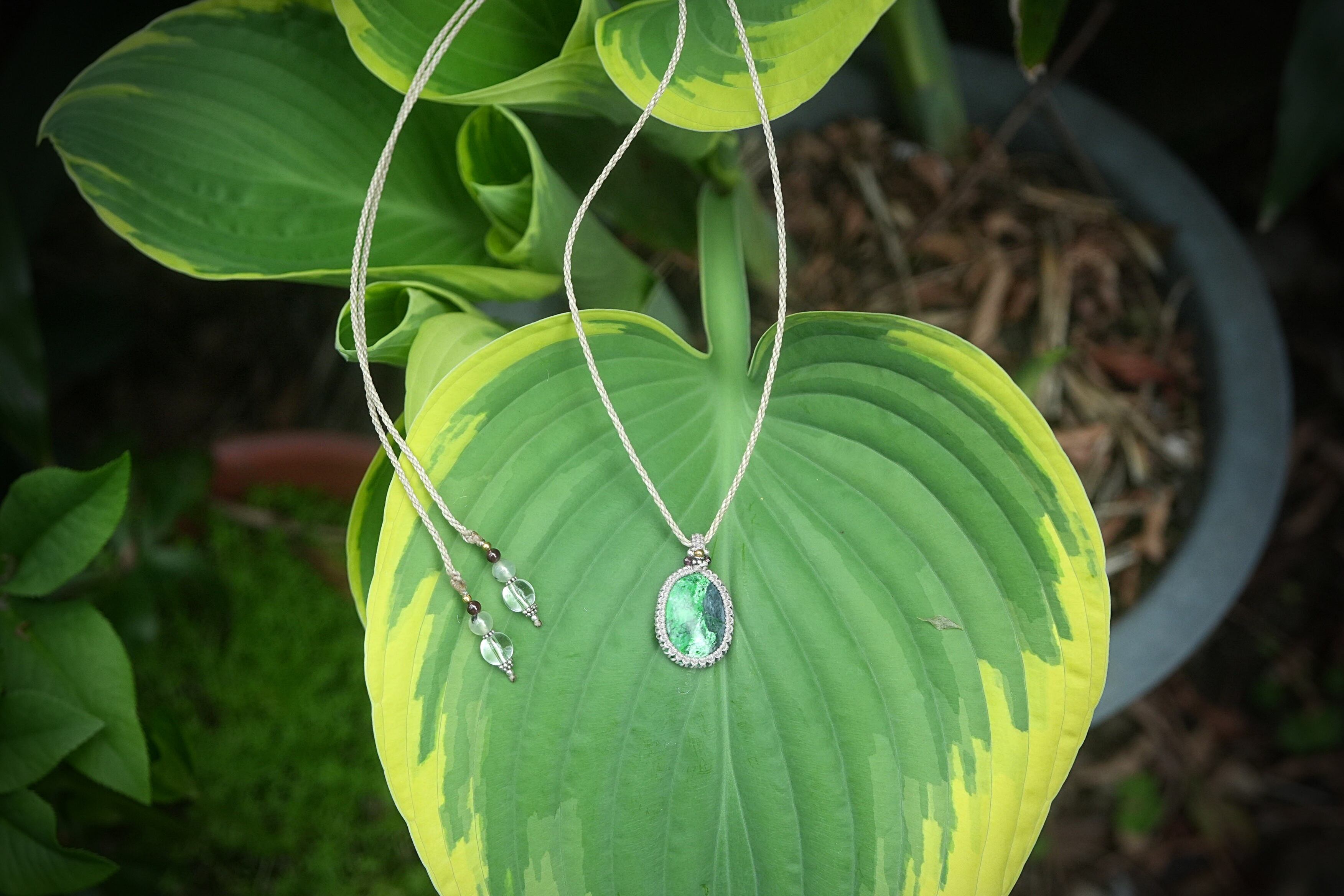 ◆このたびは首紐部分はヘンプ色の蝋引き糸を使用しマクラメ編み装飾を施しました。