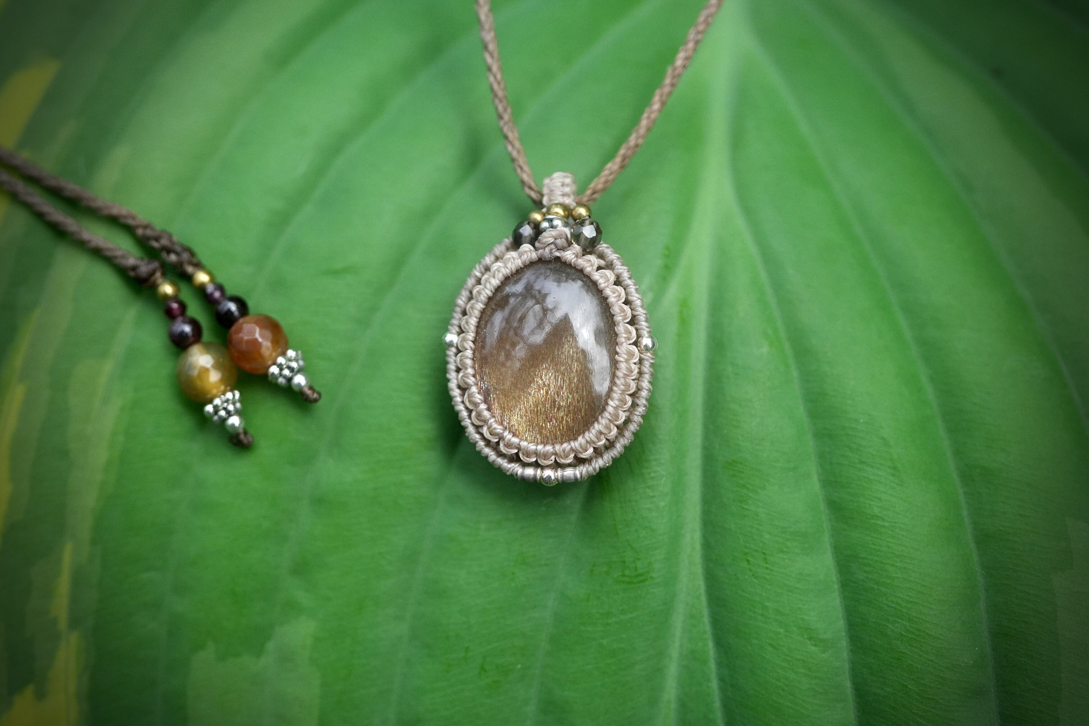 ◆このたびはキナリ、テディベアブラウン色の蝋引き糸を使用しマクラメ編み装飾を施しました。