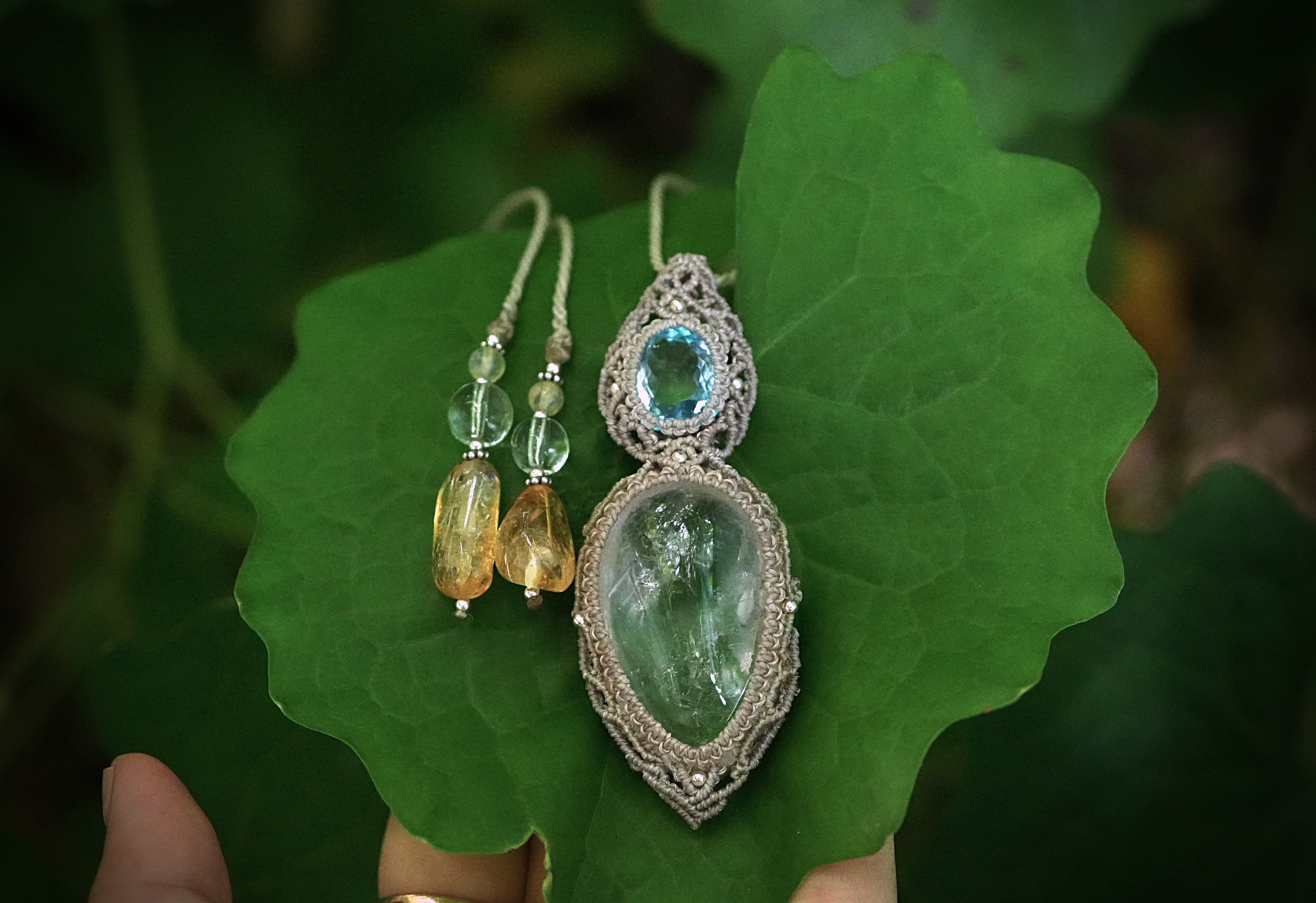 マクラメ編み装飾を全体に施し、植物と水と宝石とを連想させる..