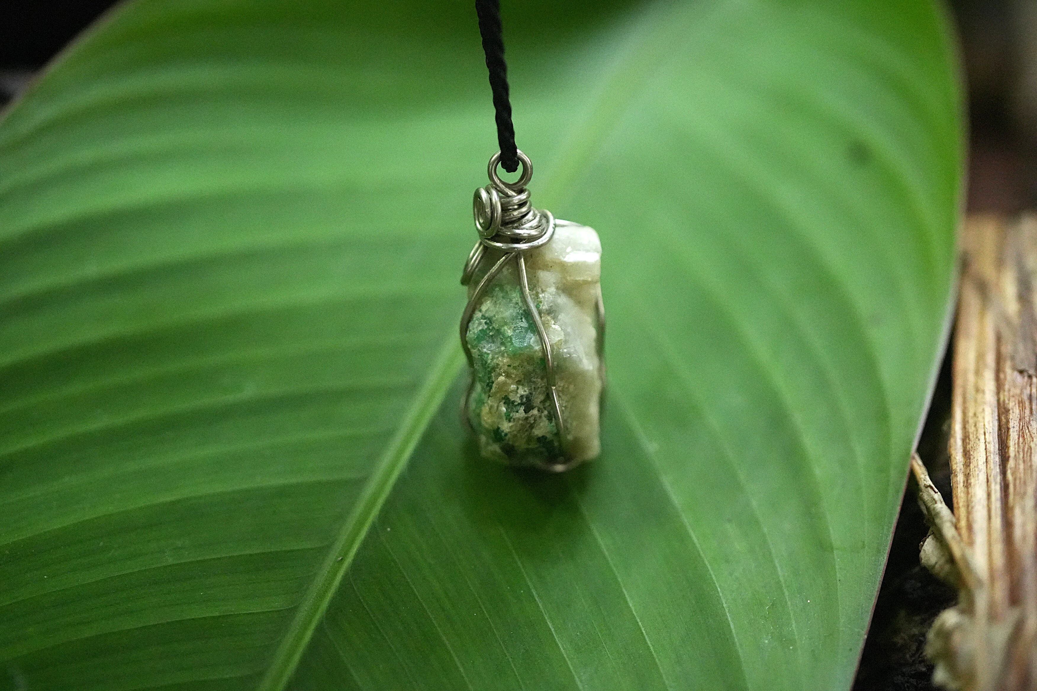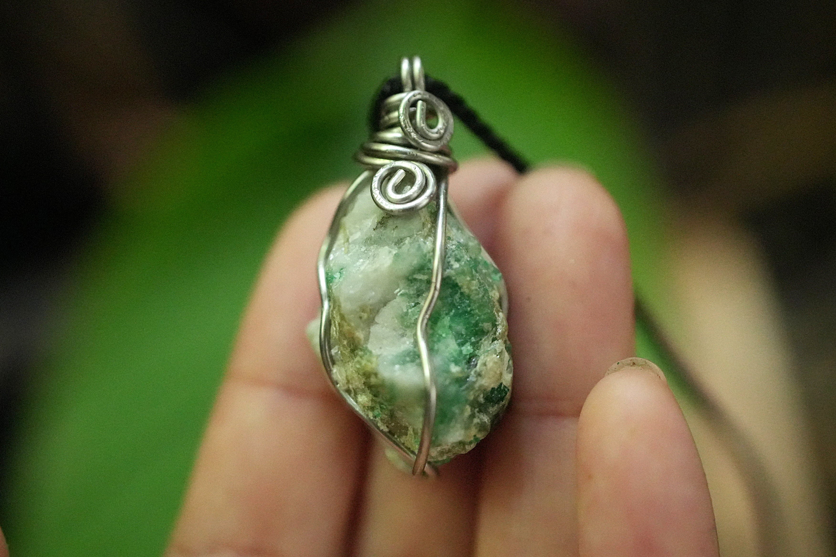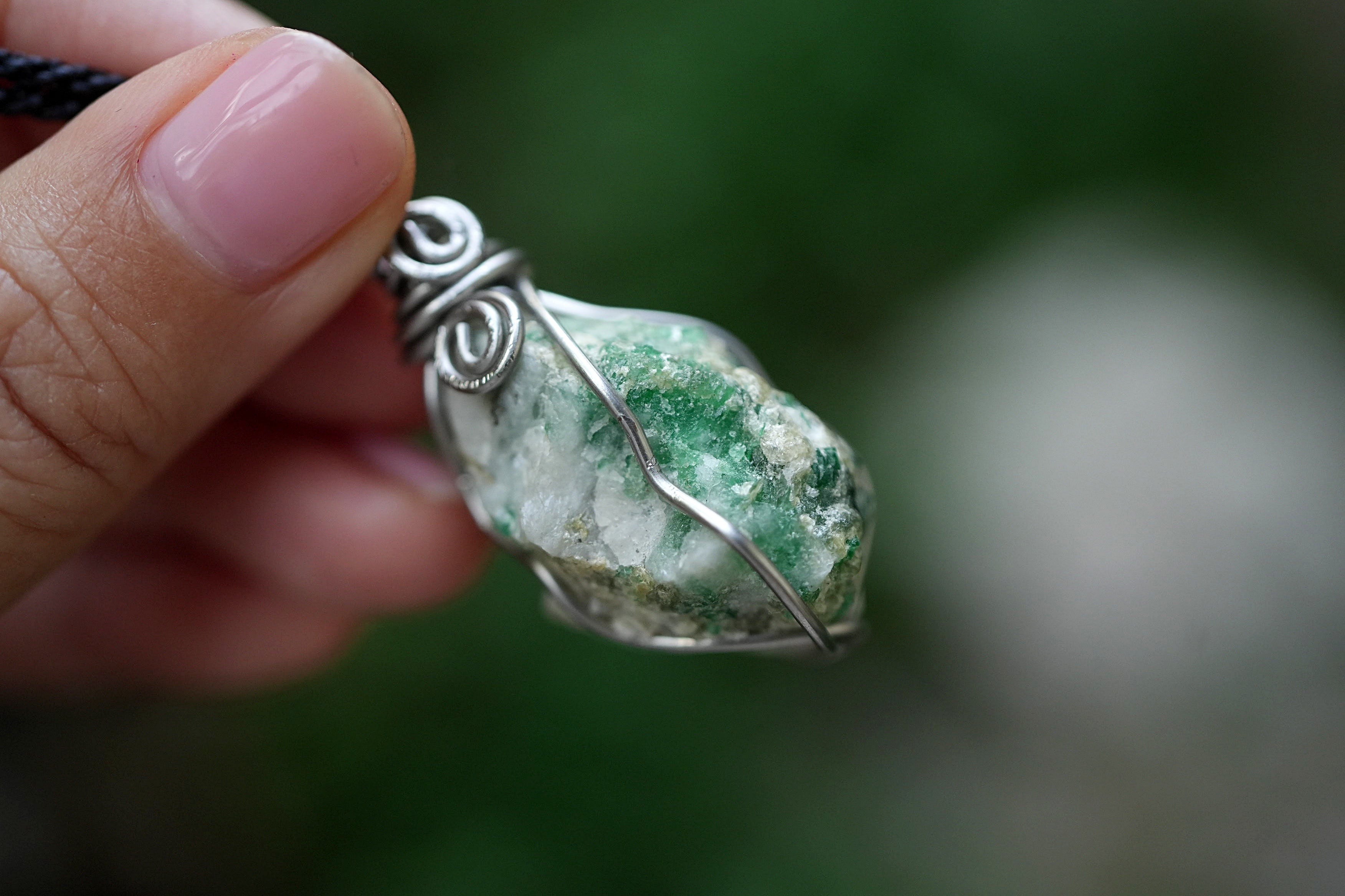 グリーンのエメラルド内包が入り込んだ原石にワイヤーワークを施した