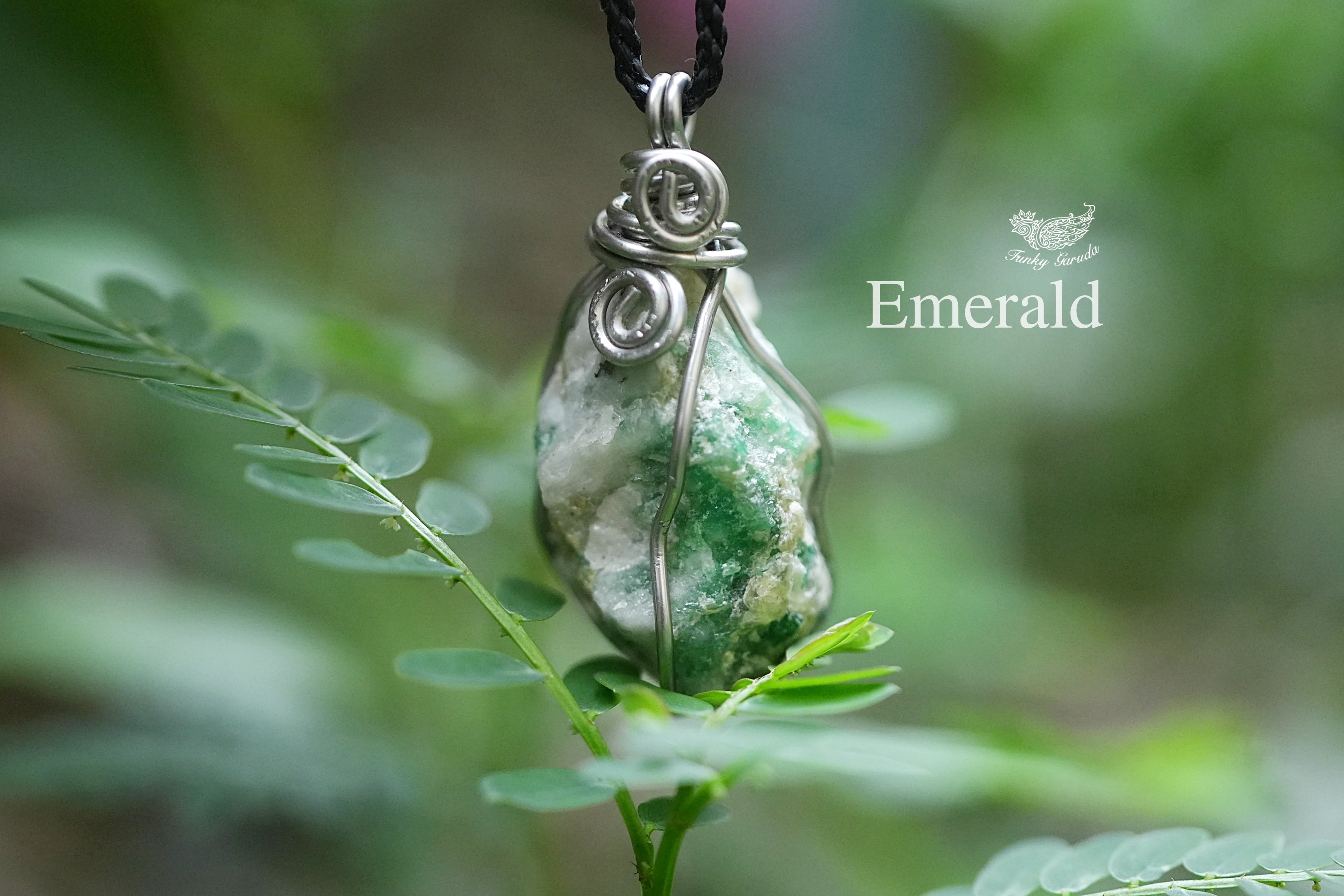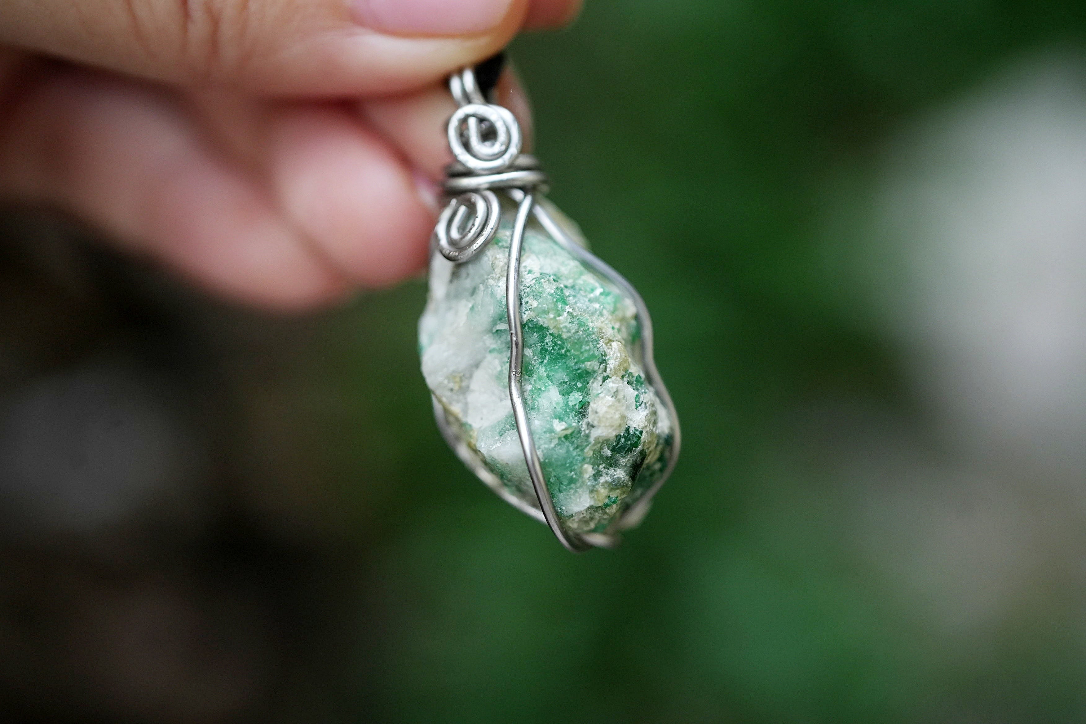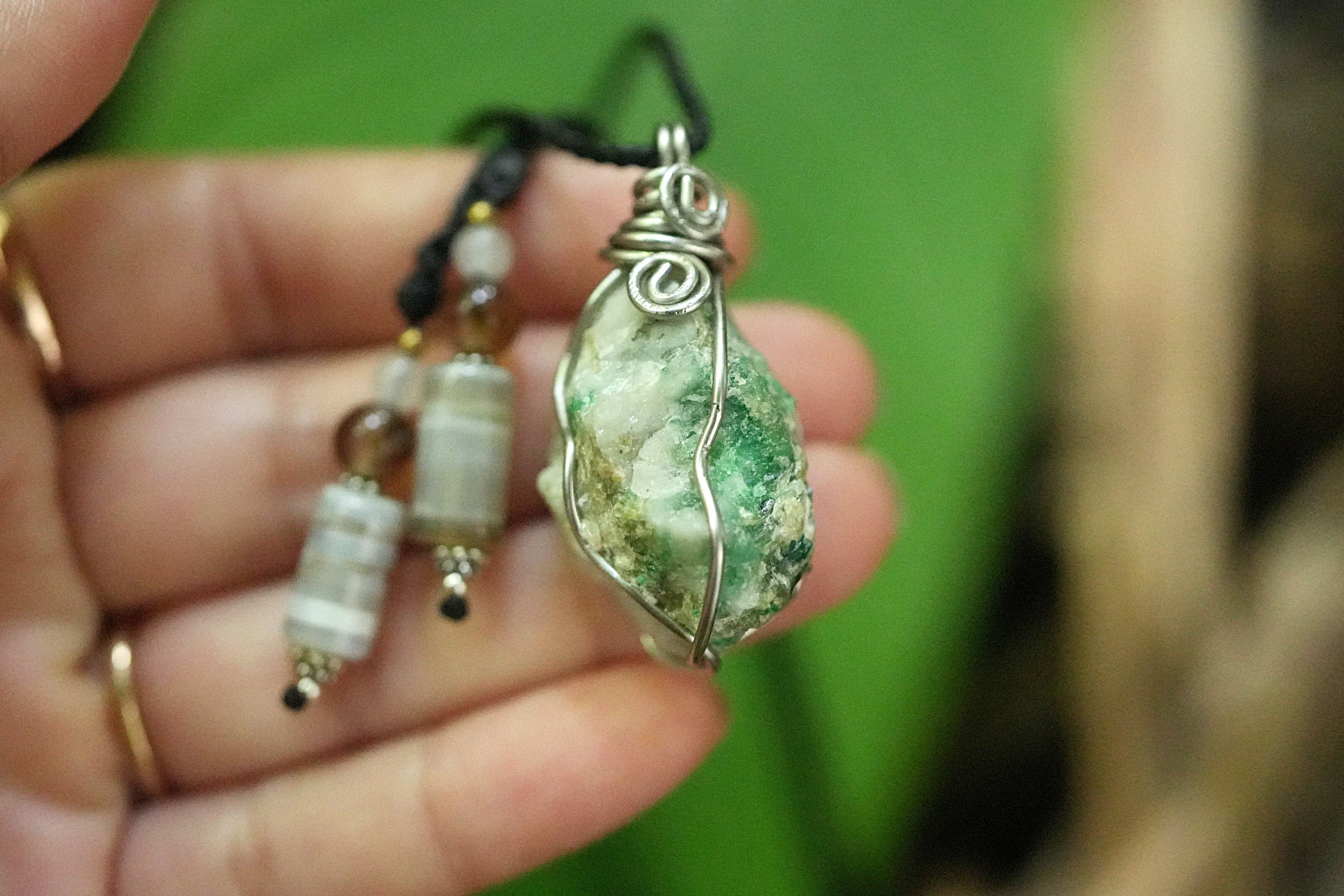 グリーンのエメラルド内包が入り込んだ原石にワイヤーワークを施した