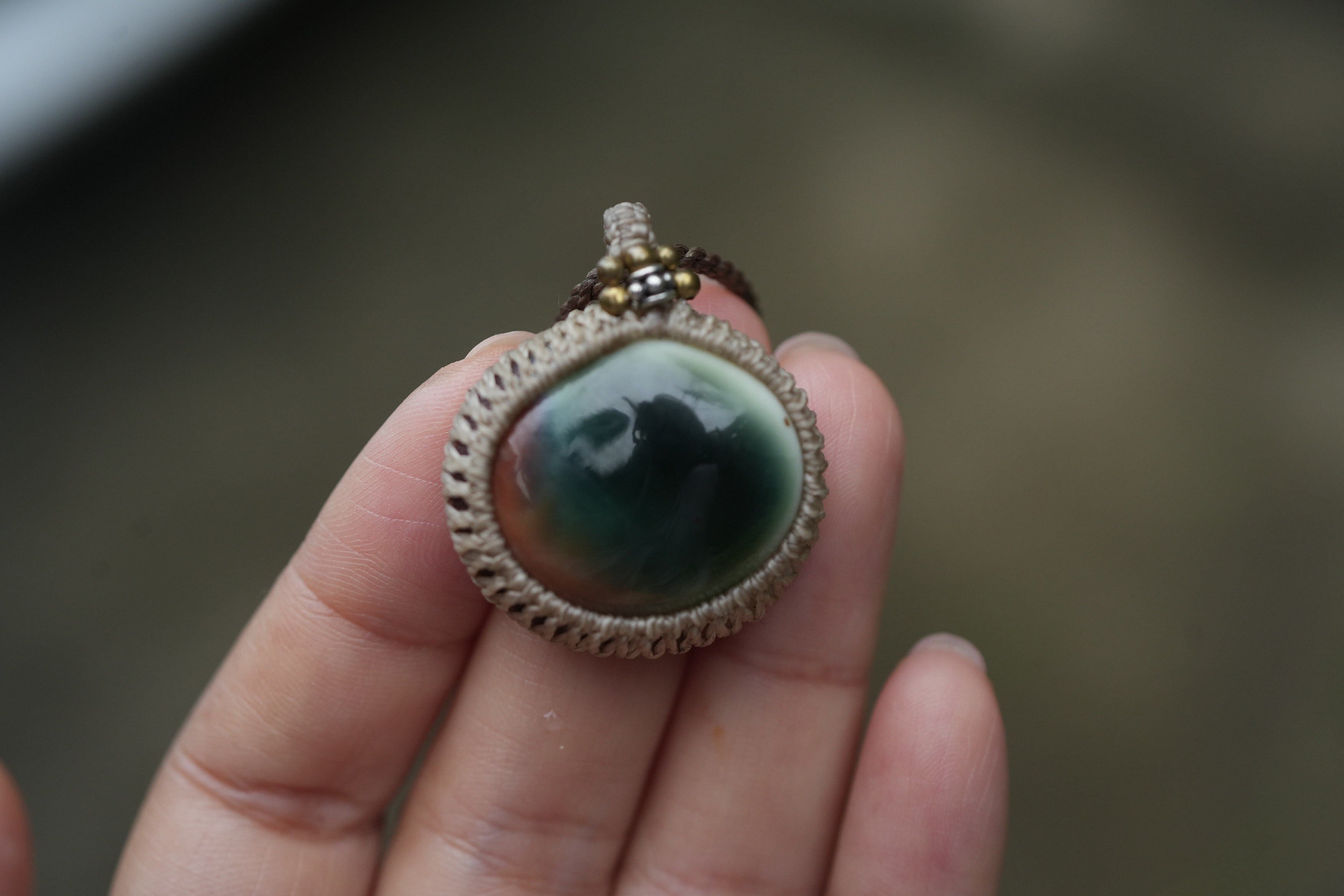 ◆このたびはキナリ、オリーブ色の蝋引き糸を使用しマクラメ編み装飾を施しました。