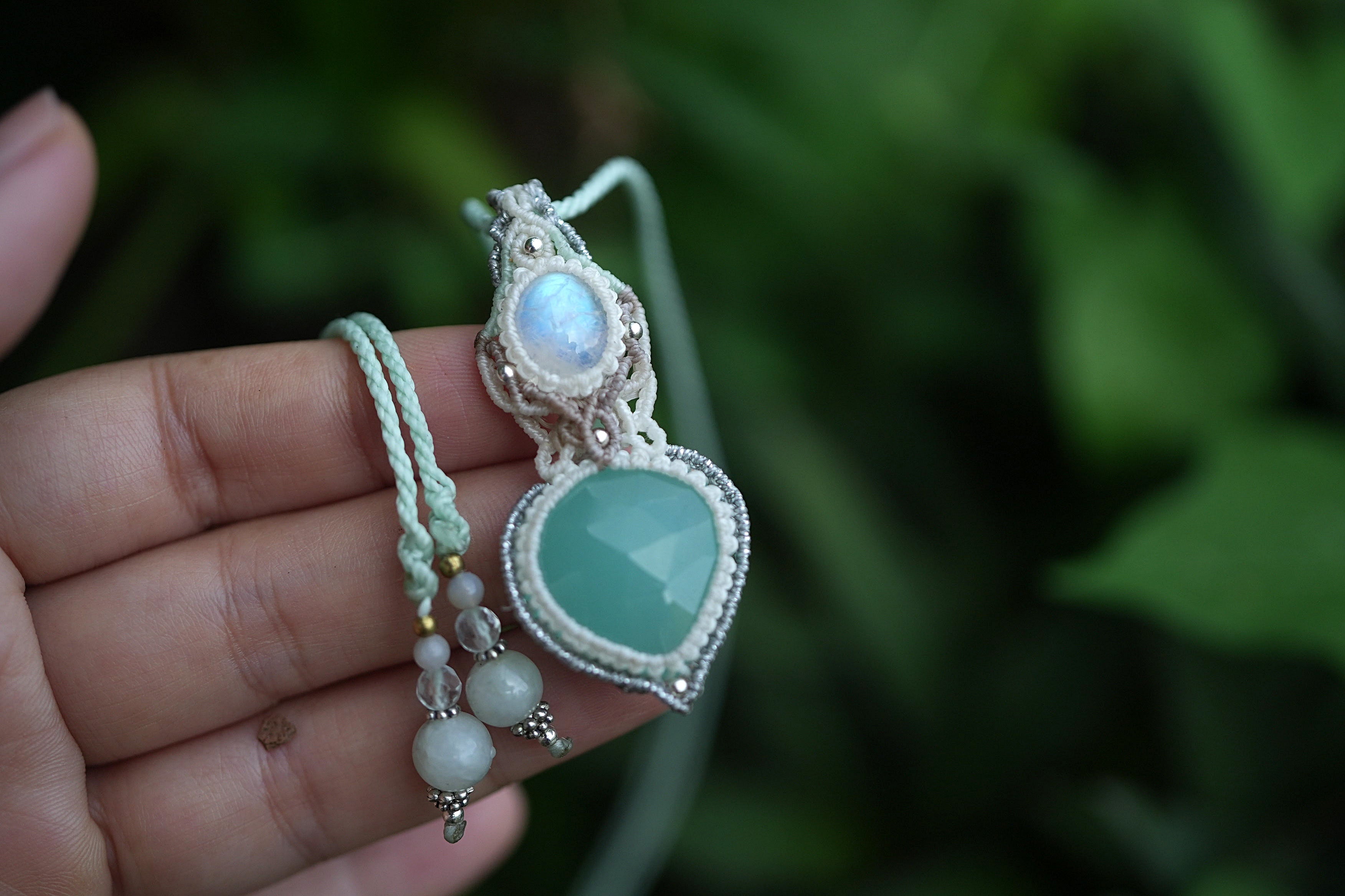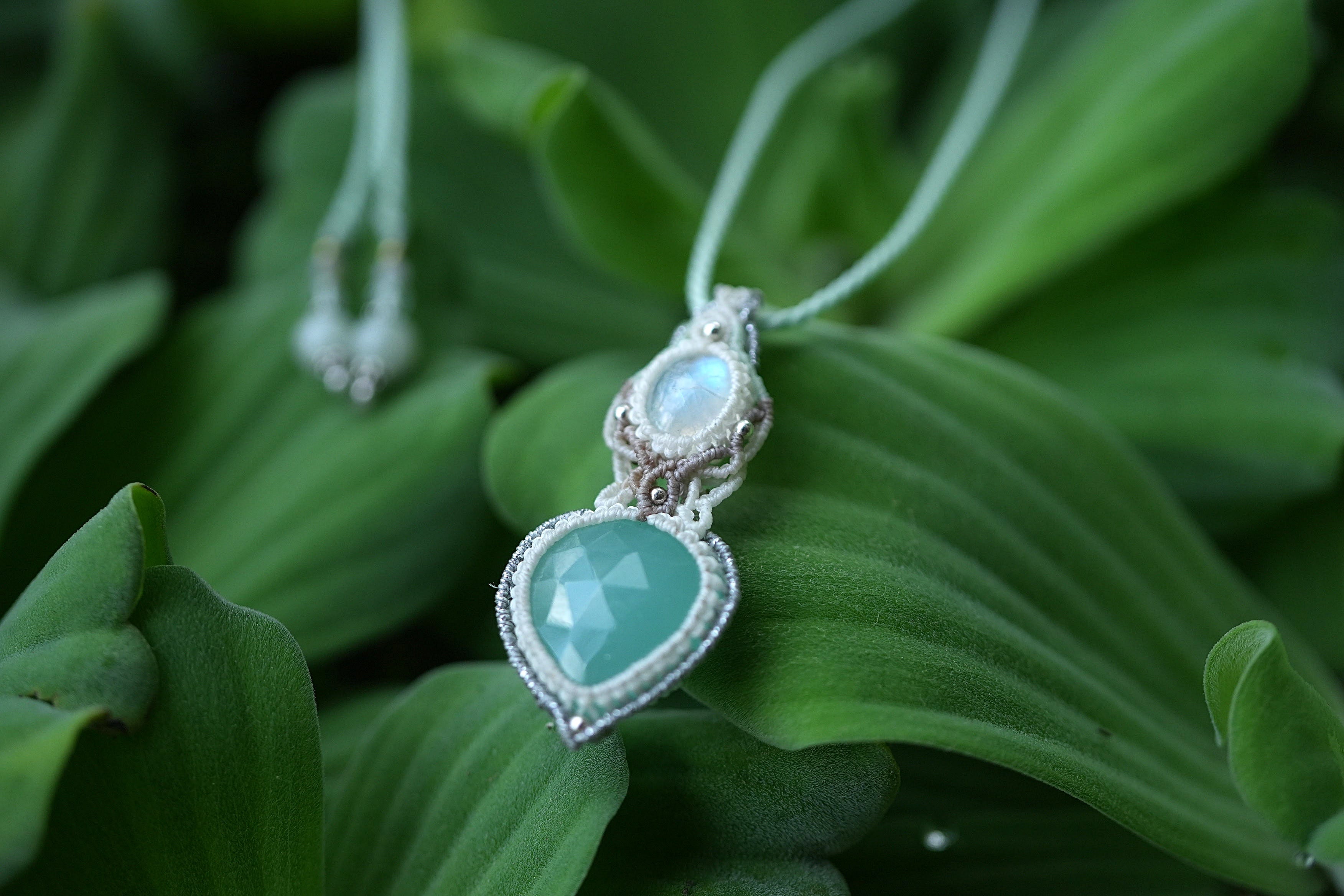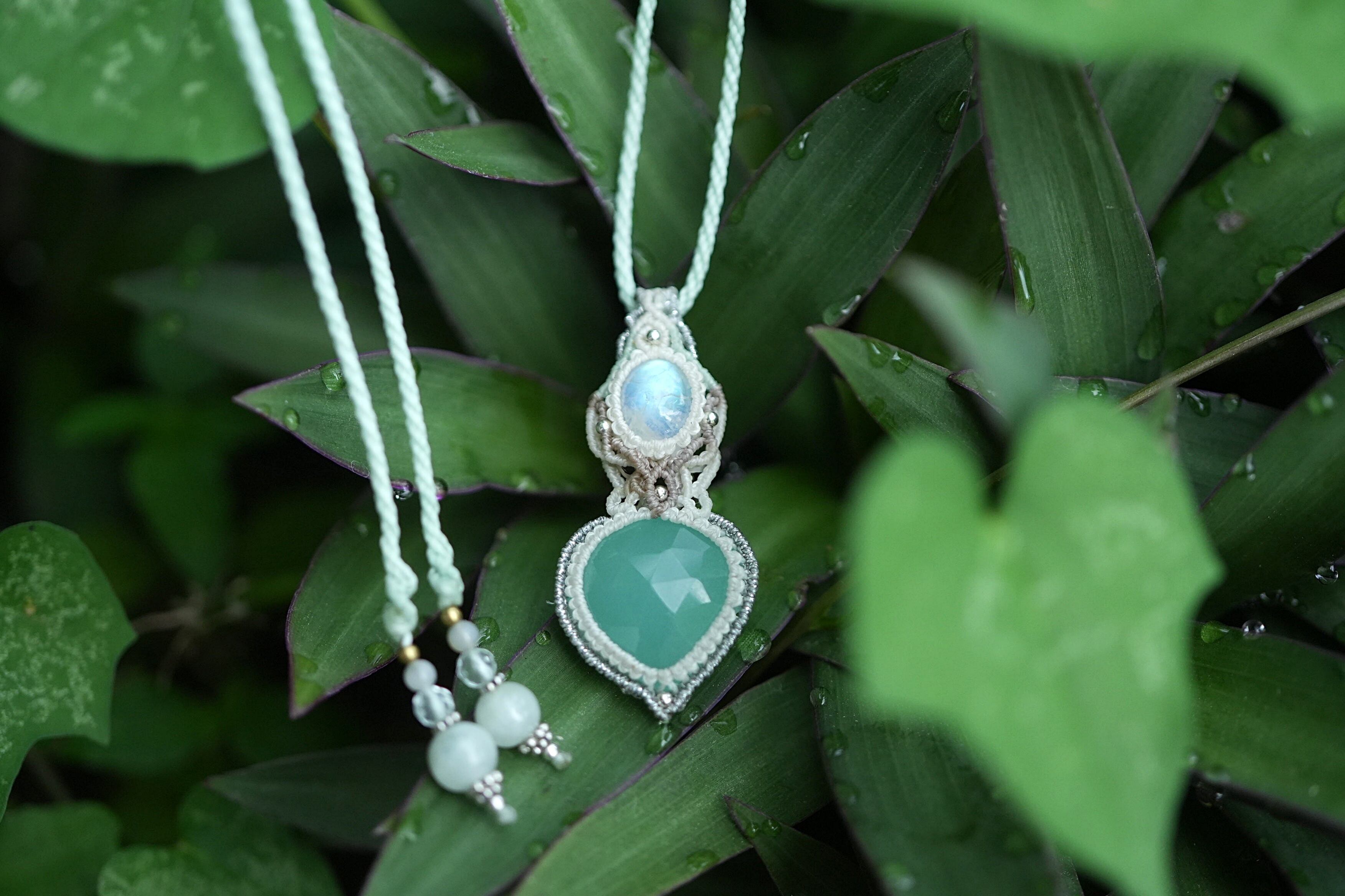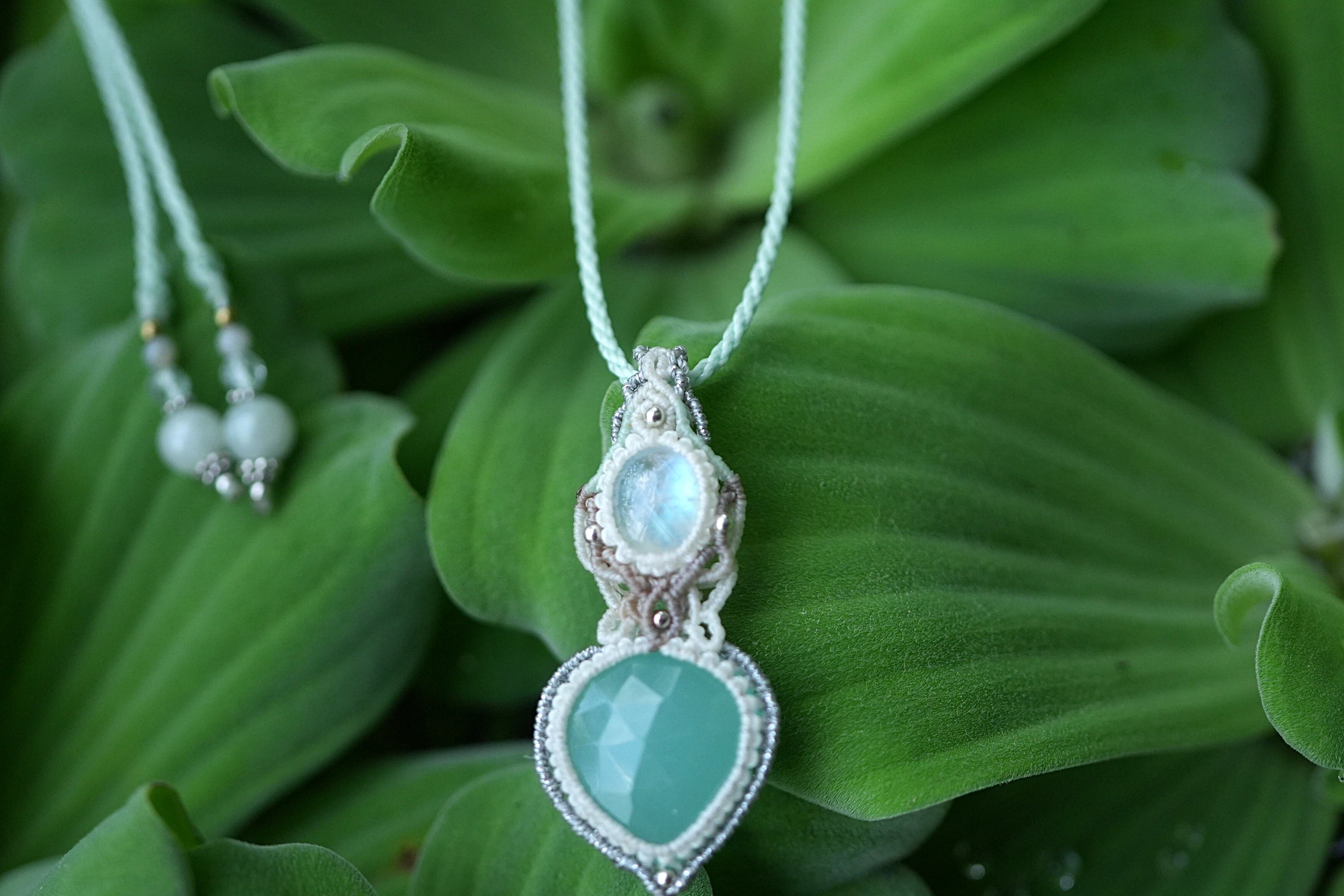 ミルキーなグリーンブルー★カット入りブルーカルサイト マクラメネックレス 1655
