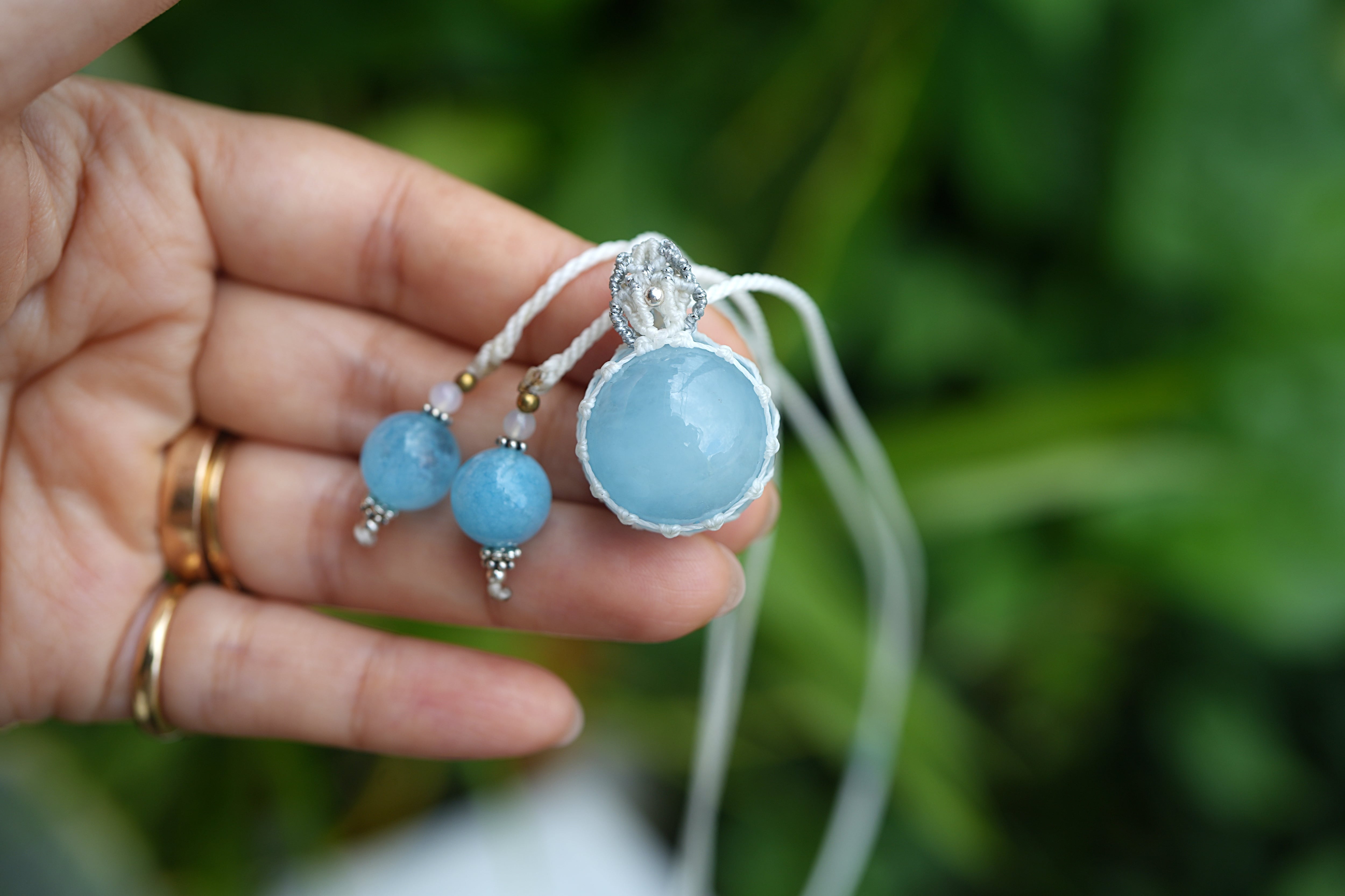 紐の先にも良質でお揃いの色 アクアマリンビーズを装飾して