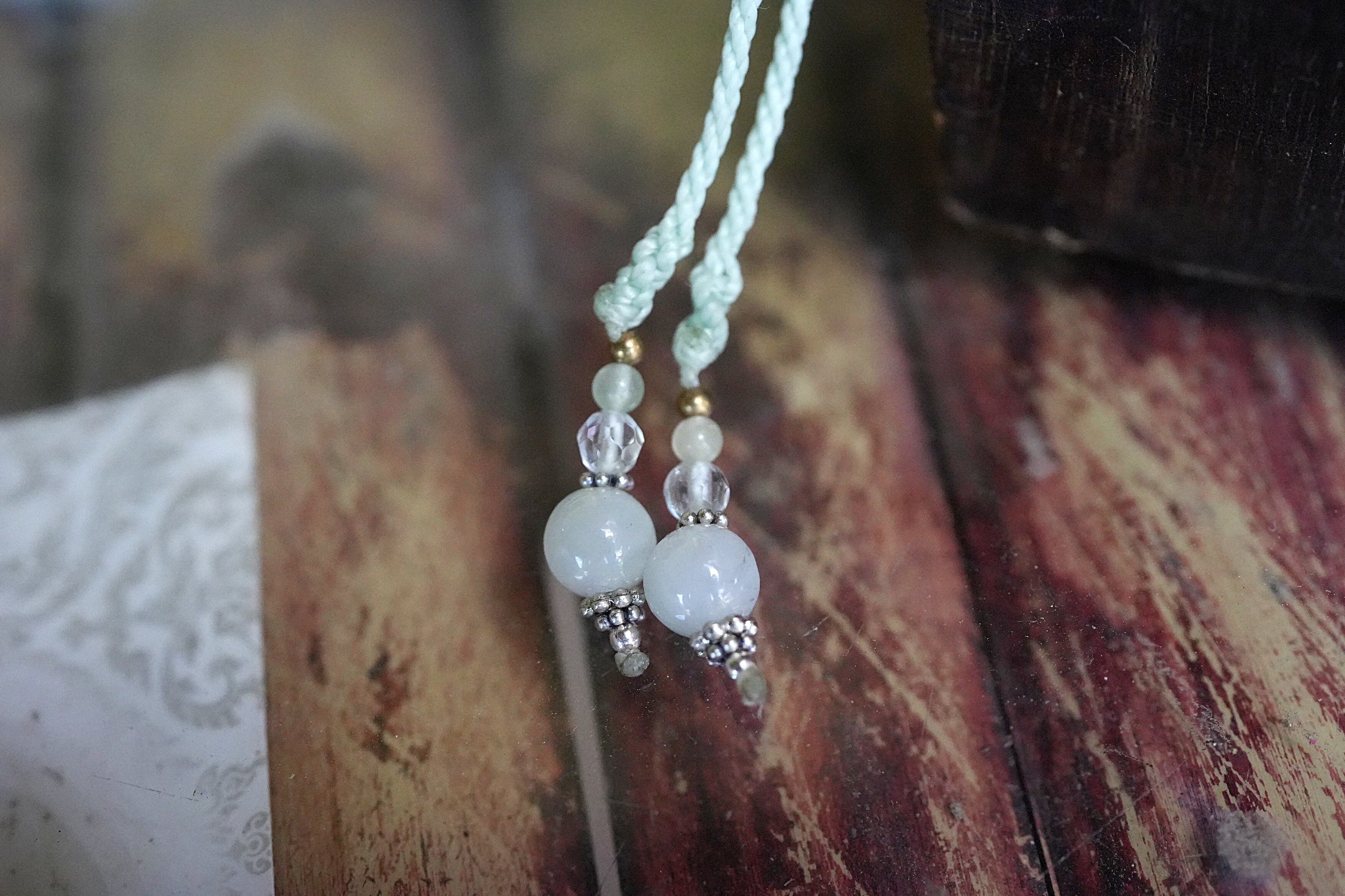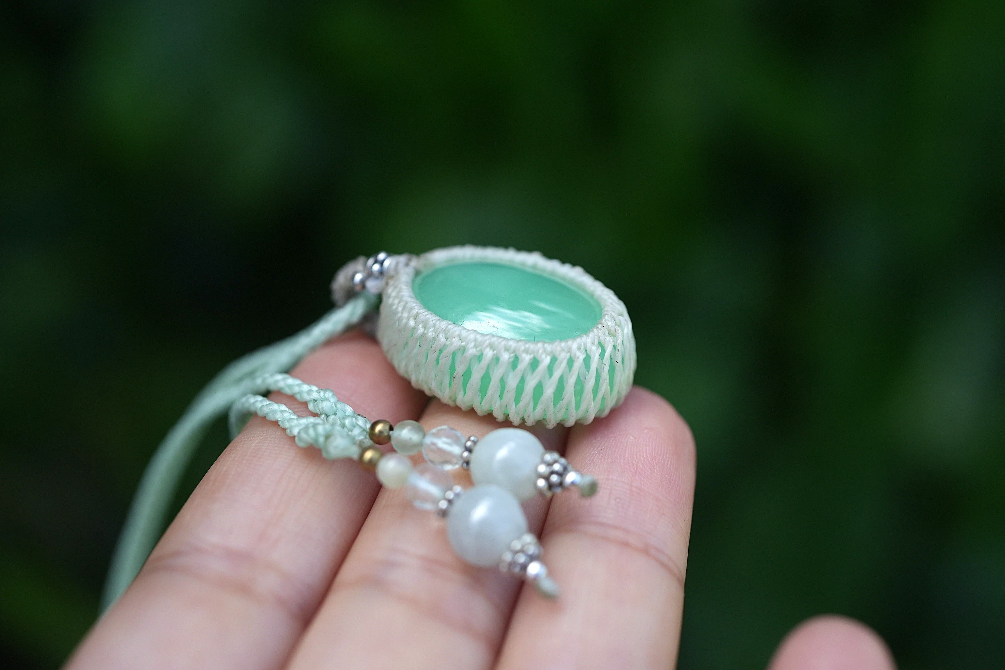 ◆このたびはホワイト、ミント色の蝋引き糸を使用しマクラメ編み装飾を施しました。