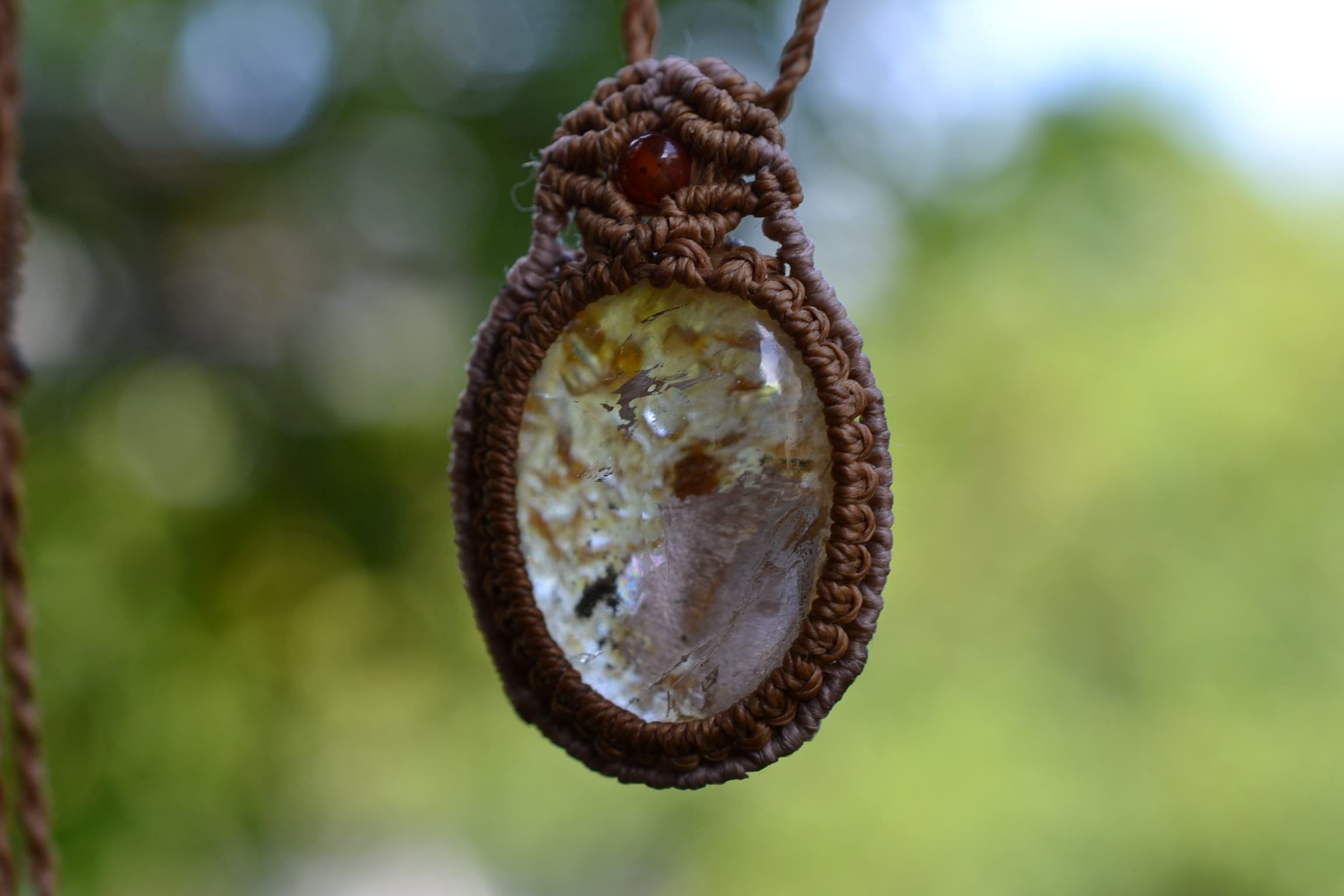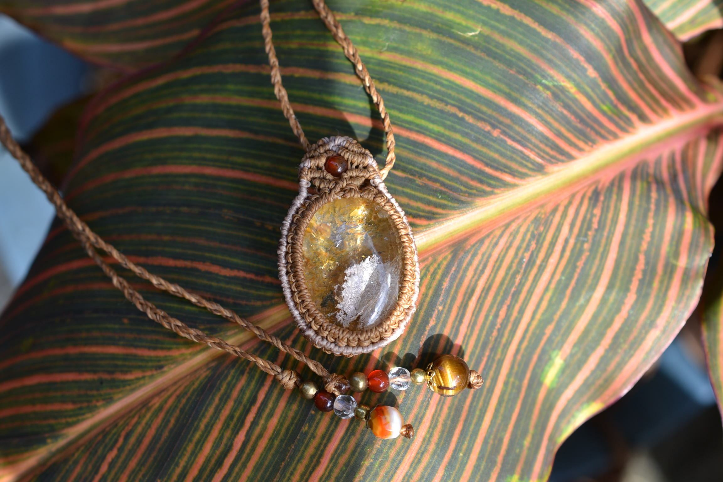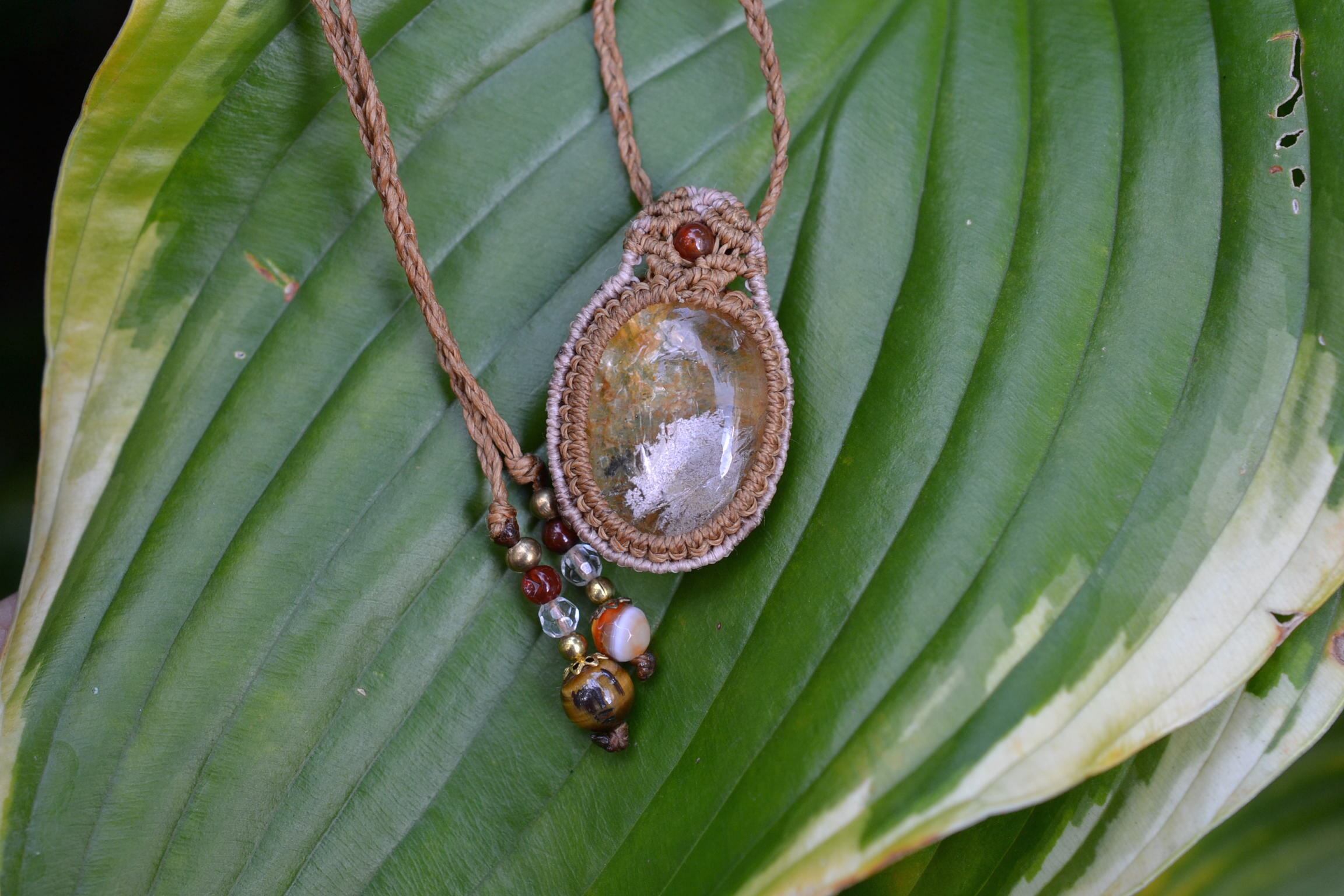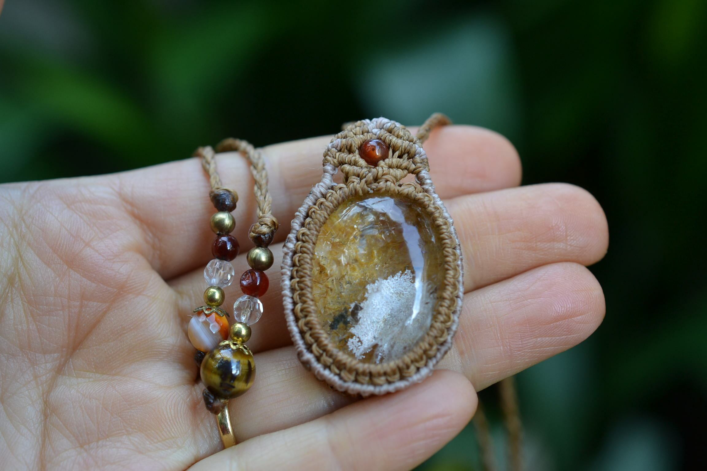 奥ゆきのある不思議なガーデンクォーツです。画像から見てとれるようにいろんな色と鏡のようなシラーが混じり合っており、このたびはこの石の色味をそのままマクラメ編み装飾しペンダントに仕上げました。