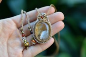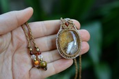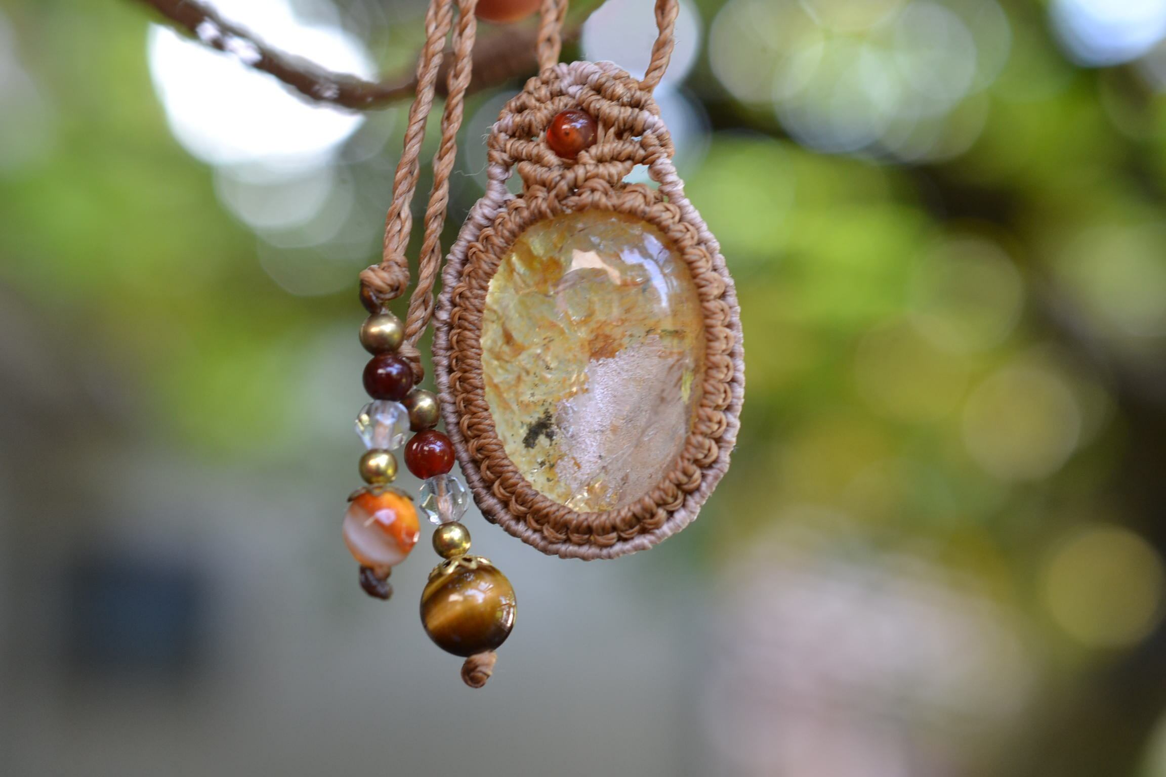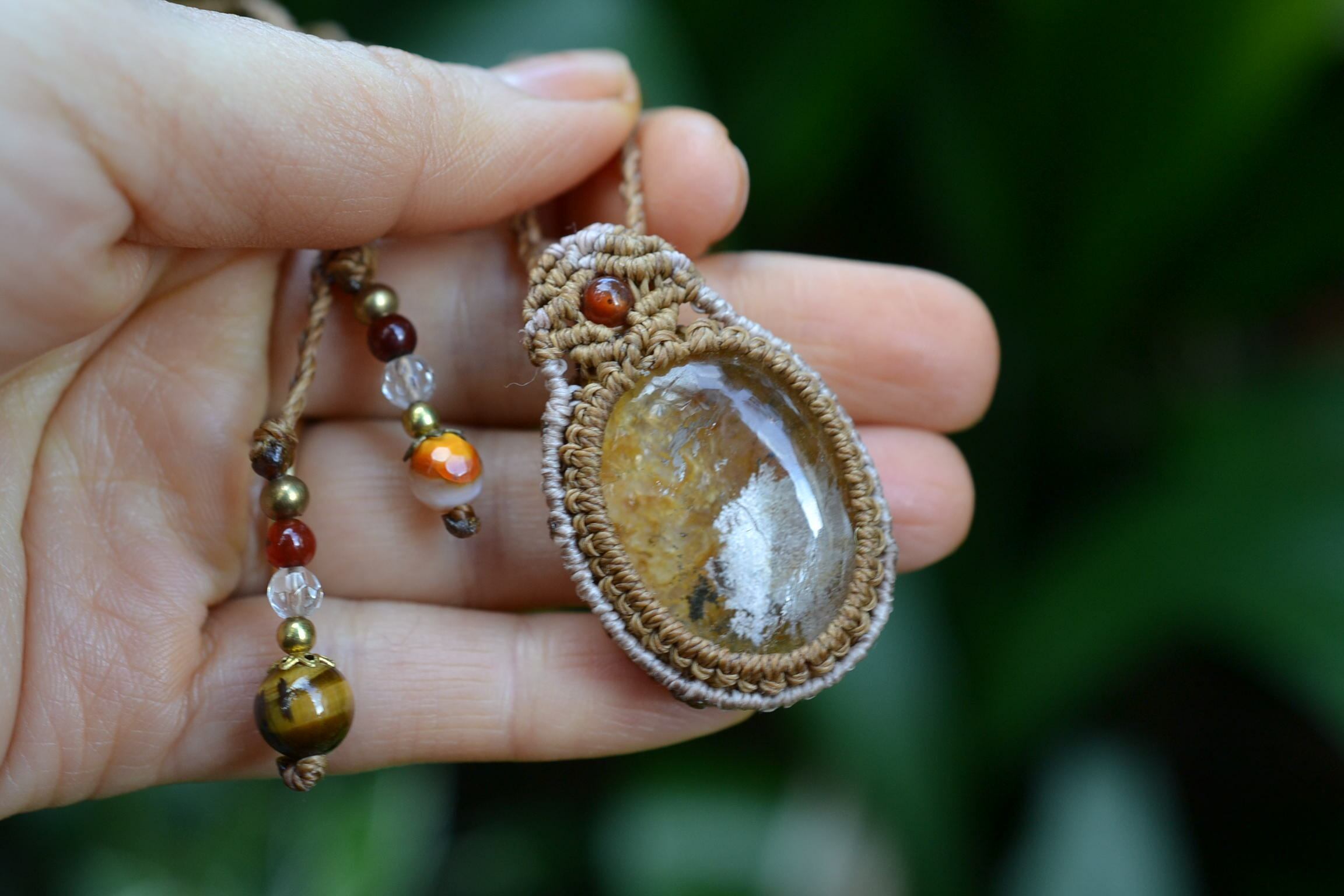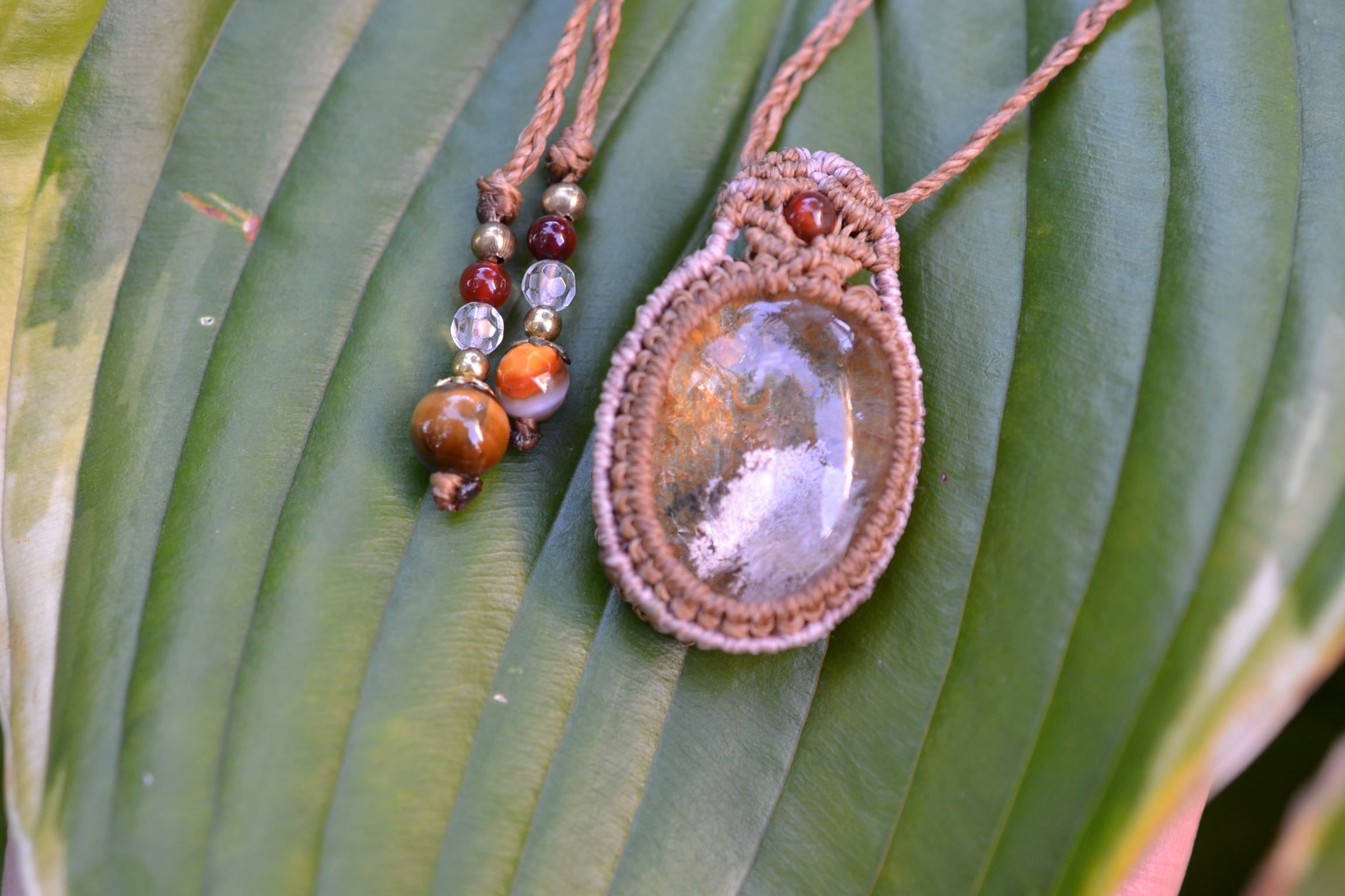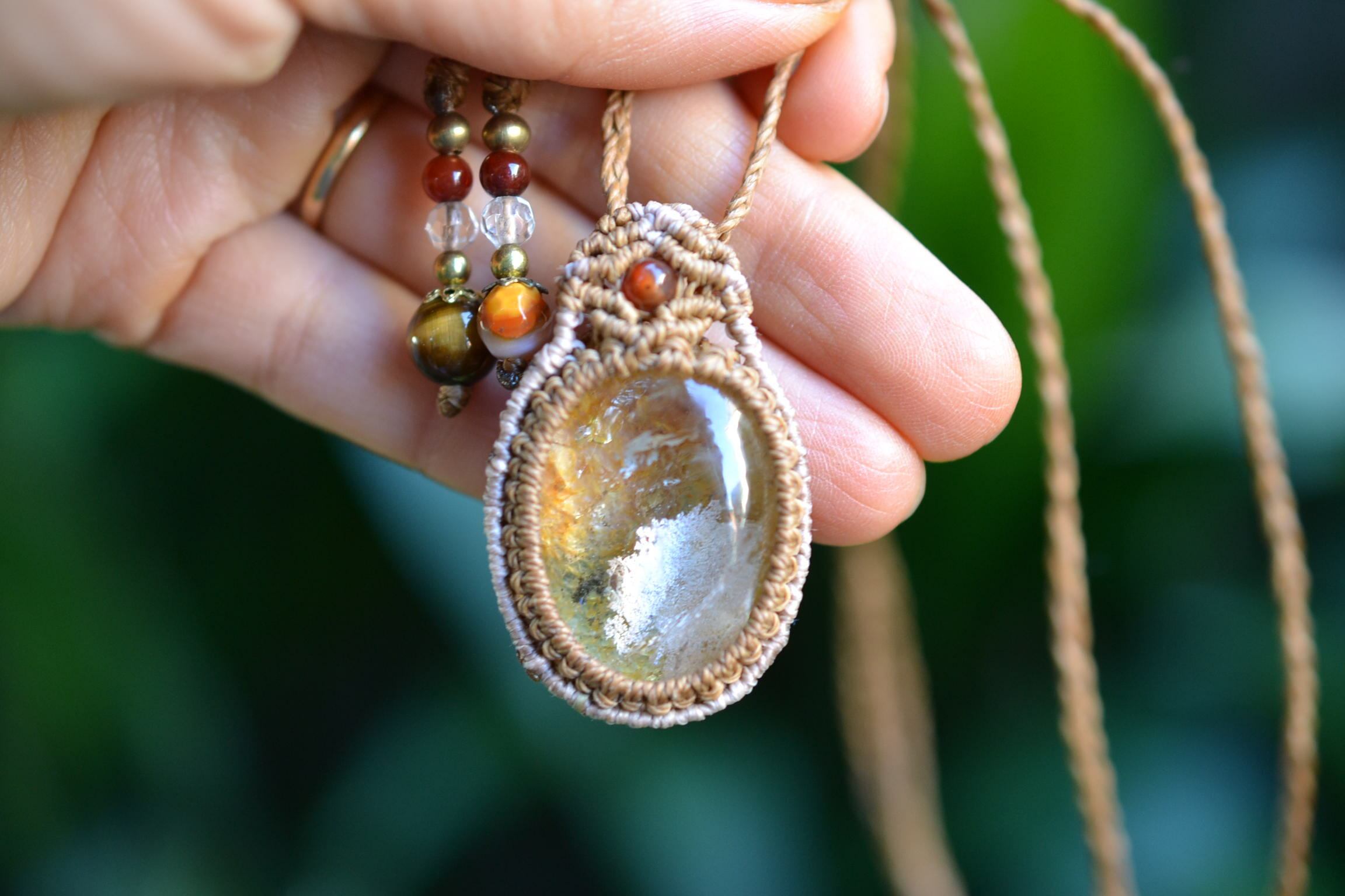 奥ゆきのある不思議なガーデンクォーツです。画像から見てとれるようにいろんな色と鏡のようなシラーが混じり合っており、このたびはこの石の色味をそのままマクラメ編み装飾しペンダントに仕上げました。