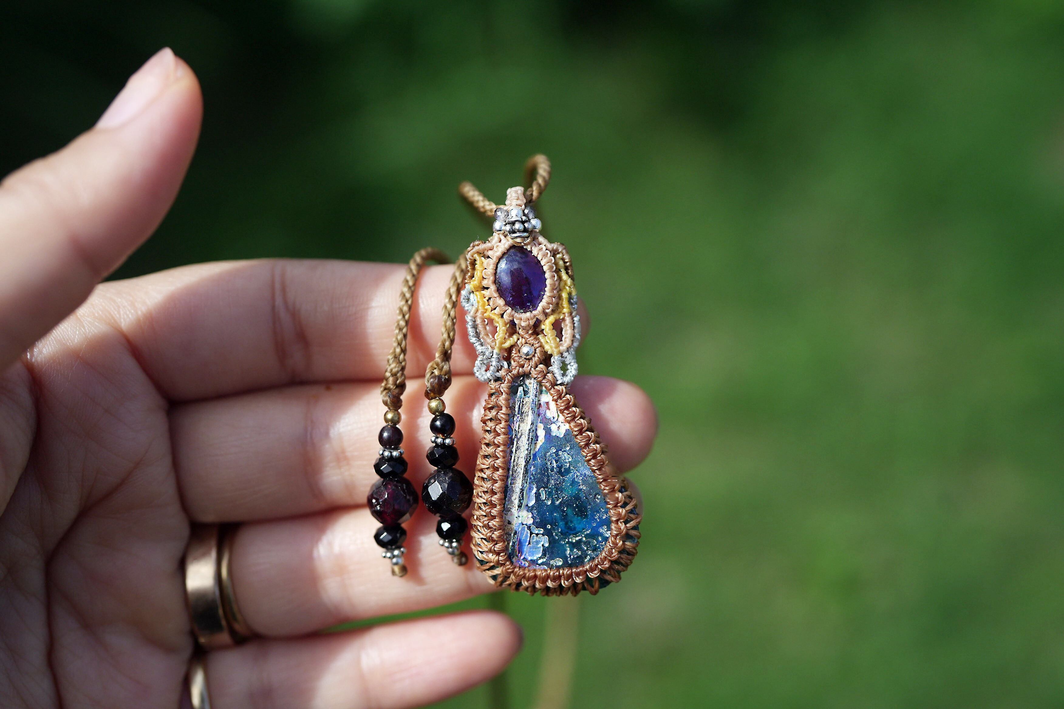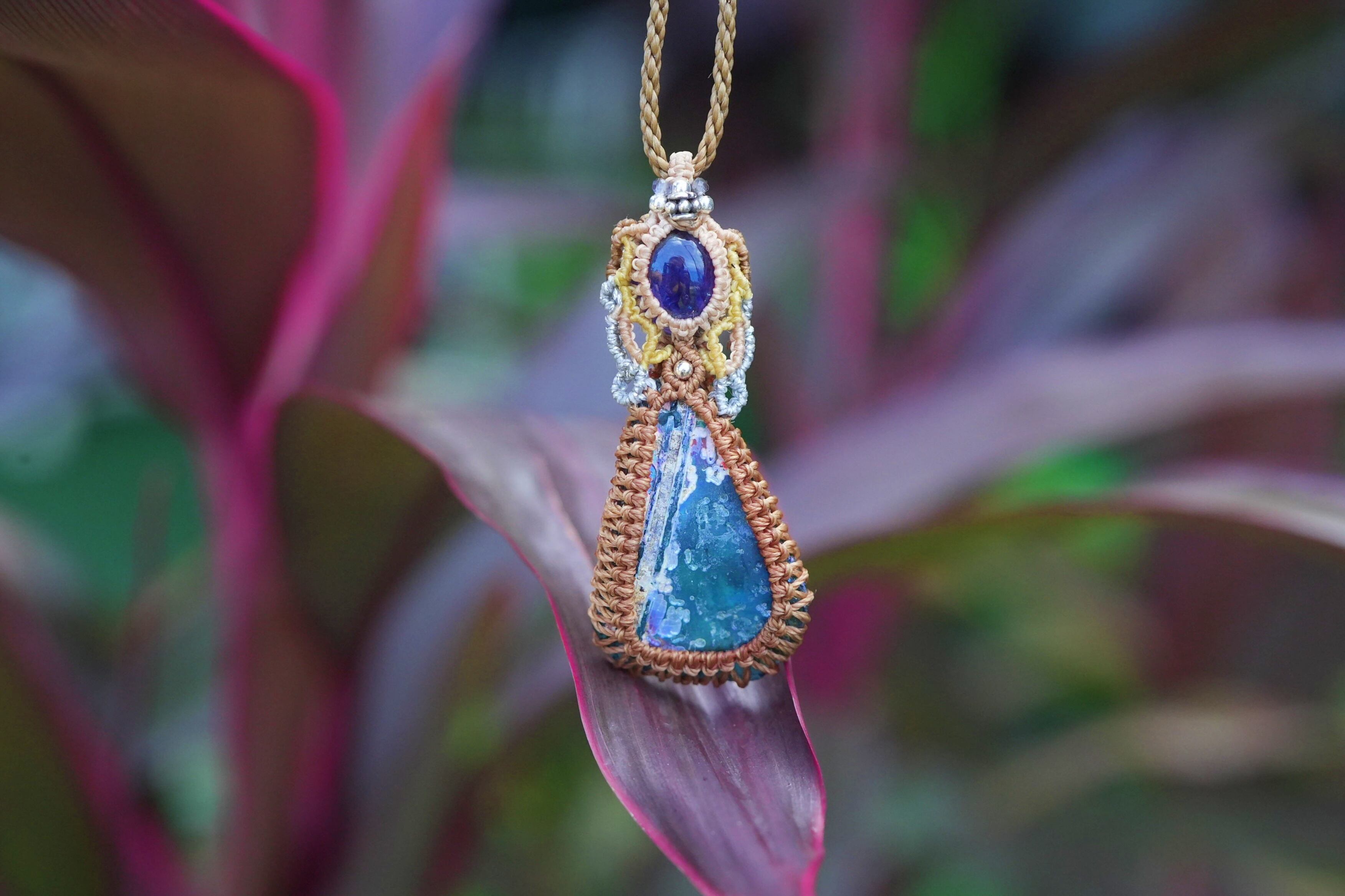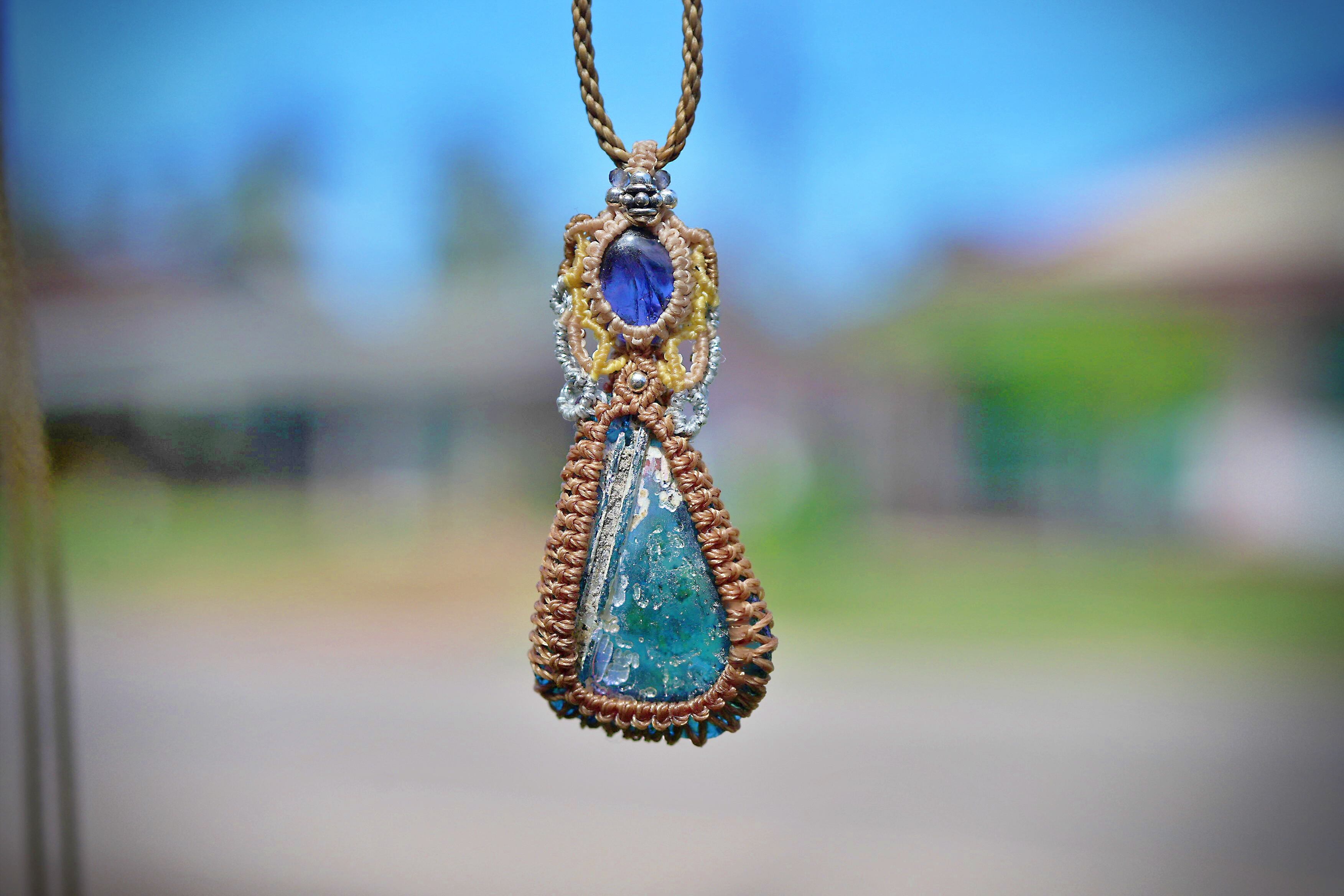 ◆このたびはゴールドブラウン、イエロー、シルバー色の蝋引き糸を使用しマクラメ編み装飾を施しました。
