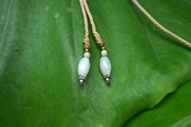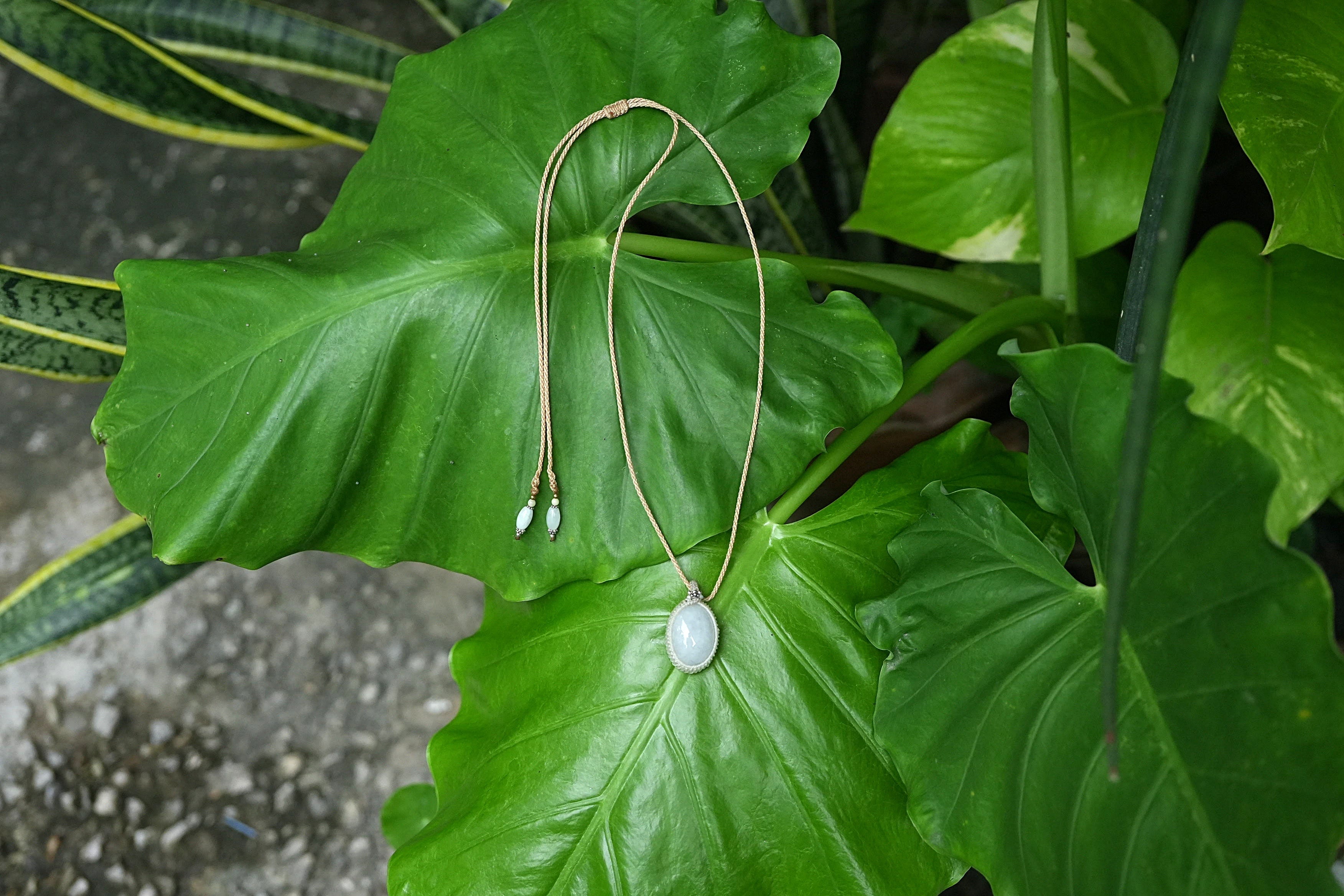 ◆このたびはナチュラルホワイト、キャラメル色の蝋引き糸を使用しマクラメ編み装飾を施しました。