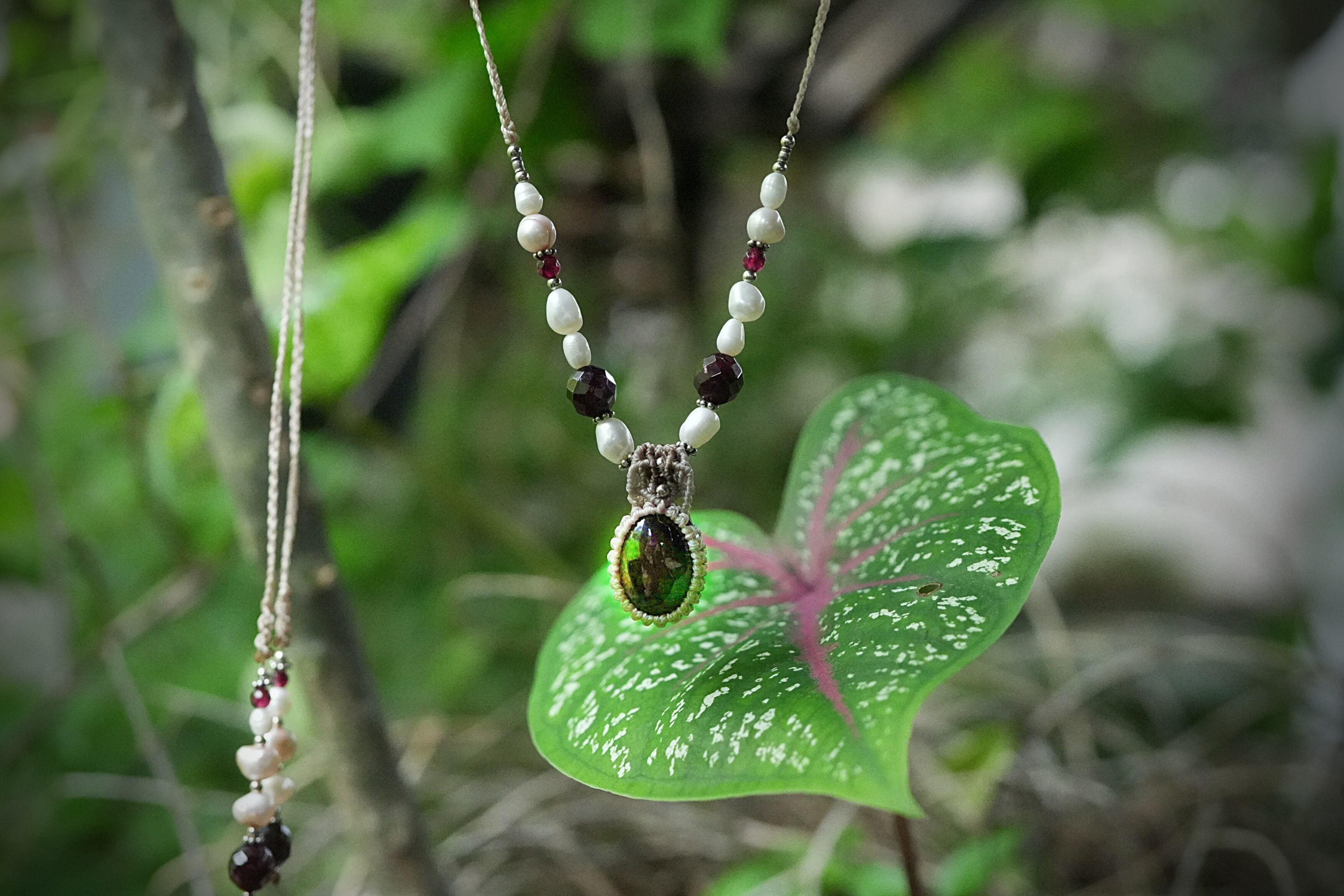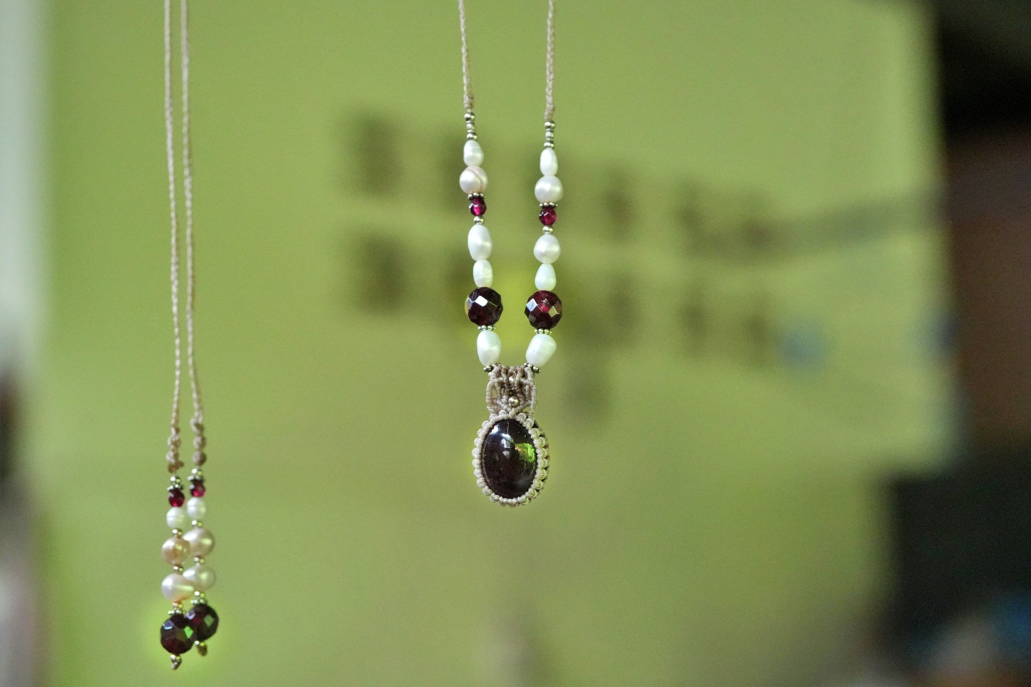 マクラメ編み装飾と天然ビーズを掛け合わせた