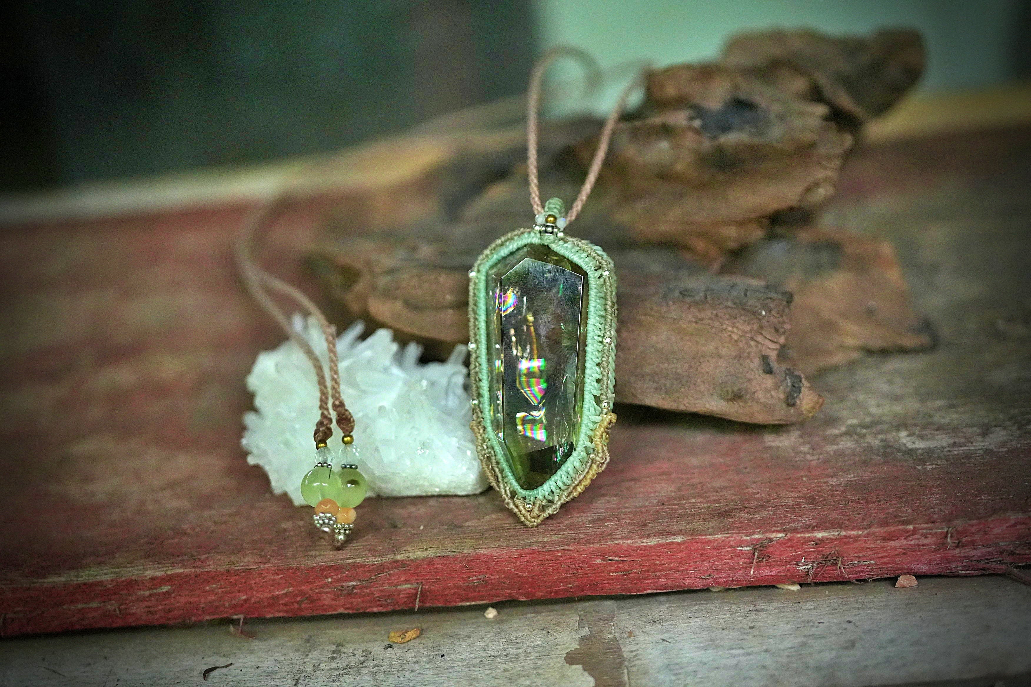 シルバービーズをアイキャッチに原石の周りをマクラメ編み装飾。