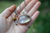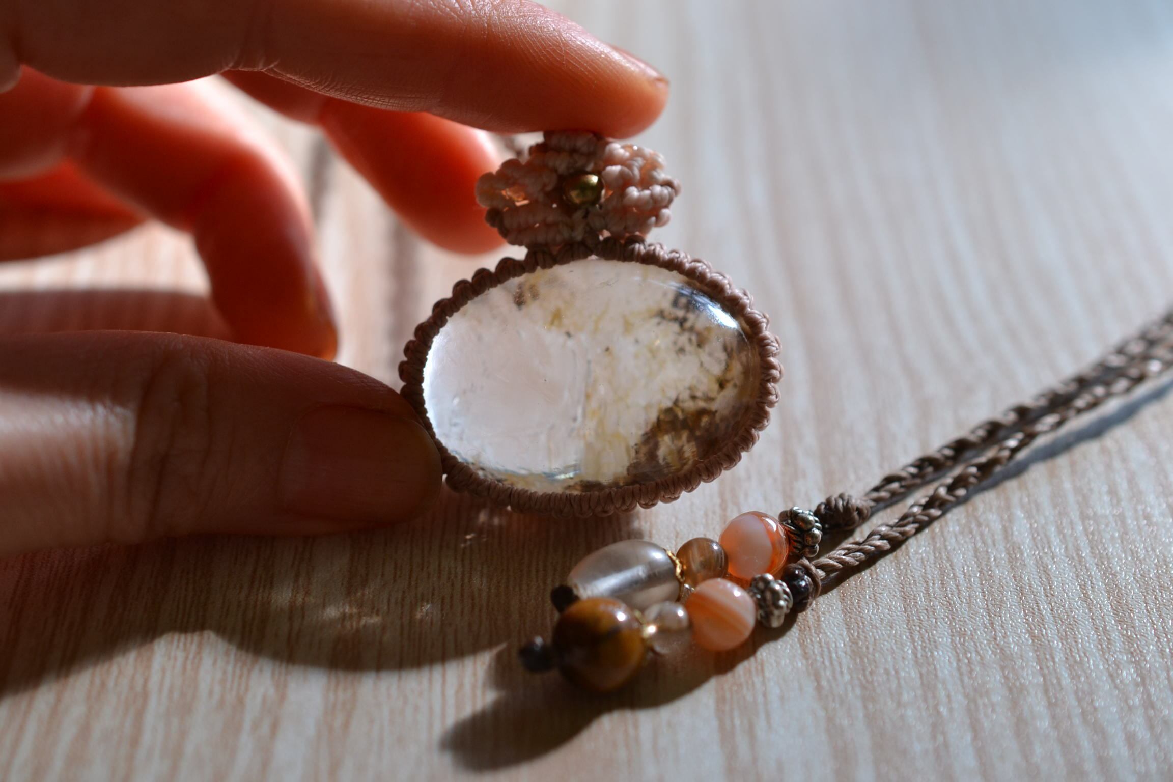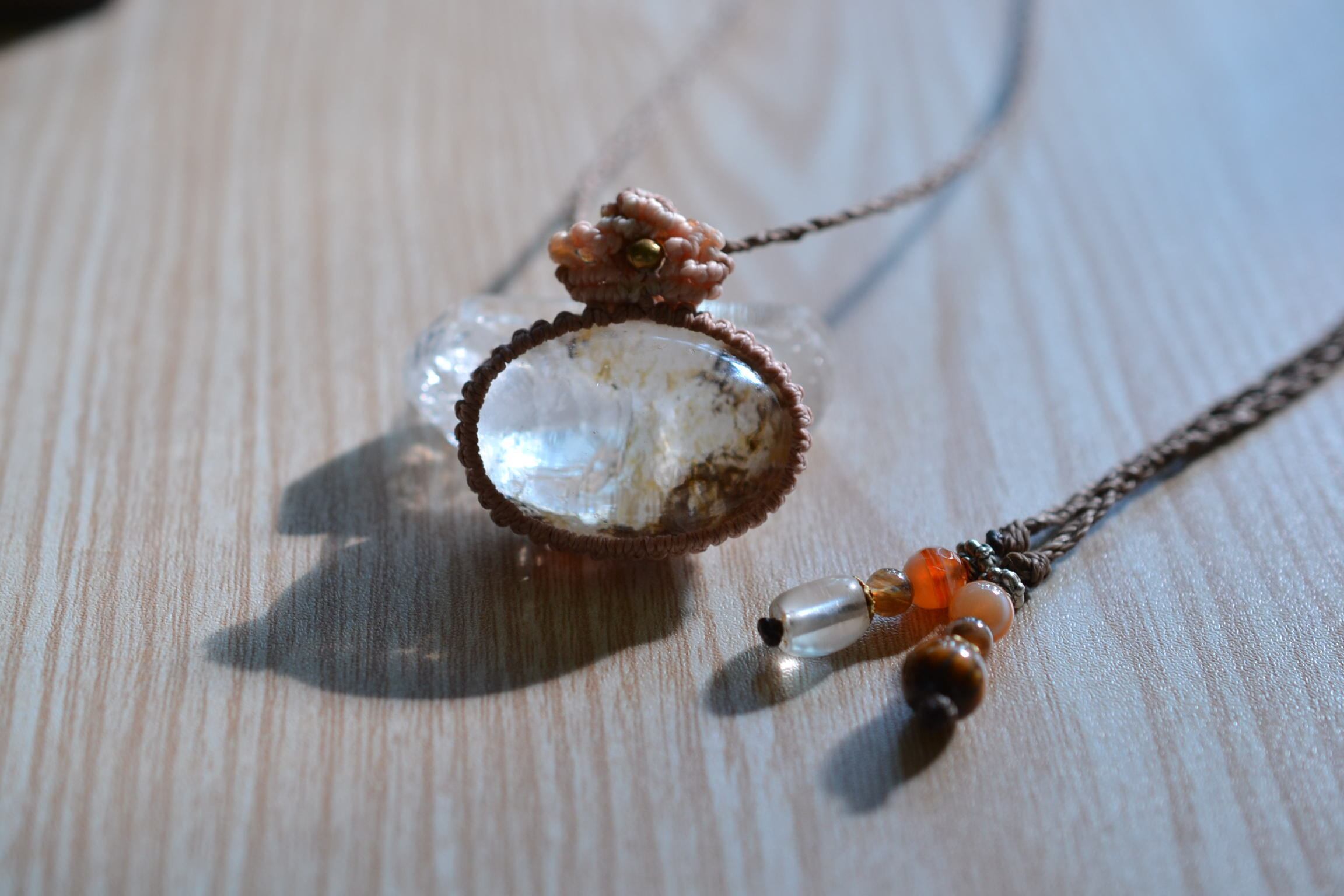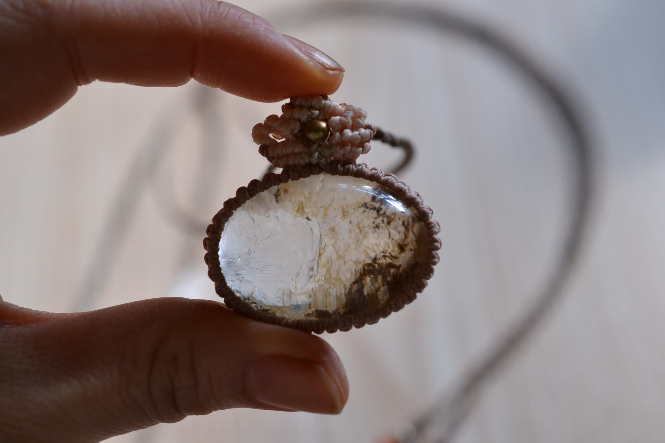 このたびのガーデンクォーツはとろけて溢れんばかりの涙のようにツヤツヤの水晶の中に大地の揺らぎのようにも見えるガーデン水晶の模様がとてもユニークなひとつぶです。石の中に見える色味に合わせて、蝋引き糸を使用し、ペンダントに仕上げました。厚みある水晶がどこか懐かしくもあり、美しい石です。