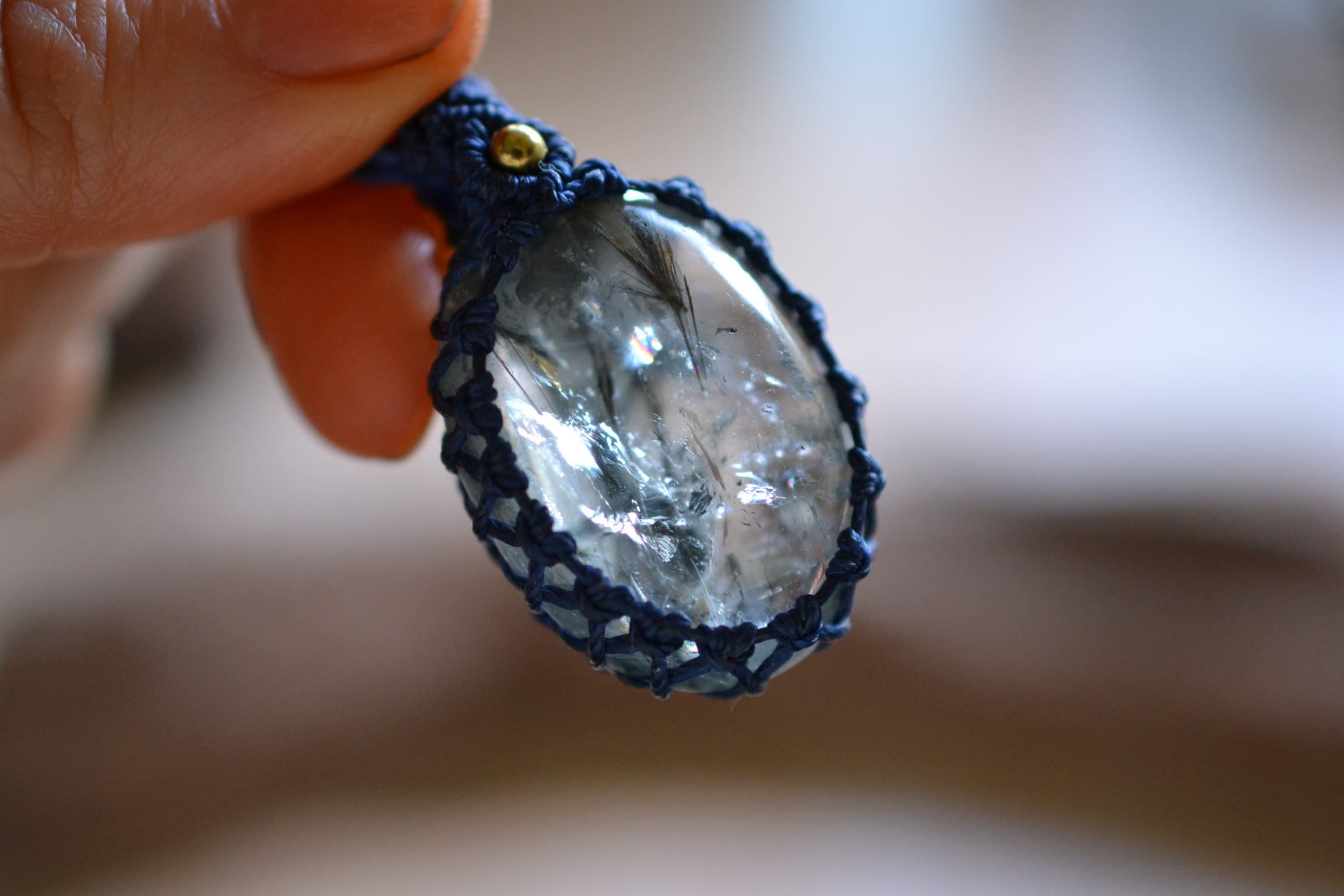 石を手にしてみるといろんな断面からのシラーに虹をみることができます。小さな虹の流星と針水晶がこの石の奥行きをきちんと表現してくれています。